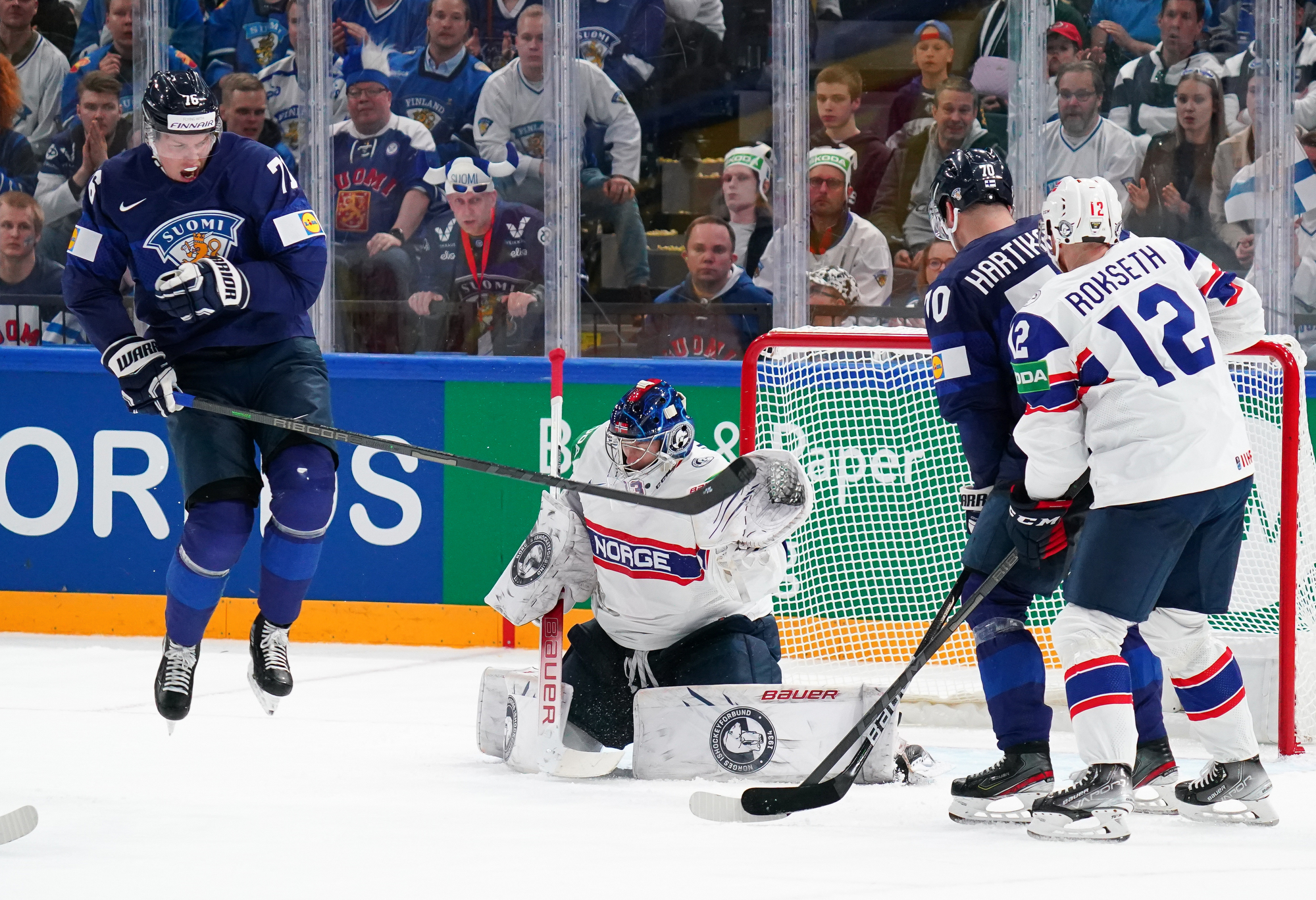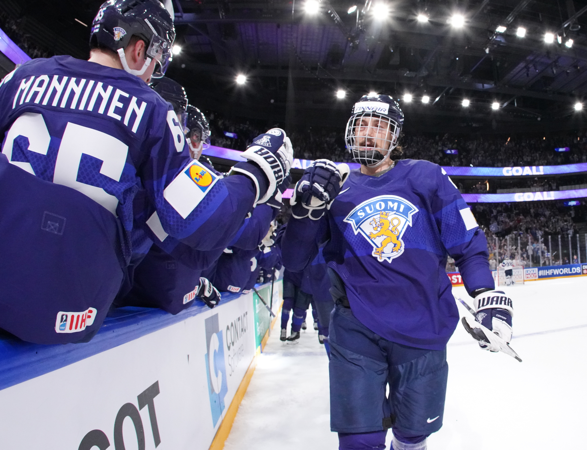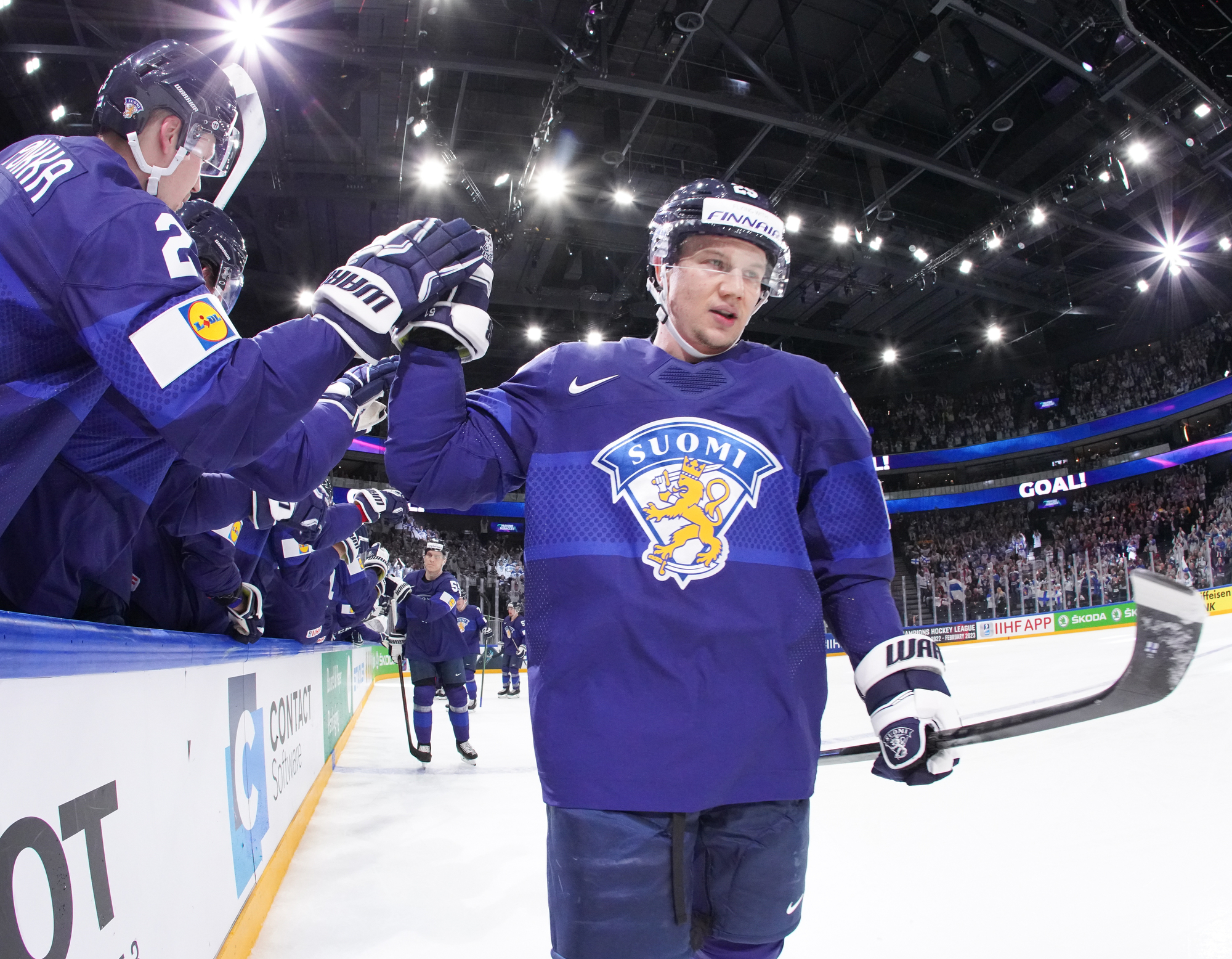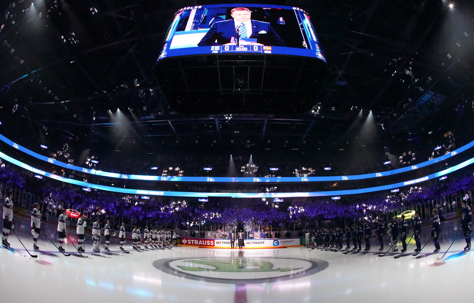 Roused by a rocking rendition of Finland’s national anthem, the 11,413 fans in the Tampere crowd were ready to roll. Impressive coordination among the fans saw much of the lower bowl uniformly dressed in Finland 2022 commemorative jerseys; white-fronted with blue shoulders, they produced a strikingly frothy effect when the wave swirled around the arena.