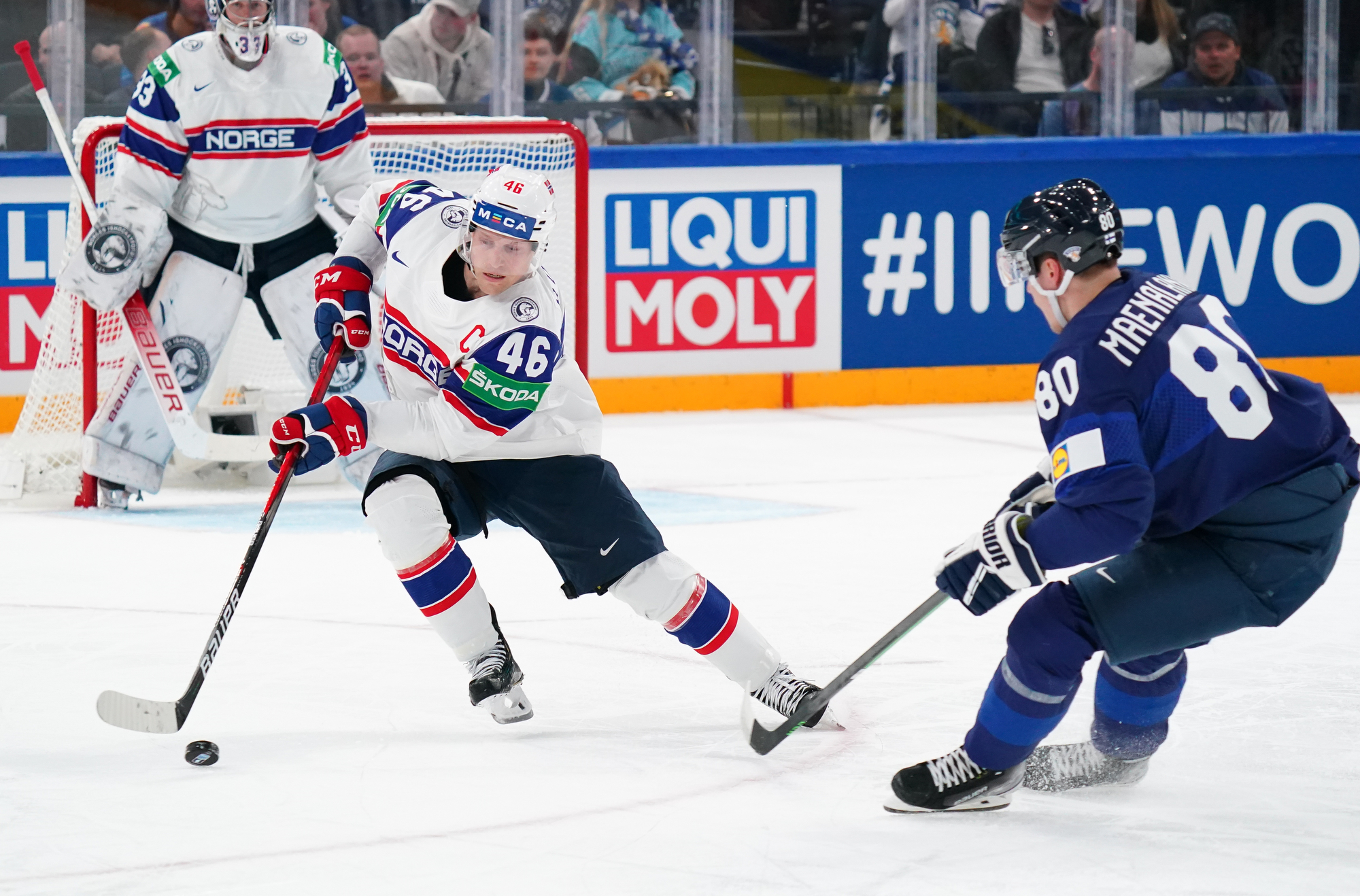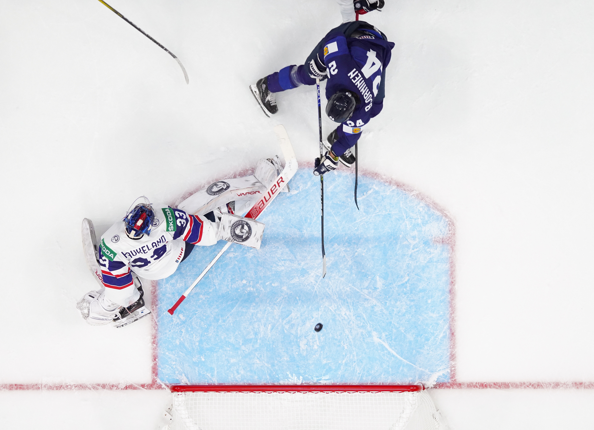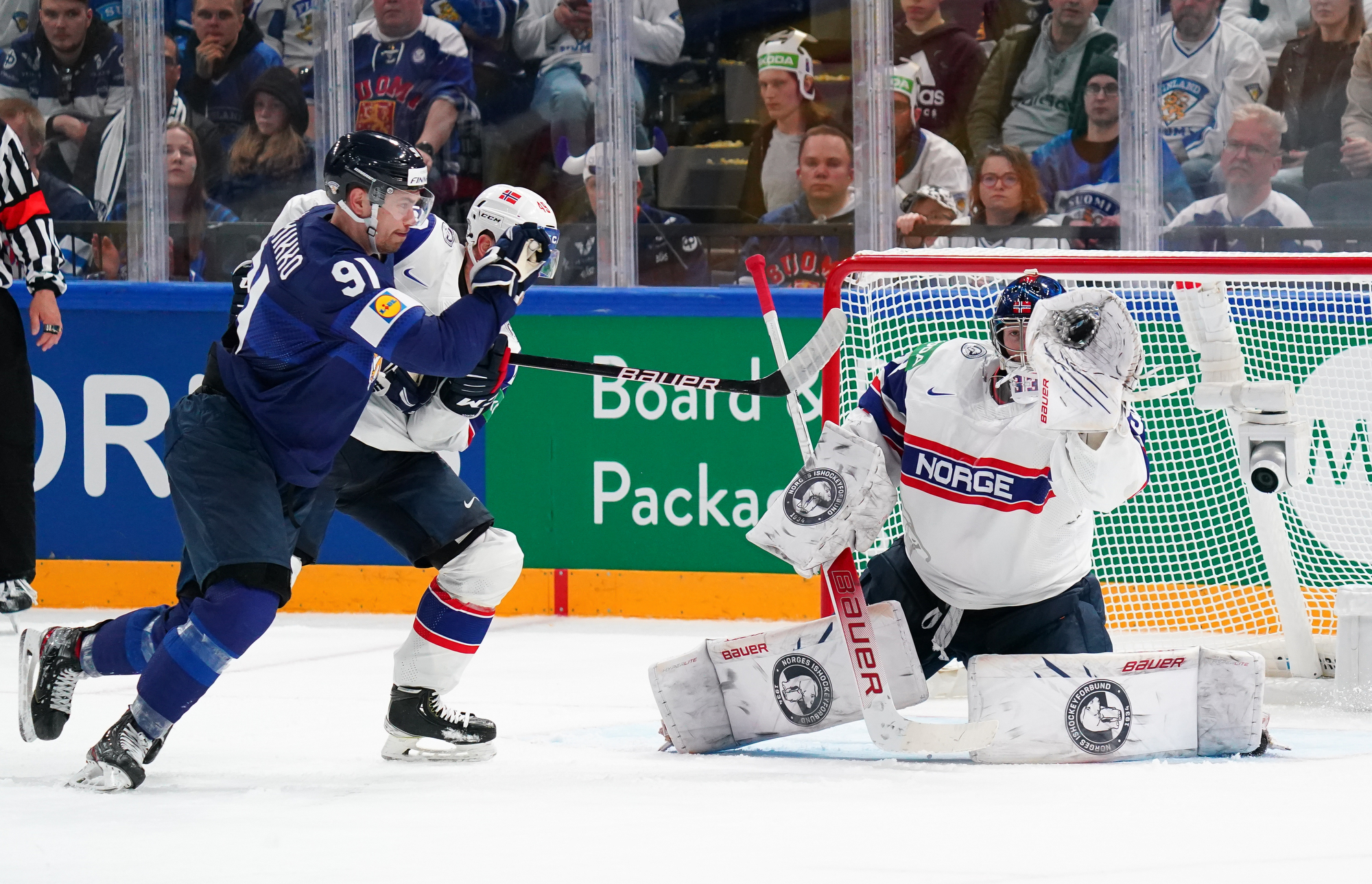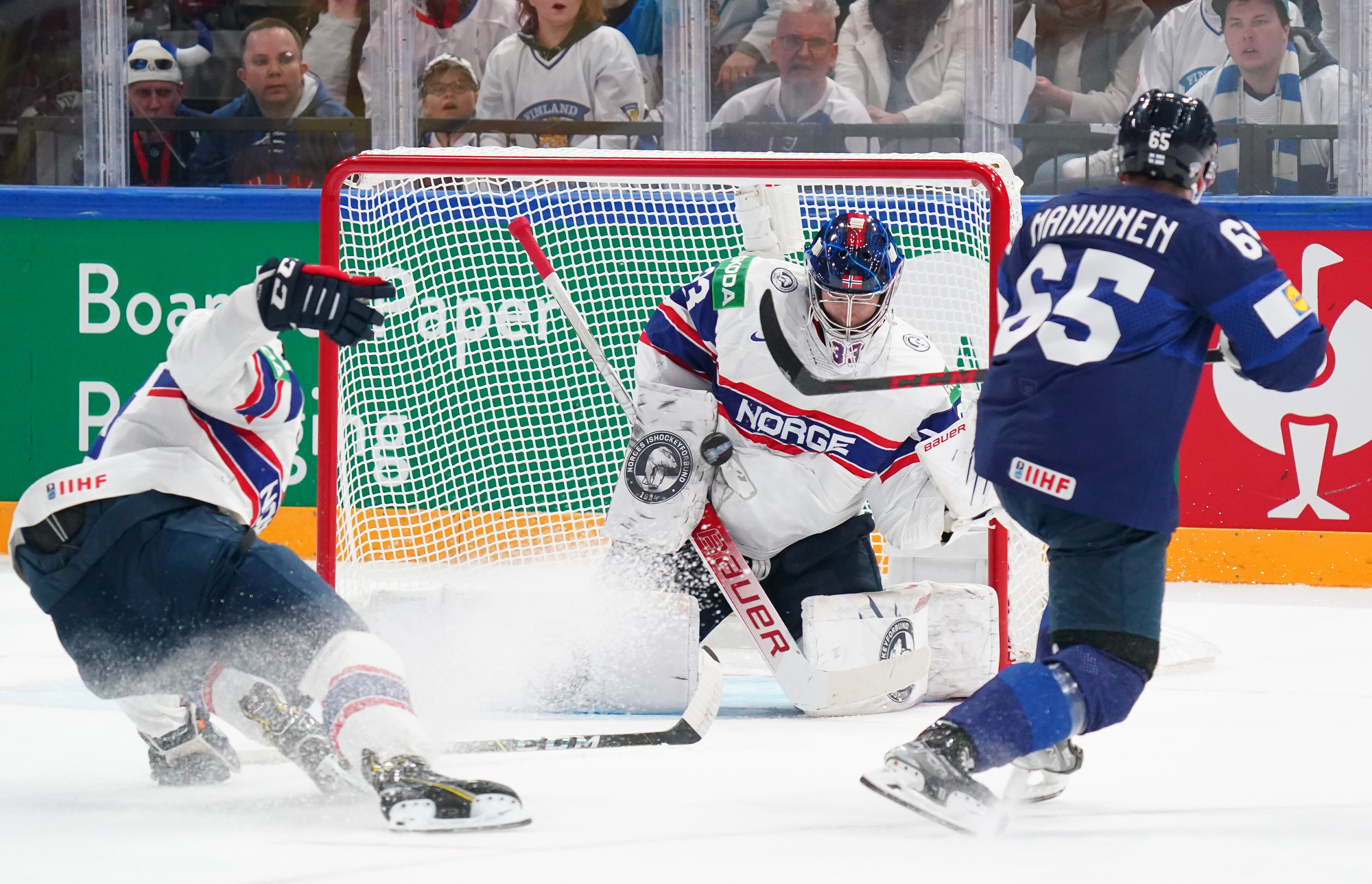 That wasn’t the end of the action: Olkinuora had to look sharp to preserve his shut-out with a sprawling save from Mathias Trettenes, then Magnus Brekke traded blows with Saku Maenalanen. The Norwegian was deemed the instigator but this time the penalty kill held firm.