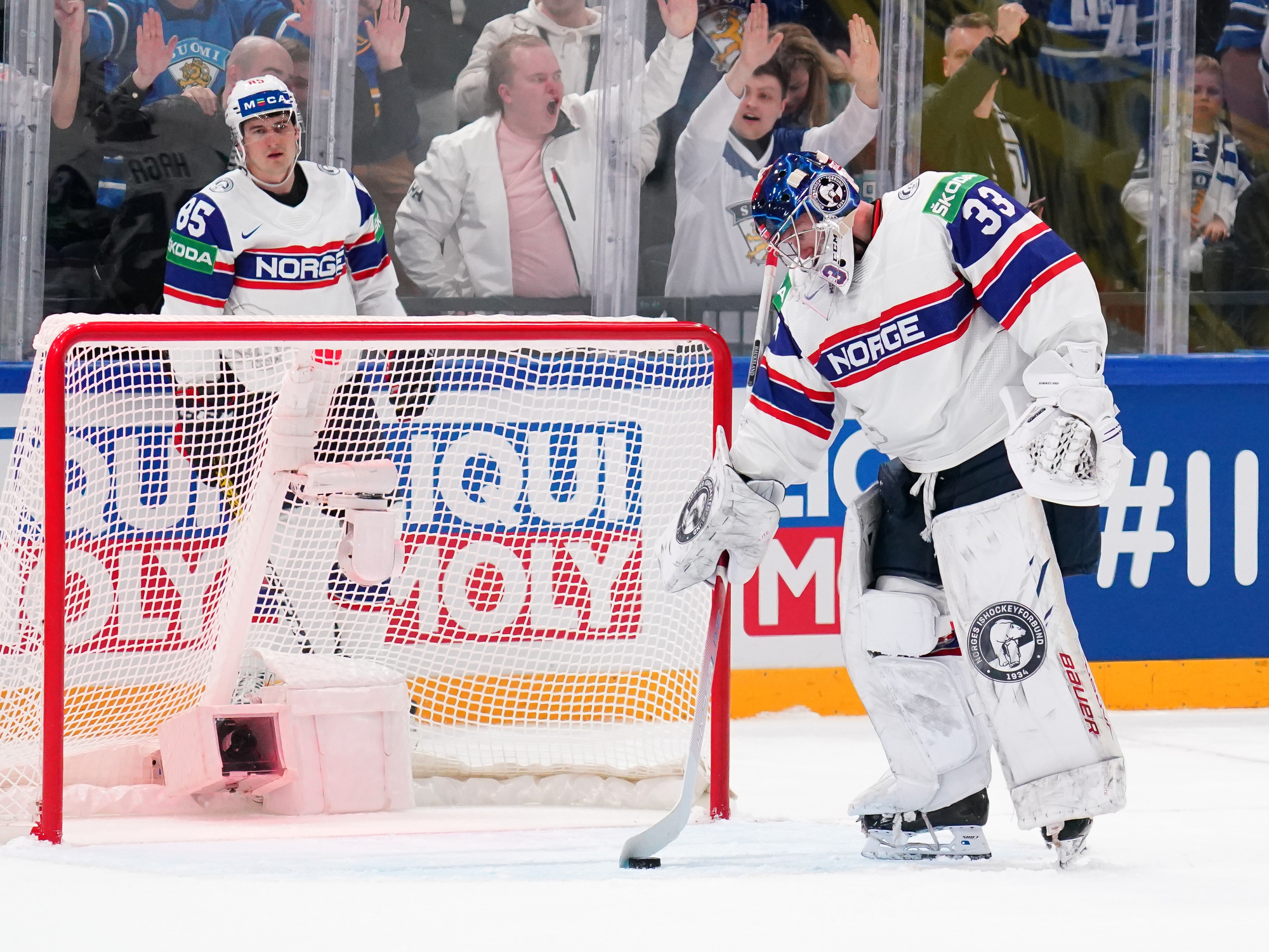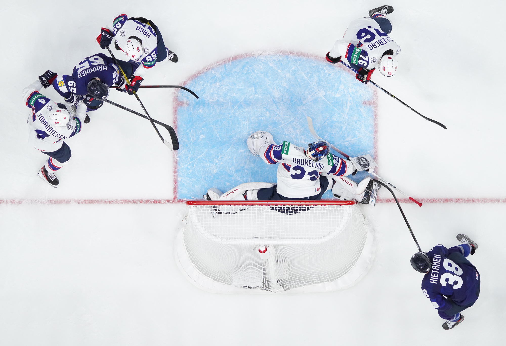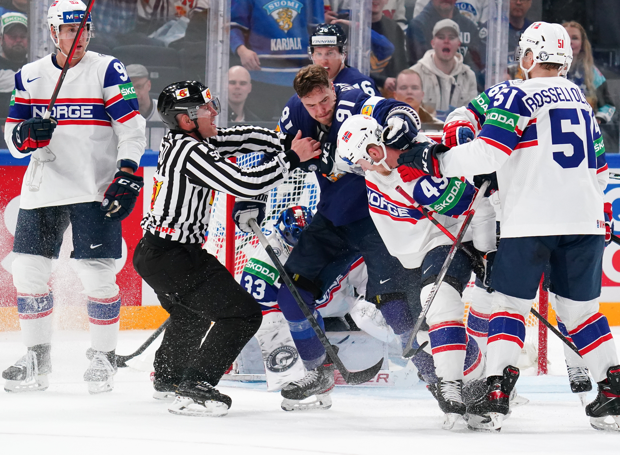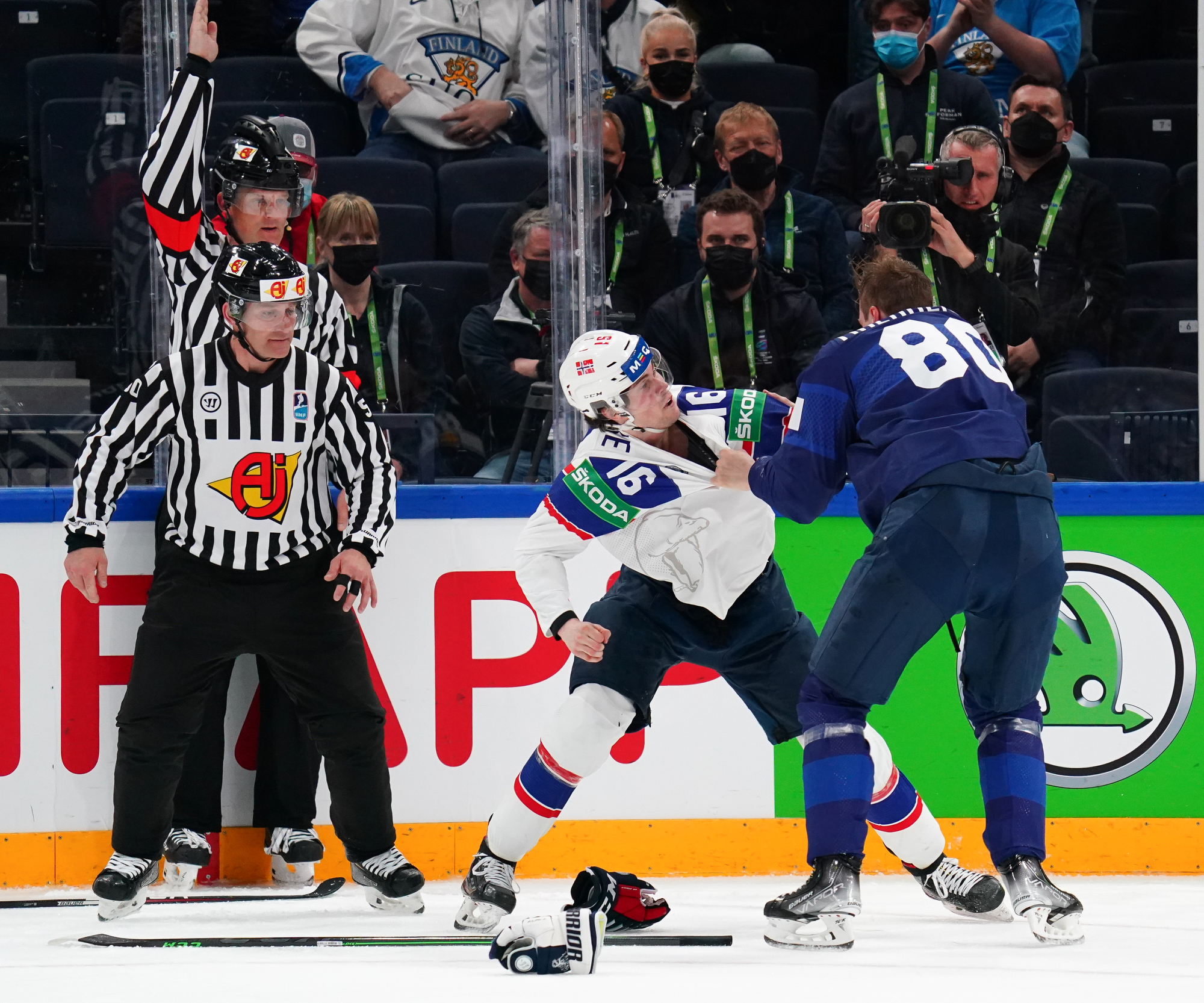 That wasn’t the end of the action: Olkinuora had to look sharp to preserve his shut-out with a sprawling save from Mathias Trettenes, then Magnus Brekke traded blows with Saku Maenalanen. The Norwegian was deemed the instigator but this time the penalty kill held firm.
