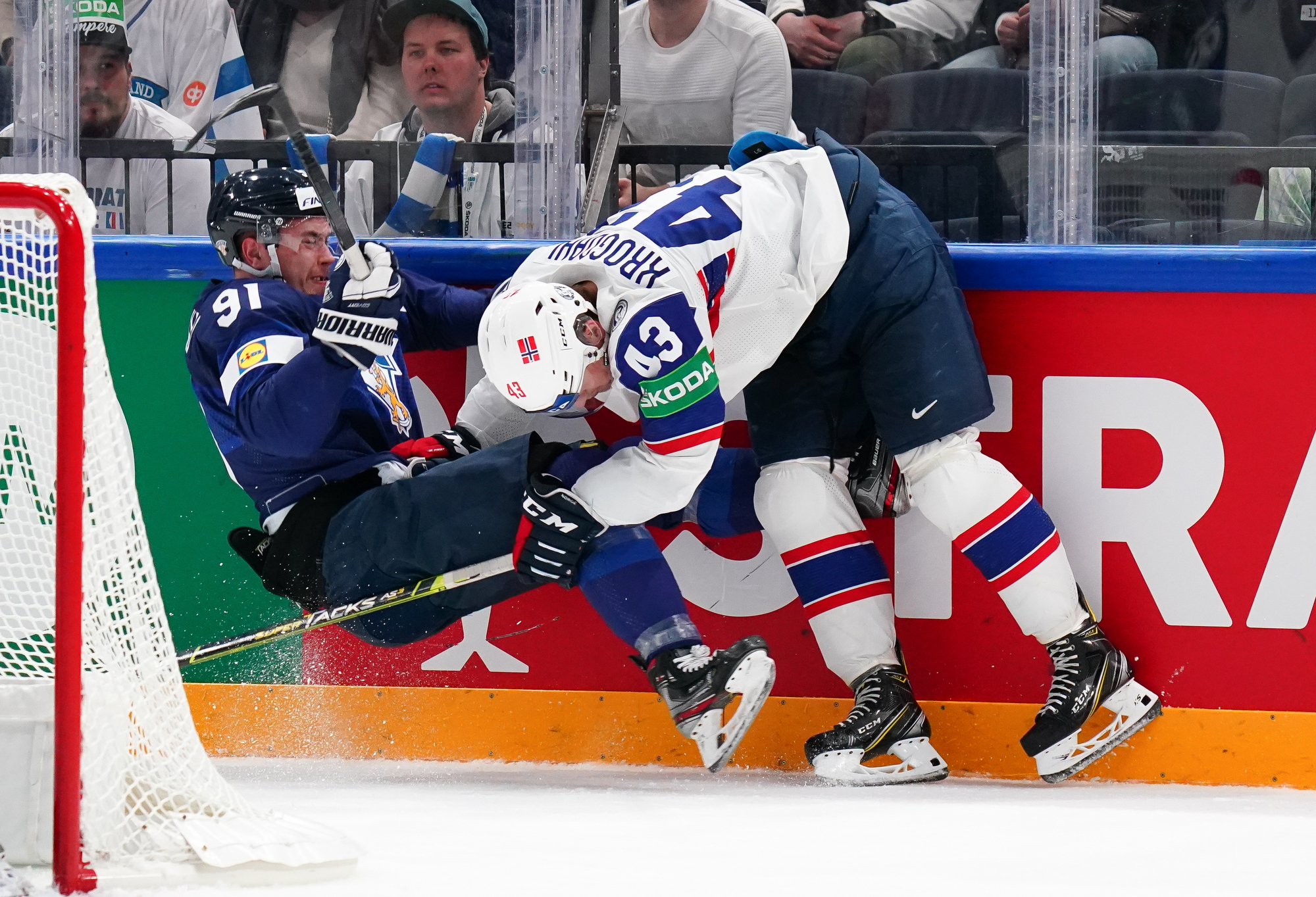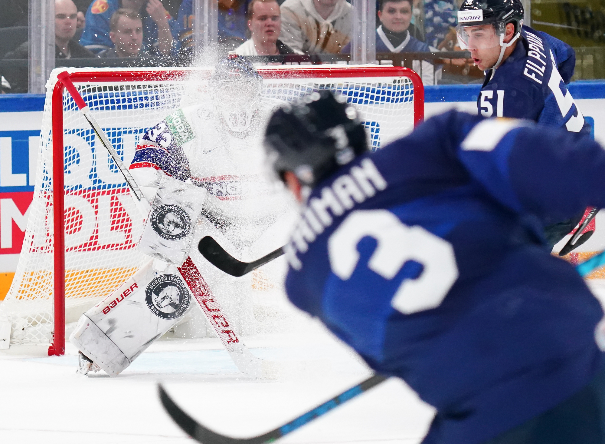 At the other end, Norway posed danger of its own: Christian Kaasastul had Jussi Olkinoura scrambling to meet a centre point shot that came through traffic, then the home goalie was a relieved man after Sami Vatanen’s deflection sent a Max Krogdahl shot onto the crossbar rather than into the net. Krogdahl, 23, is part of a new generation of Norwegian defencemen; today he was agonisingly close to opening his World Championship goal account in memorable style.