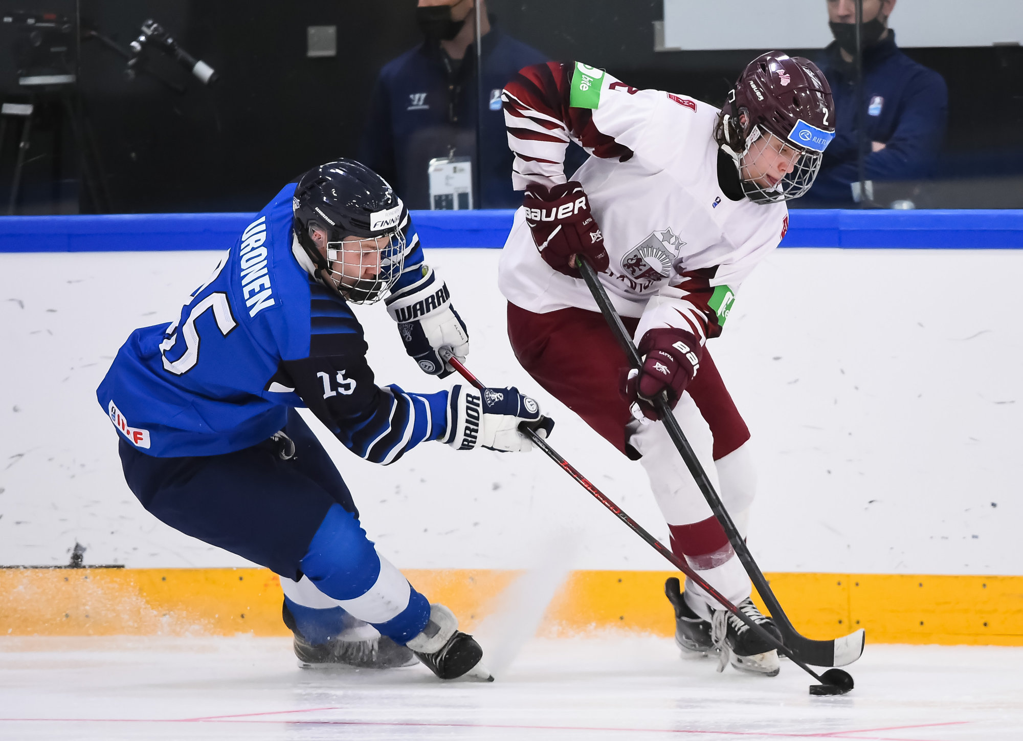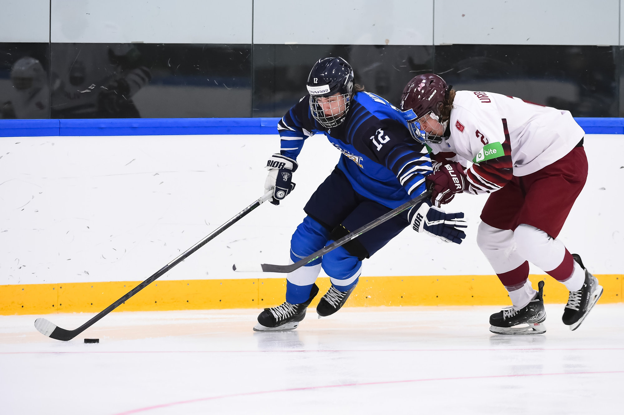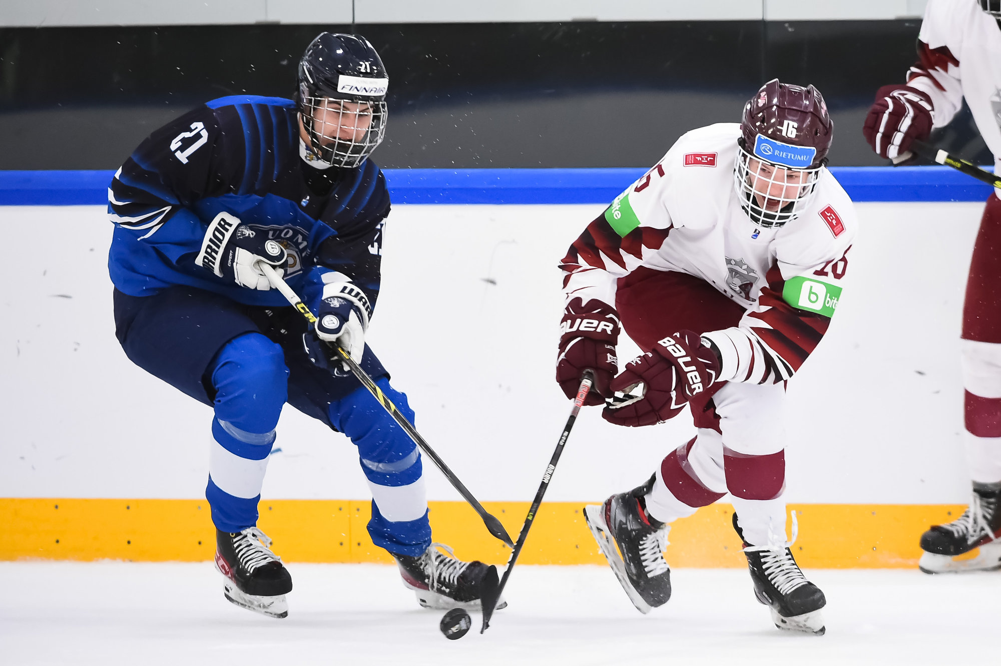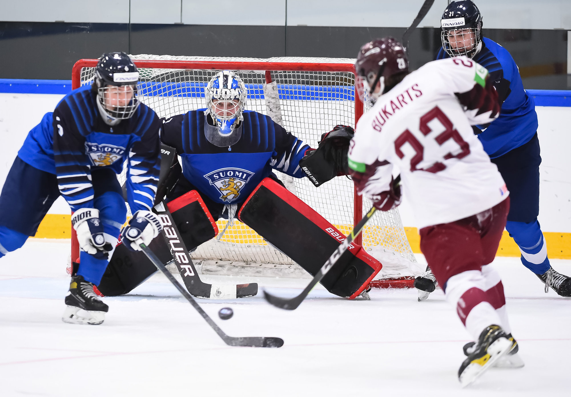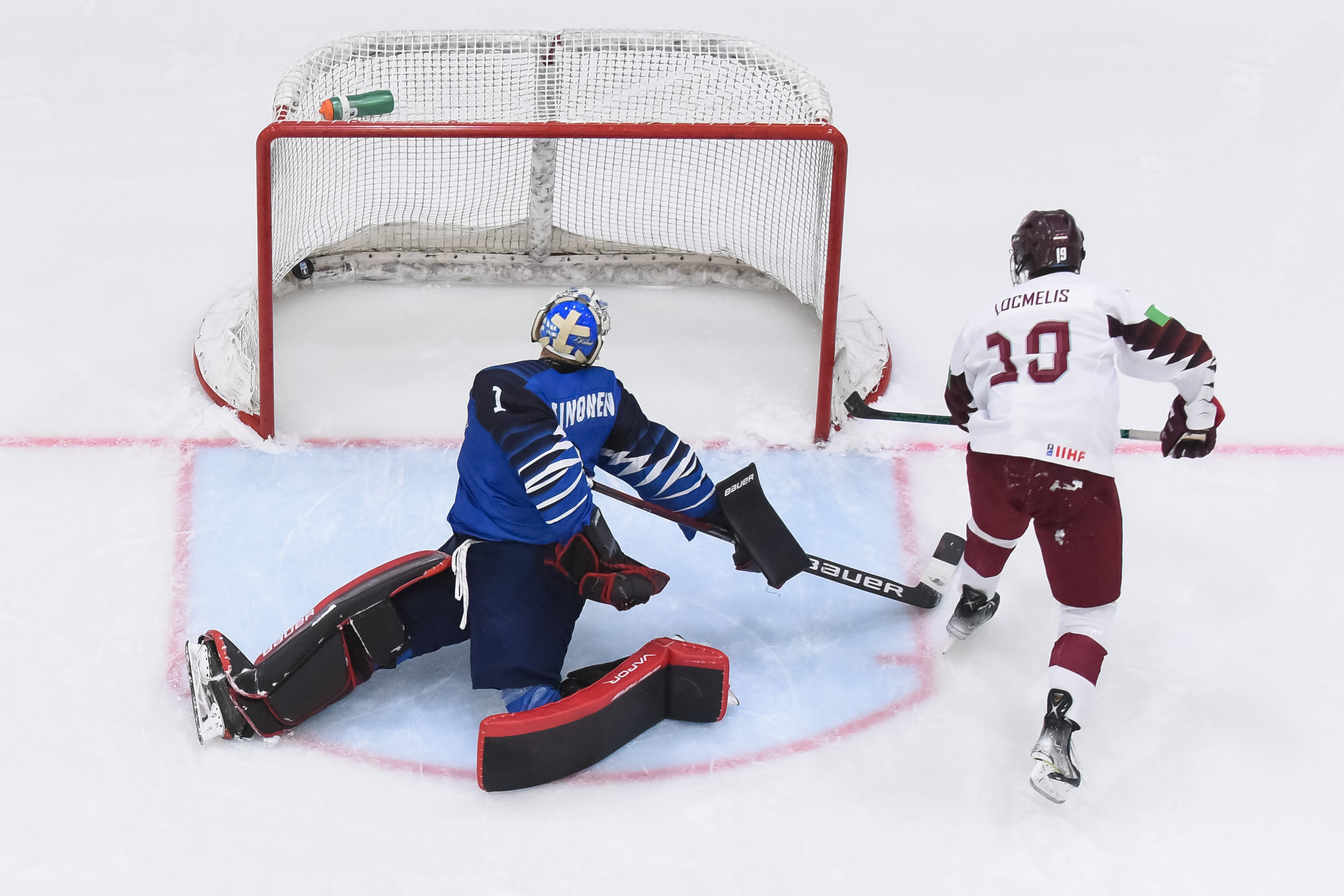 Although Suomi held the edge in play during the first period, each team scored once. The Finns had the first great chance midway through the period when defender Niko Minkkinen fed captain Jere Lassila with a stretch pass that turned into a breakaway. Lassila made a nice move, but goalie Deivs Rolovs got his left pad out to make a terrific save.