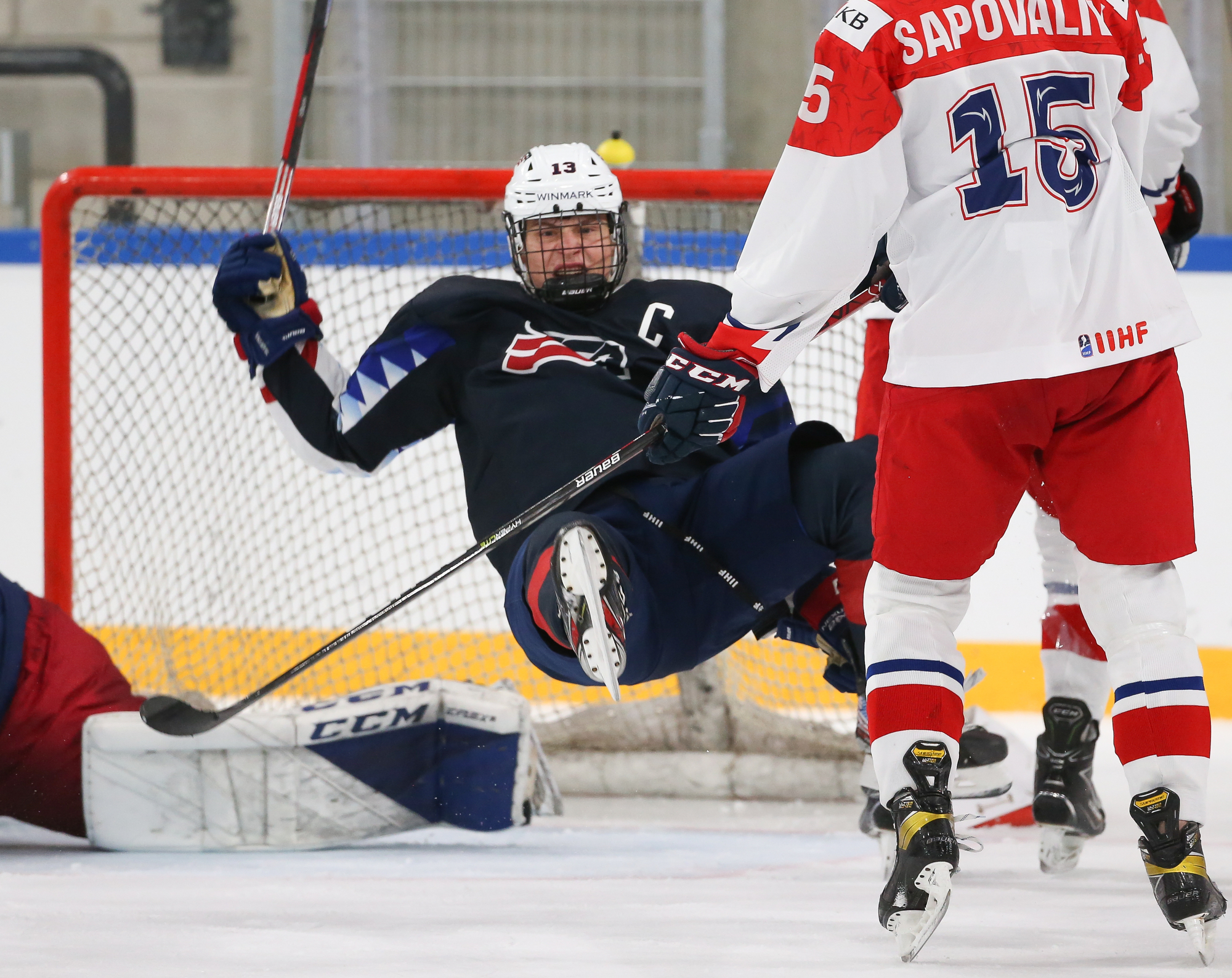 But after a somewhat lacklustre first period, the Americans bounced back in the second by outshooting Czechia 19-5 and scored four straight goals in a span of 7:02 to take control of the game. The team’s tremendous depth was on display, with all four lines getting in on the offence, as did their defence and goaltender Muszelik even drew an assist.