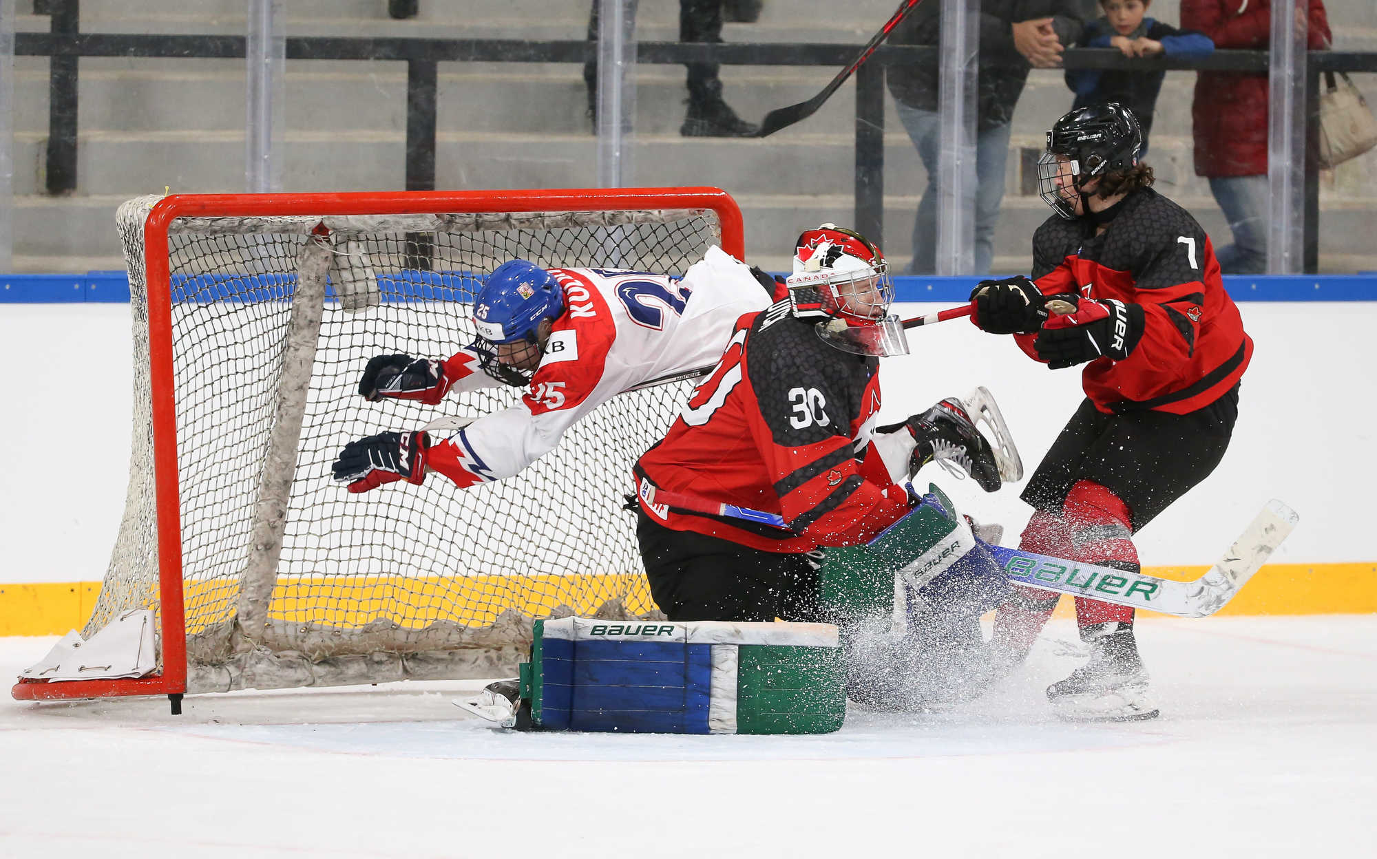 On the 5-on-3, the Czechs pressed hard and Bares buried a rebound after a point shot from Hamara. Canada challenged the play for goaltender interference, as Matyas Sapovaliv’s stick appeared to get tangled in Dyck’s equipment. However, following a video review, the goal was upheld, which resulted in Canadian bench minor for delaying the game.