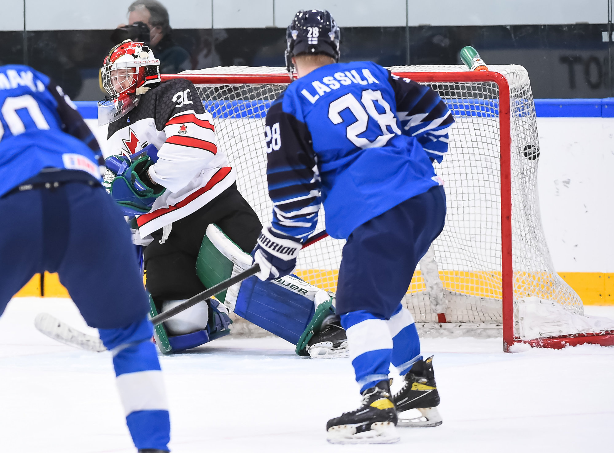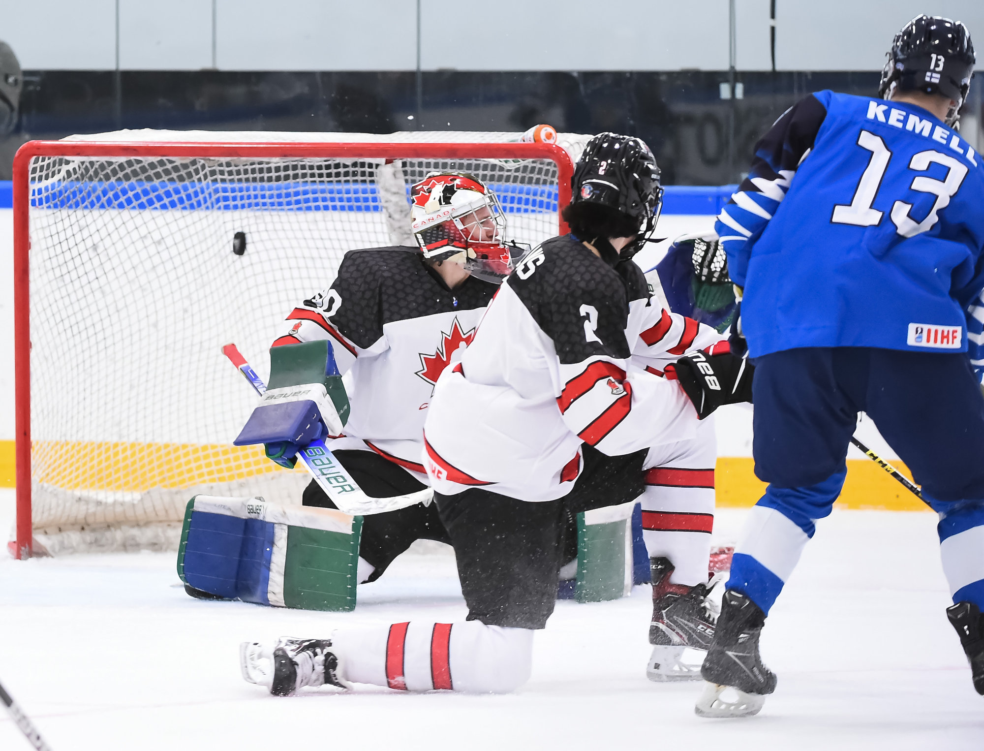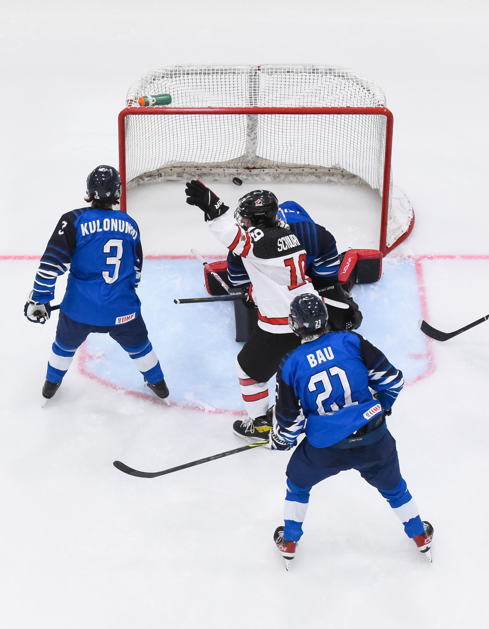 Canada jumped into a two-goal lead early in the second, again thanks to good fortune and quick hands in front of the Finnish goal. Nicholas Moldenhauer made a pass from behind the goal that bounced off the skate of Kasper Kulonummi, right onto the stick of Brayden Schuurman, and he swatted the puck in from close range at 5:25.