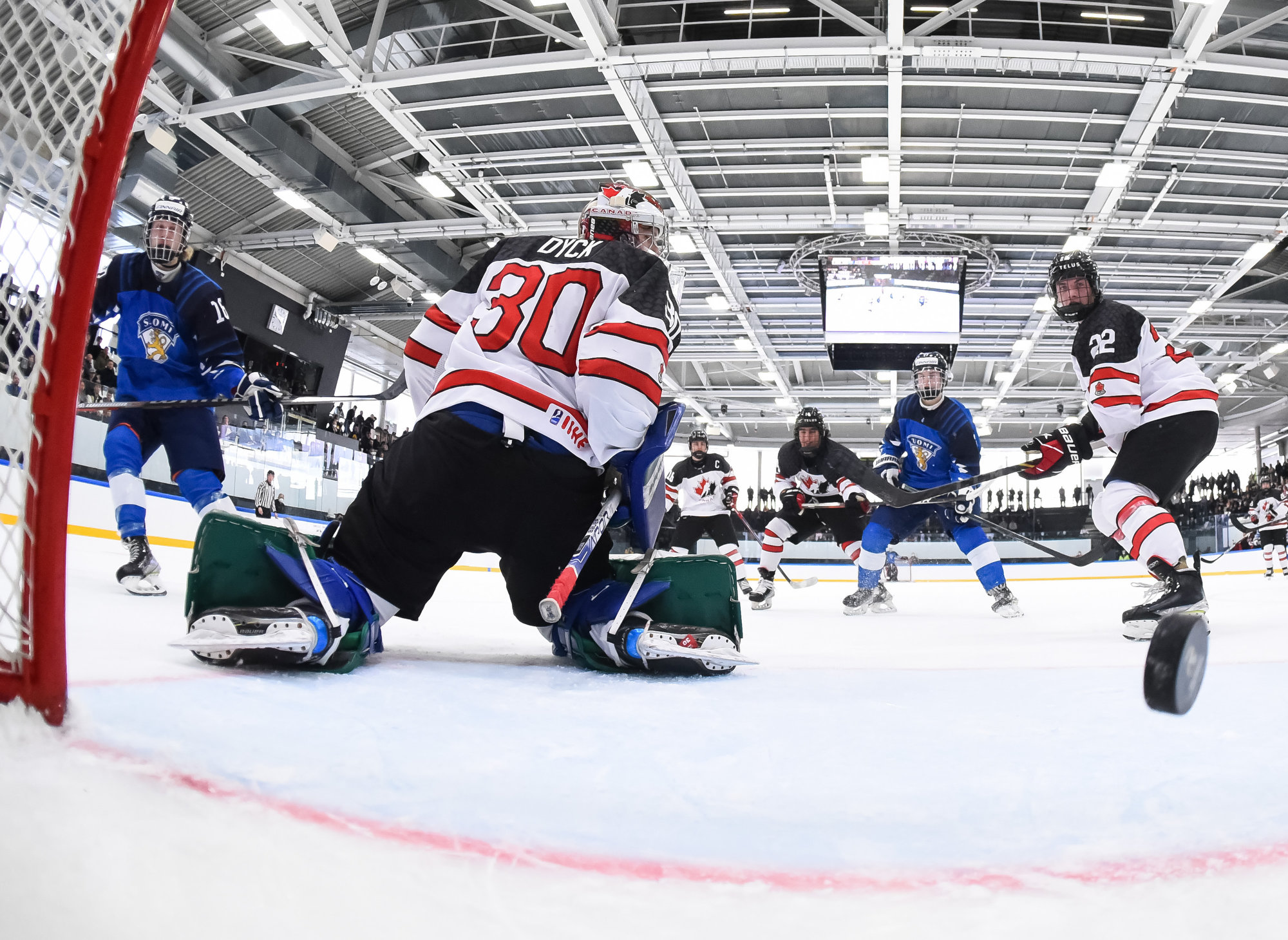 Just four minutes later, though, Michael Mastrodomenico took a holding penalty, and 24 seconds later it was a 2-2 game. Predictably, Kemell was the sniper, from the other side of the ice, beating Dyck over the shoulder to the far side. It was a psychological goal as much as anything for Canada, a team clearly lacking all confidence killing penalties.