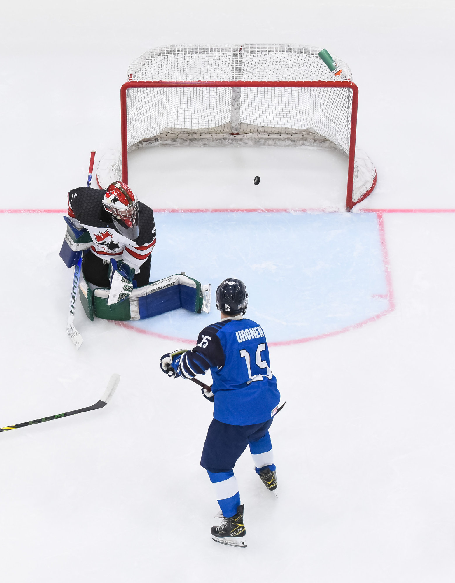 If that wasn't enough, Canada took another penalty and coach Mika Marttila pulled Leinonen for a two-man advantage. They tied the game off a high shot by Halttunen over the glove of Dyck, another suspect goal that tied the game at 5 with only 1:42 remaining and forcing overtime.