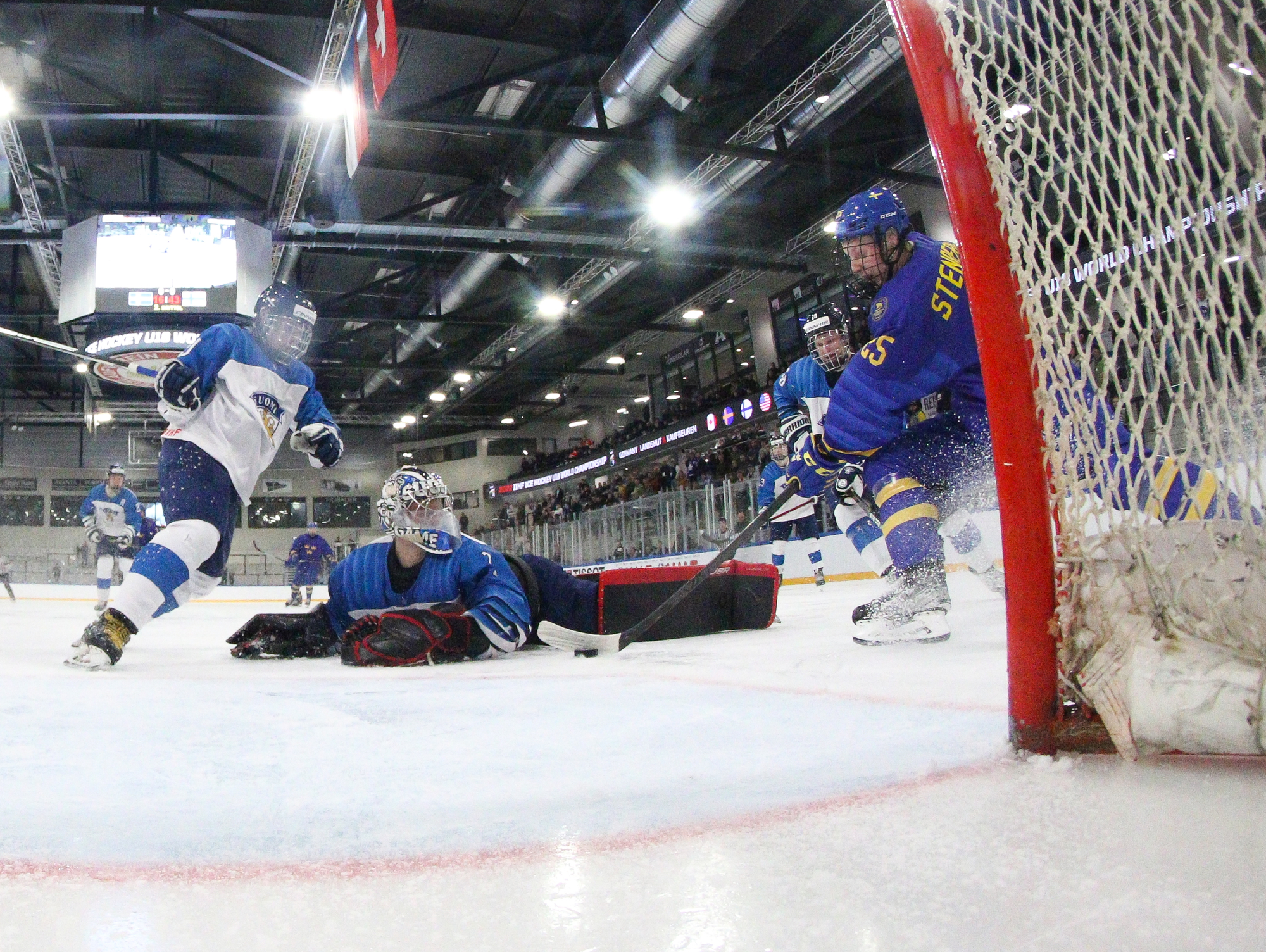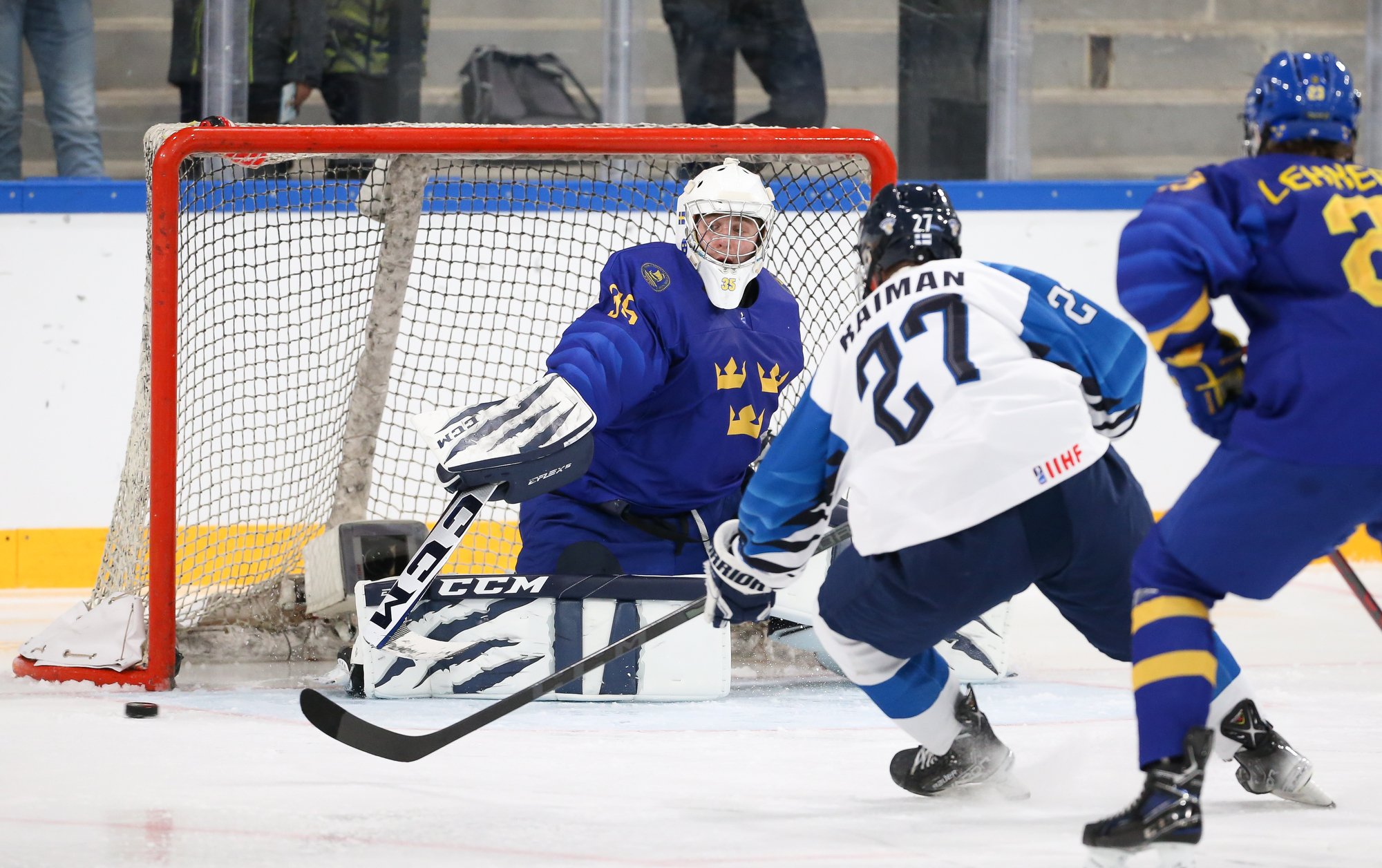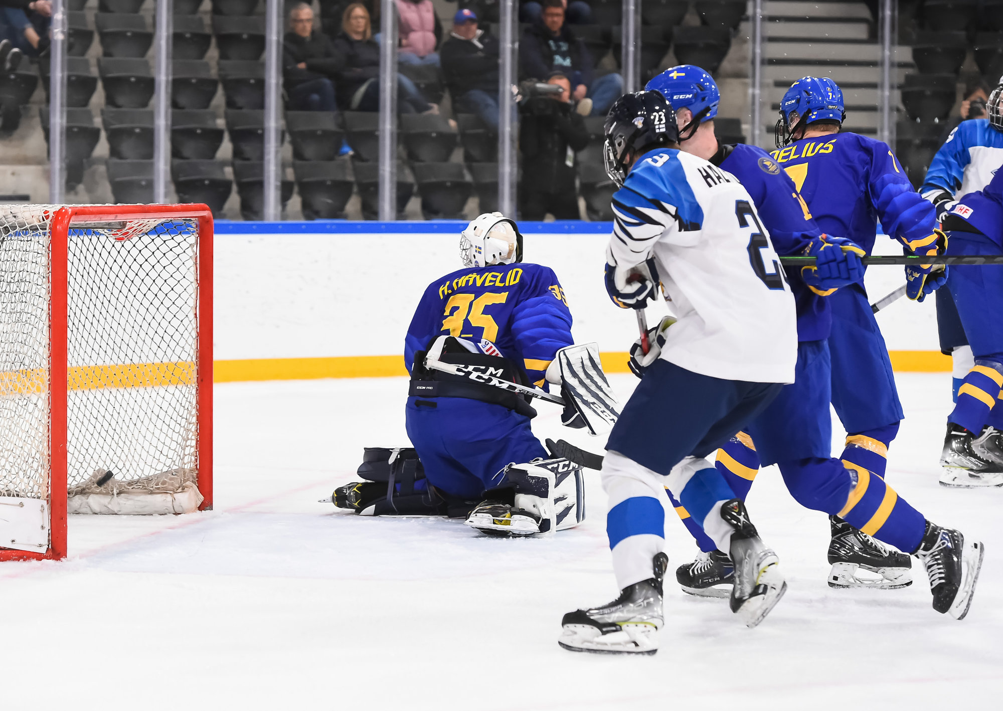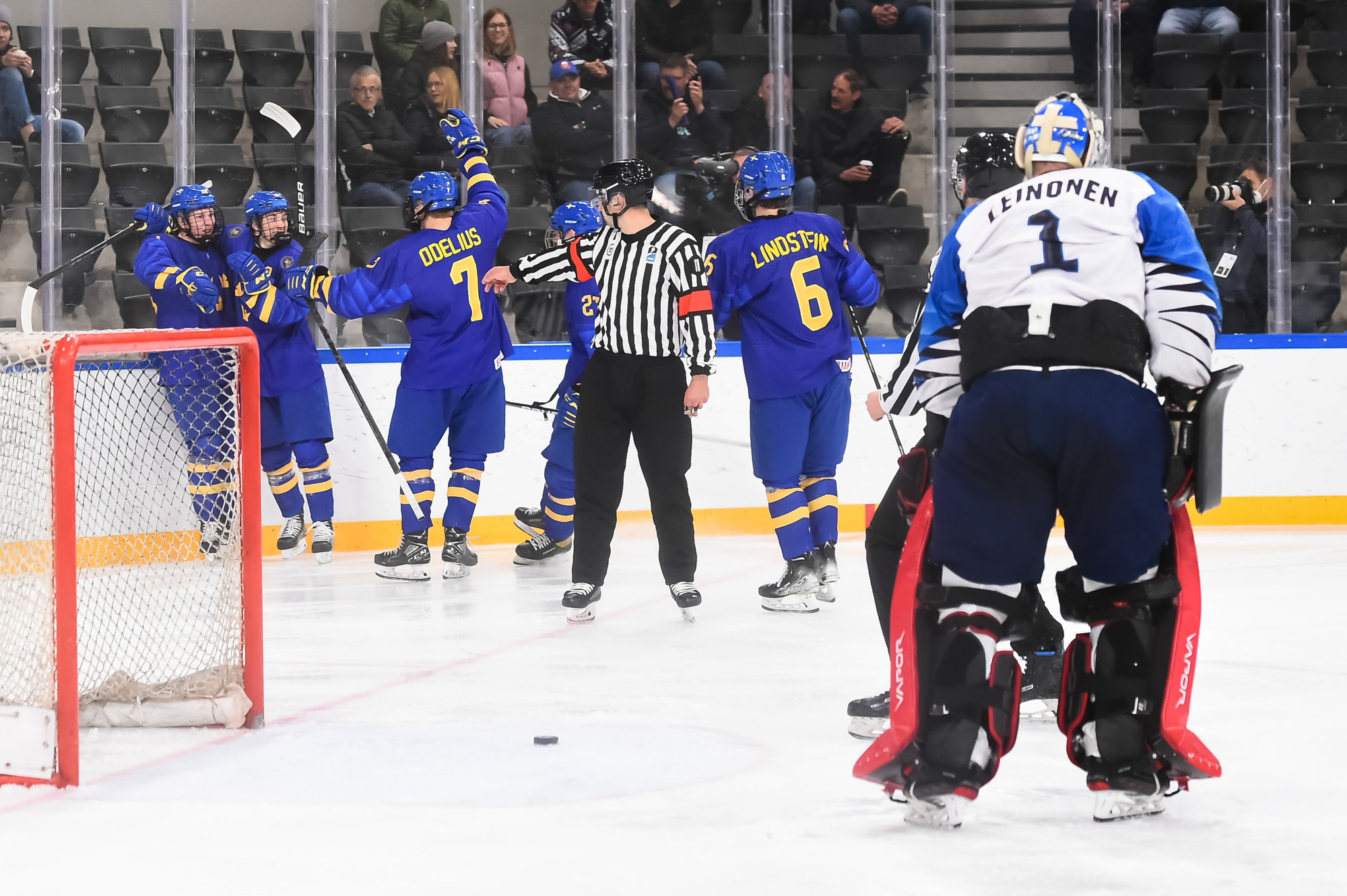 Oskar Pettersson sent a backhand shot along the ice that Leinonen tried to poke-check away before Ostlund got to it. However, the stick got knocked out of Leinonen’s hand in the process and the puck slid under him. It was lying loose right beside the goaltender, but before he could find it, Otto Stenberg reached in and swept the puck into the net.