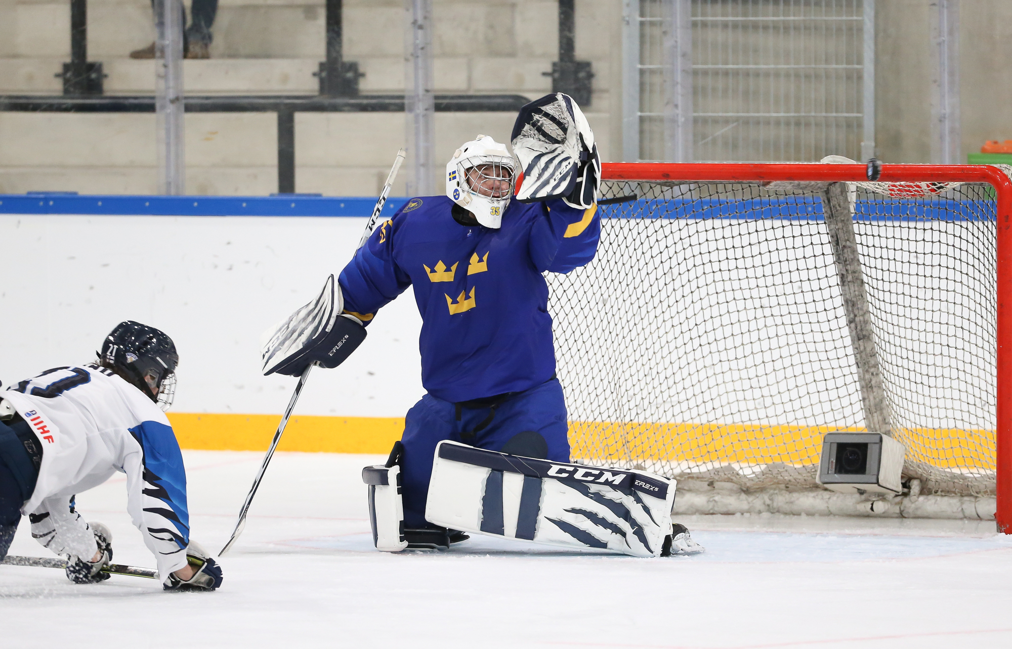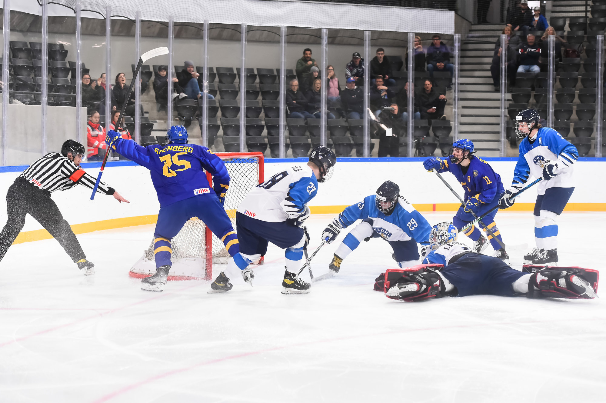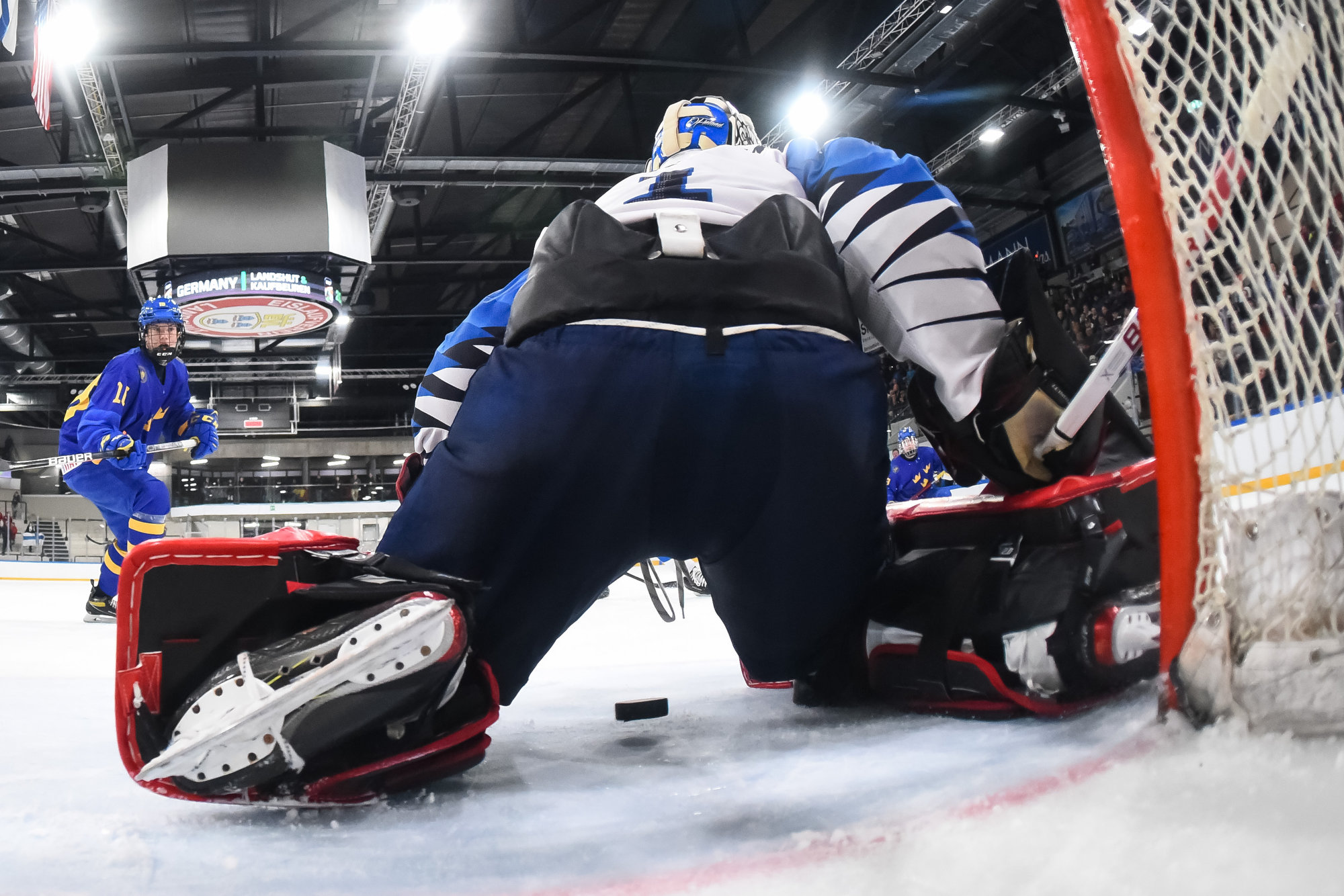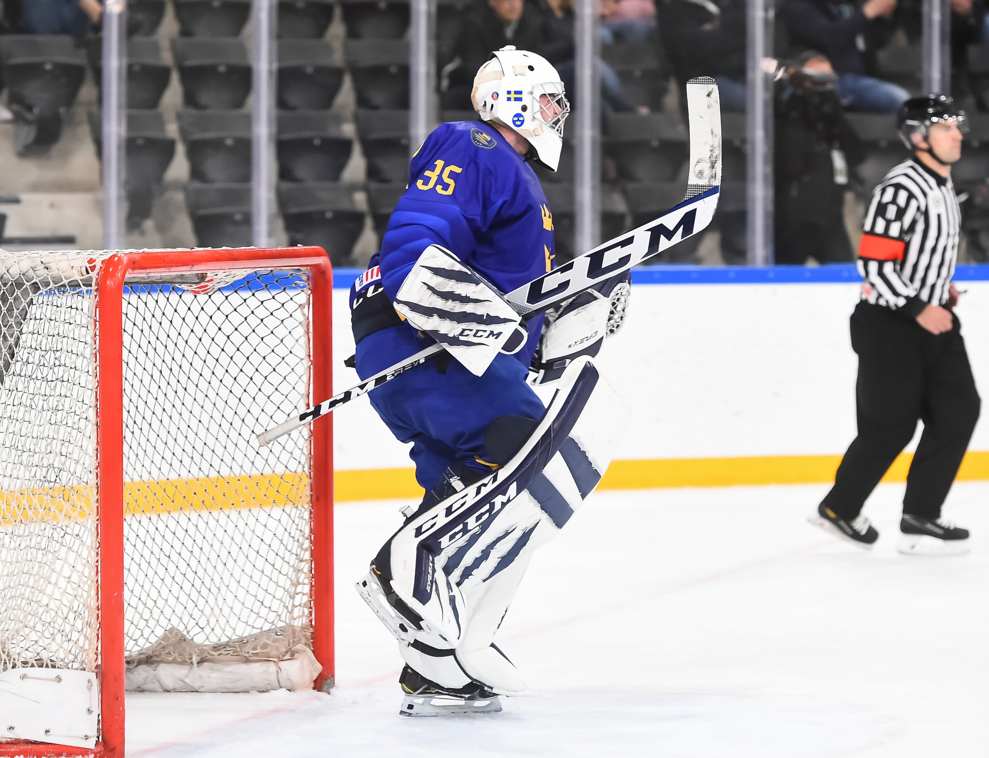 Oskar Pettersson sent a backhand shot along the ice that Leinonen tried to poke-check away before Ostlund got to it. However, the stick got knocked out of Leinonen’s hand in the process and the puck slid under him. It was lying loose right beside the goaltender, but before he could find it, Otto Stenberg reached in and swept the puck into the net.
