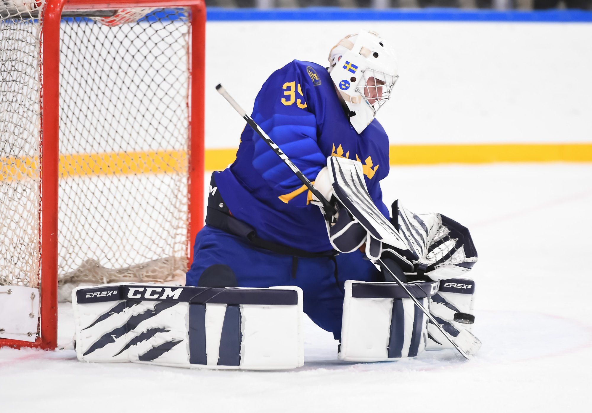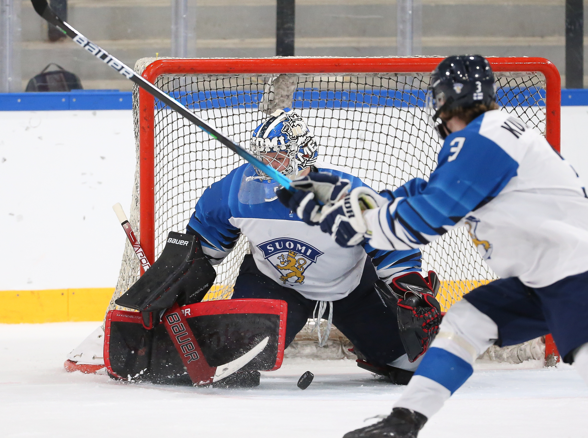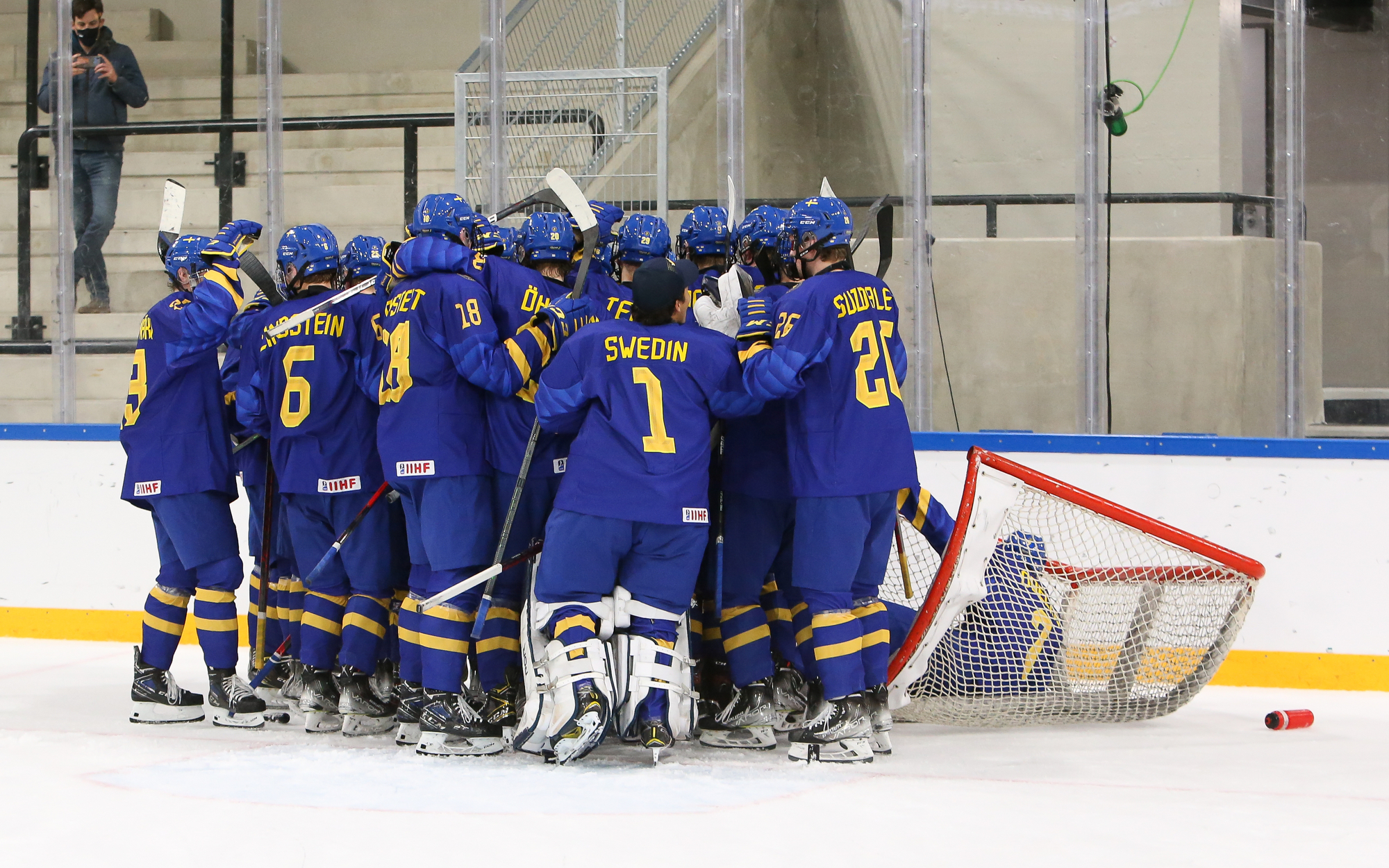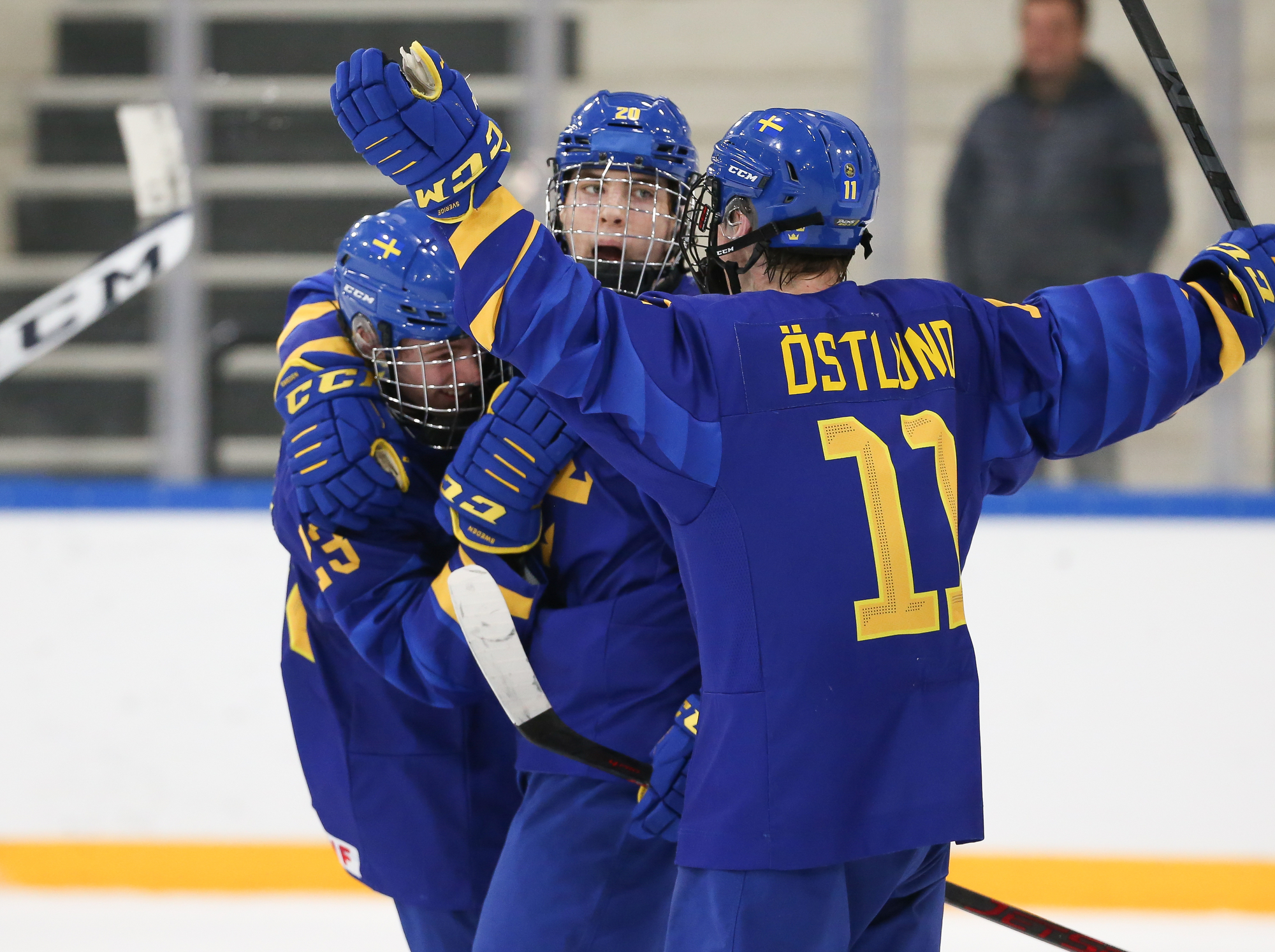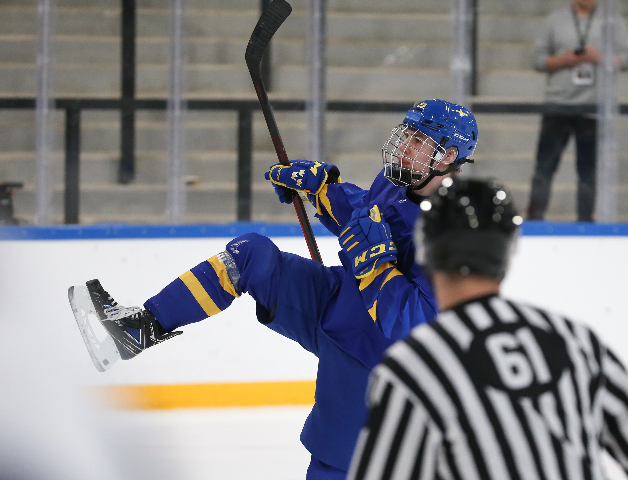 Oskar Pettersson sent a backhand shot along the ice that Leinonen tried to poke-check away before Ostlund got to it. However, the stick got knocked out of Leinonen’s hand in the process and the puck slid under him. It was lying loose right beside the goaltender, but before he could find it, Otto Stenberg reached in and swept the puck into the net.