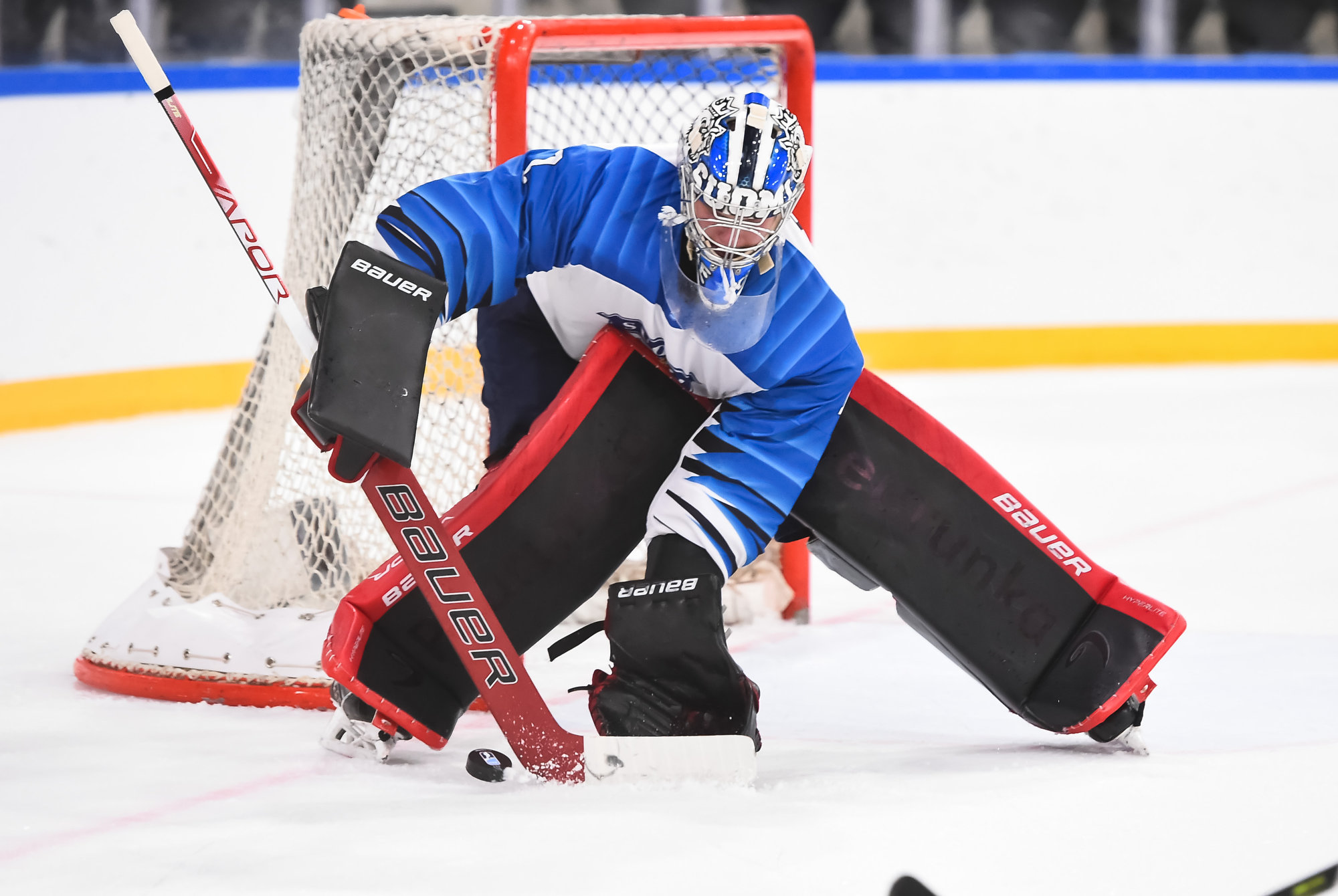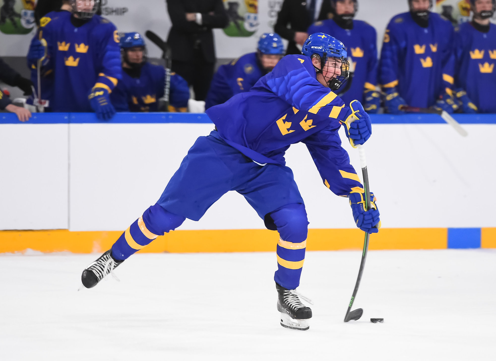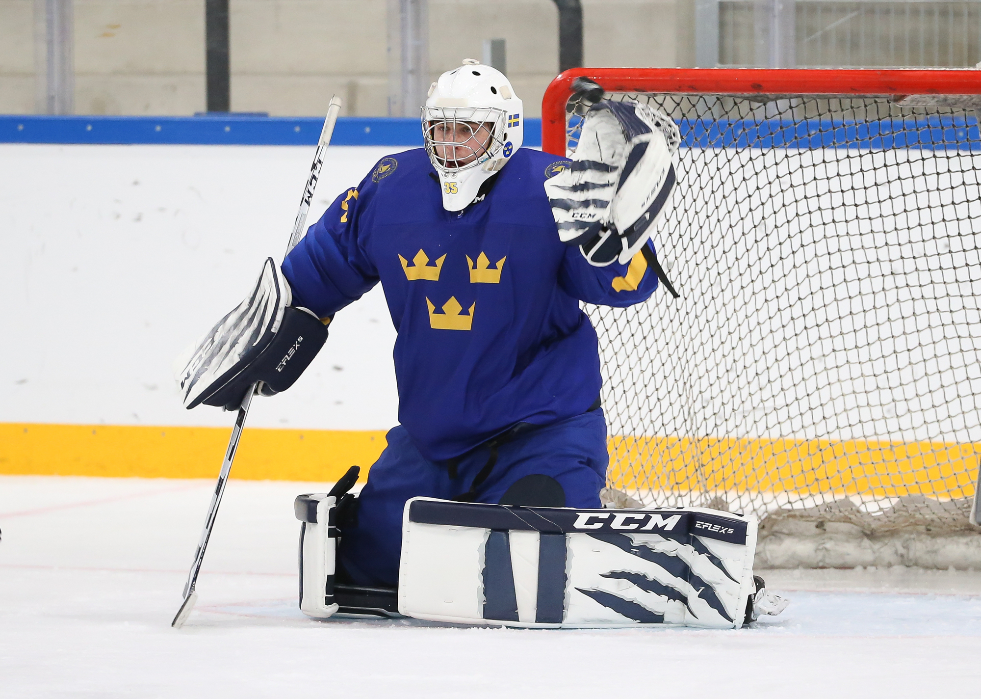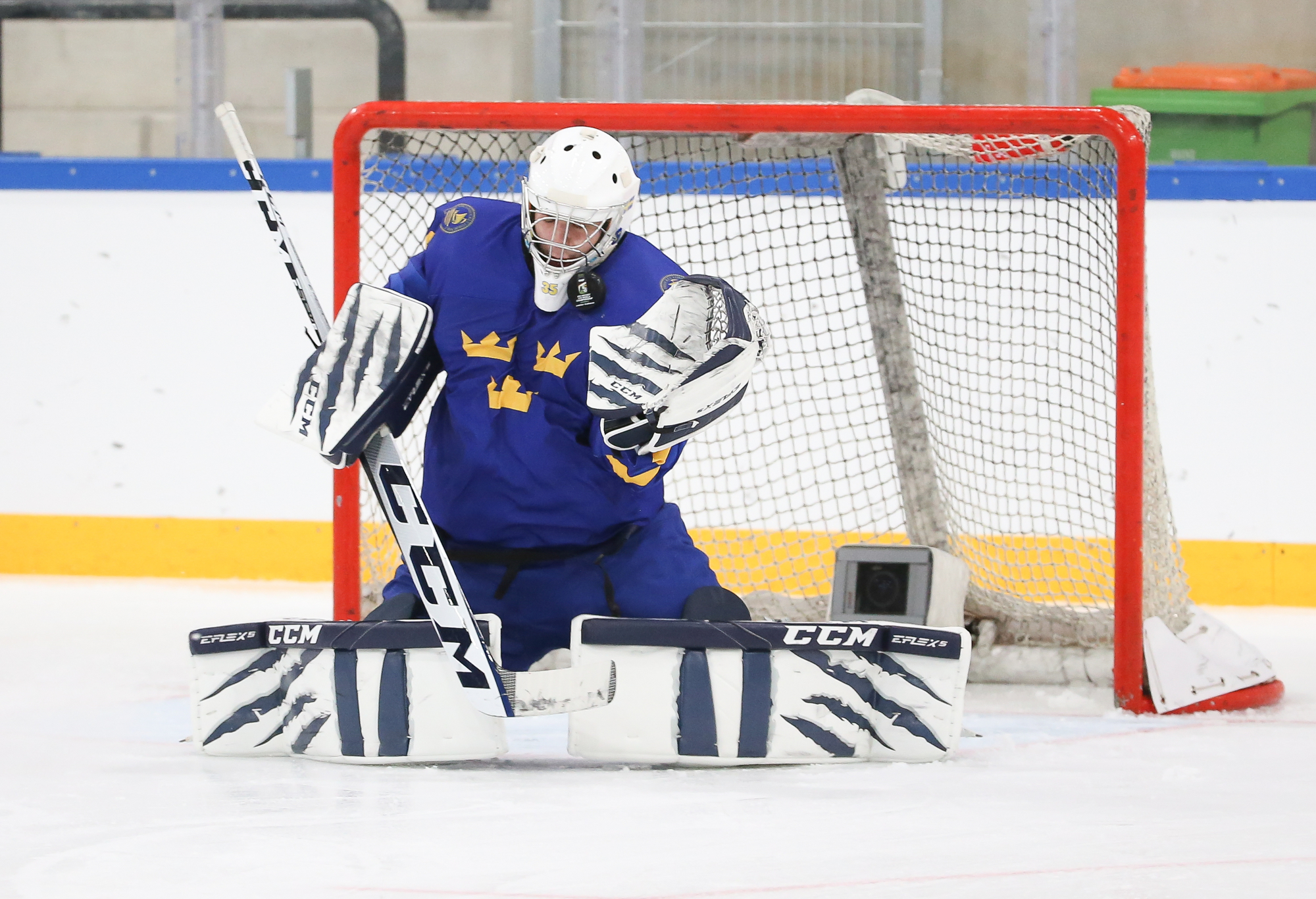 Oskar Pettersson sent a backhand shot along the ice that Leinonen tried to poke-check away before Ostlund got to it. However, the stick got knocked out of Leinonen’s hand in the process and the puck slid under him. It was lying loose right beside the goaltender, but before he could find it, Otto Stenberg reached in and swept the puck into the net.