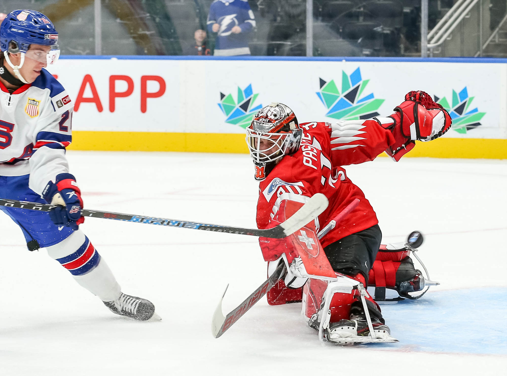 Swiss goalkeeper Kevin Pasche makes a save against Team USA's Brett Berard.