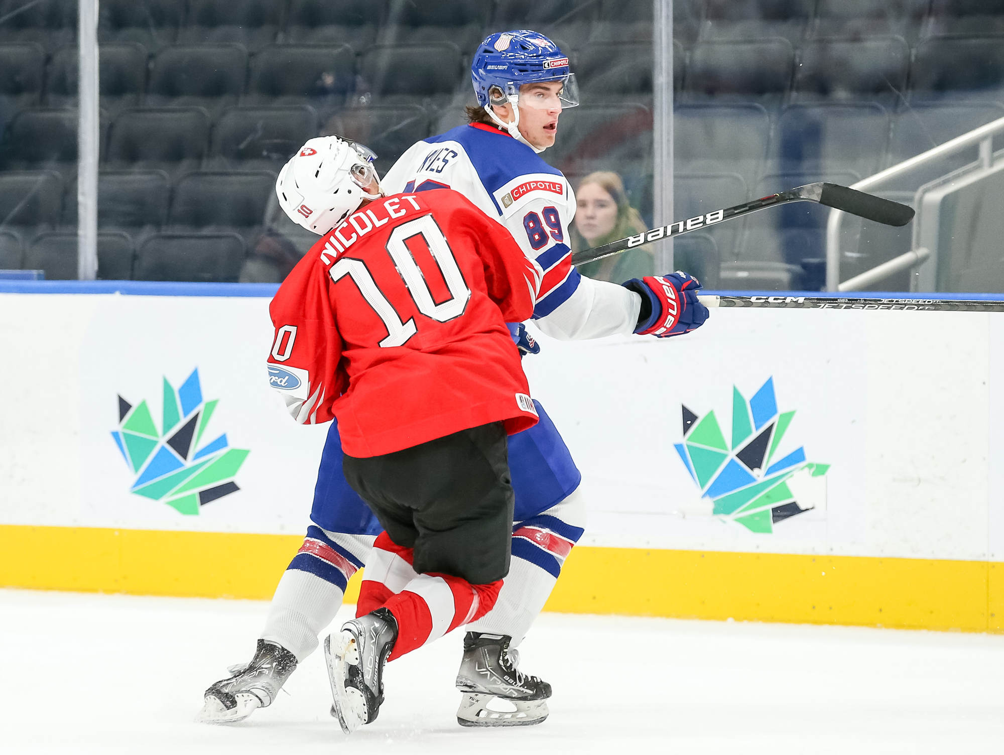 Six different players scored for the Americans and five of the seven goals were produced by the first line including two from Carter Mazur, who also had an assist. Thomas Bordeleau had a goal and two assists, and defender Luke Hughes, who logged a team high 21:18 of ice time, added three helpers.