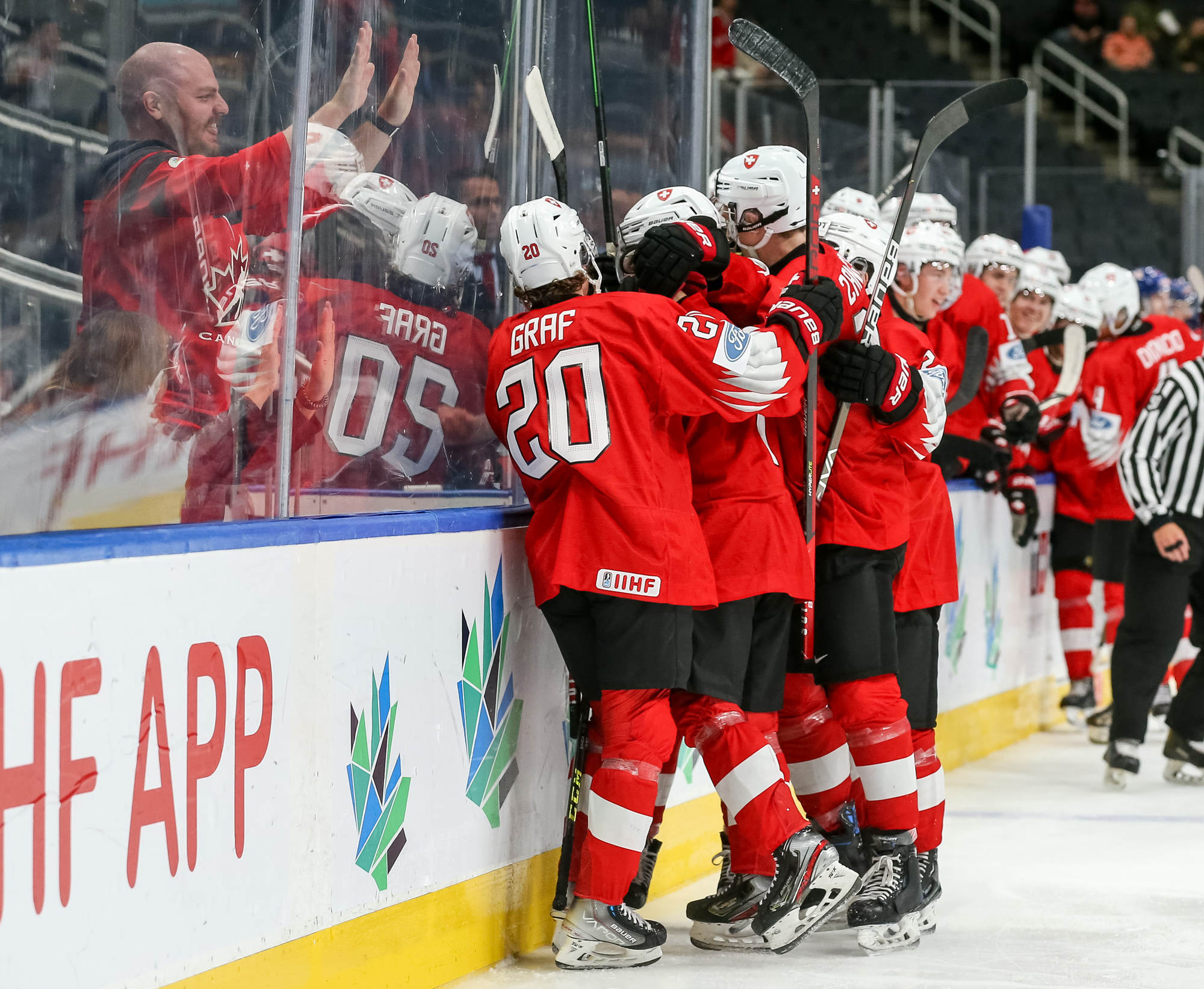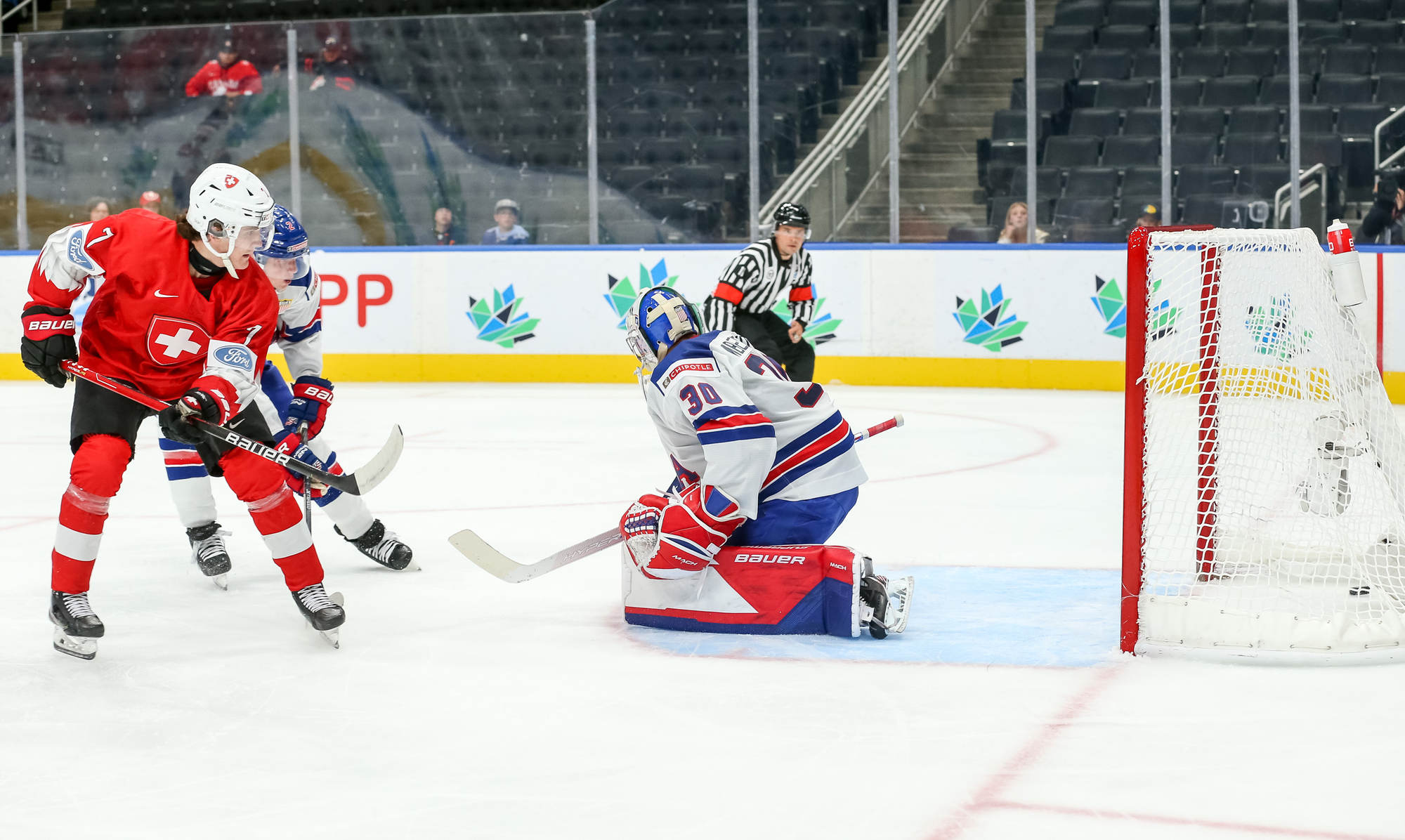 Early on, though, the Swiss took a penalty and Patenaude found himself waving at a blistering one-timer from Thomas Bordeleau that dented the twine at 1:57. Riley Duran added to the tally with a high wrist shot from close range at 15:23.