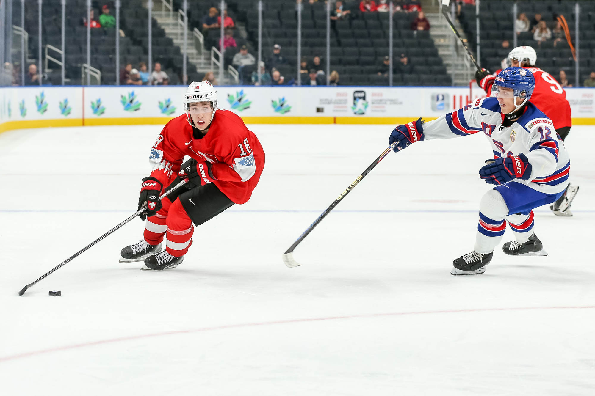 The Americans came out flying to start the second and created two early power plays, scoring on the second. Carter Mazur made a great back pass to the side of the Swiss goal, finding Mackie Samoskevich open in front for the easy goal at 5:54. Two-and-a-half minutes later, though, the Swiss tied the game thanks to a great individual effort by Joel Henry. He claimed a loose puck in centre ice and charged in on goal, avoiding two Americans chasing him down, and made a nice deke, sliding the puck between Kaidan Mbereko’s pads.