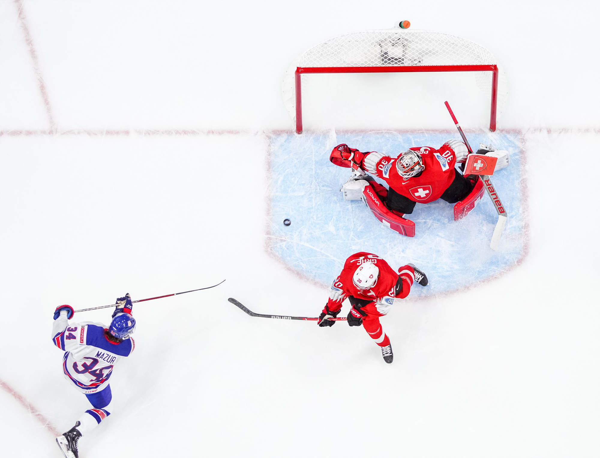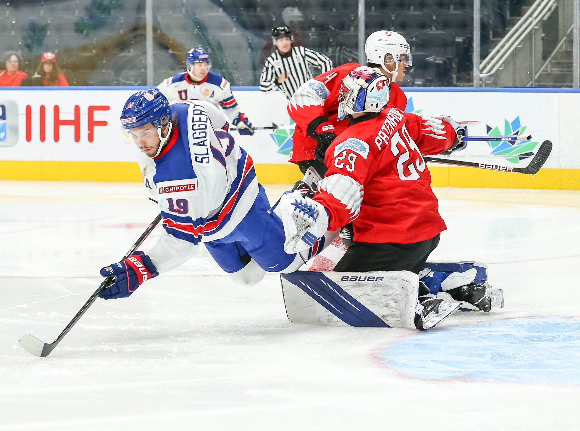 That was as close as the Swiss ever got. Brock Faber wired a high shot over the shoulder of Pasche at 11:29 to make it 2-1. Landon Slaggert then made a great cross-ice pass to Mazur, who blasted a one-timer to the back side of Pasche at 13:22 to double the lead, and then they got two more thanks to beautiful tips in front.