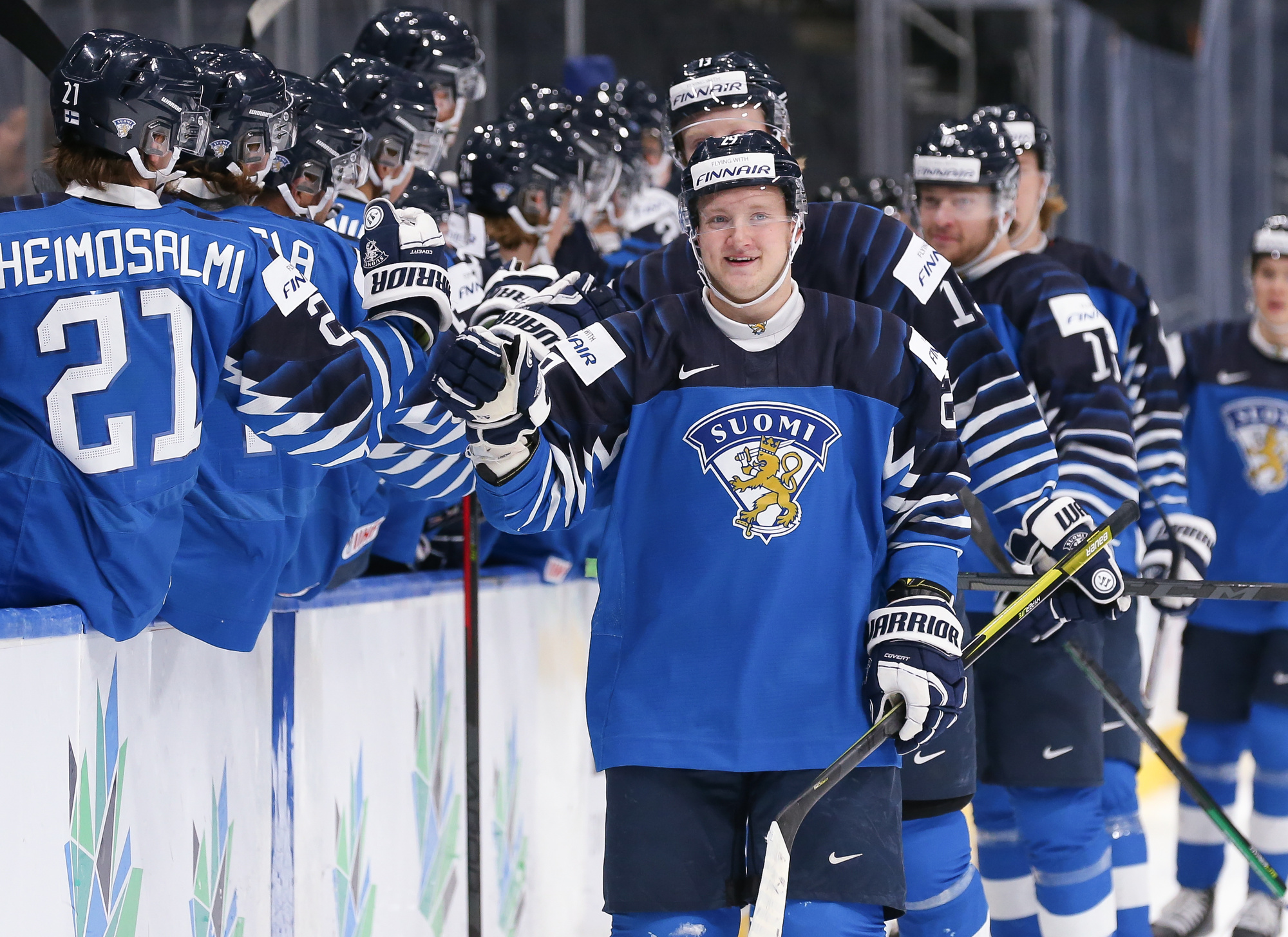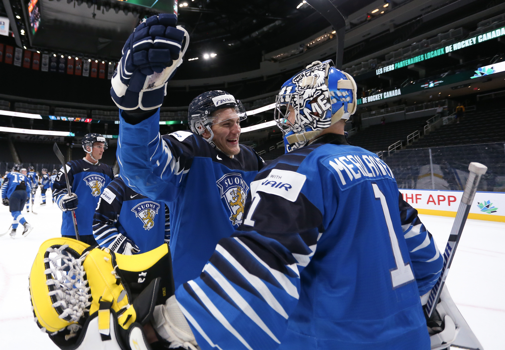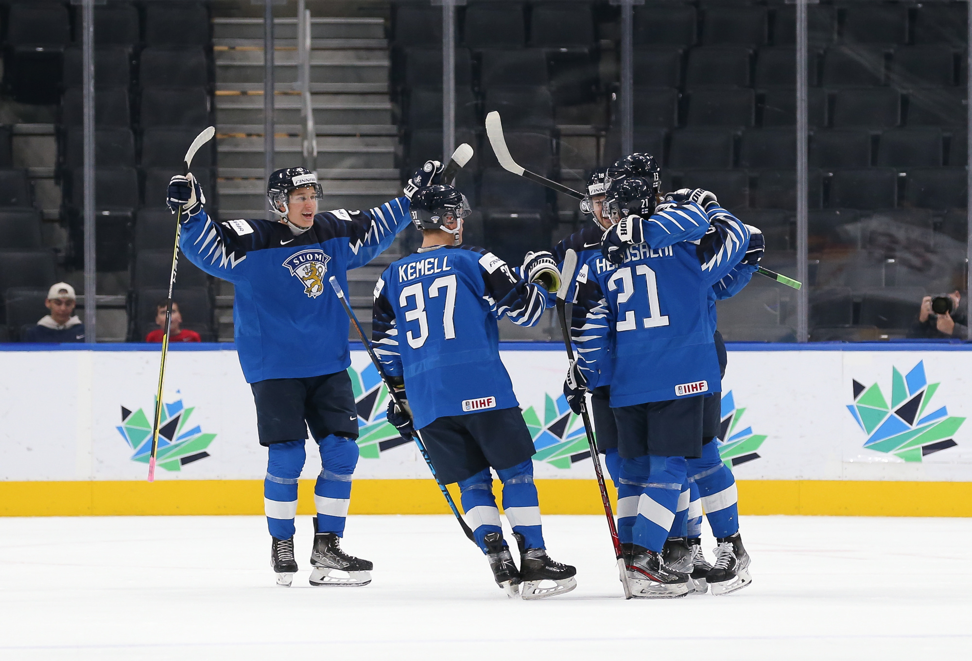 Finland celebrates after captain Roni Hirvonen's first-period power play goal in a 5-2 quarter-final win over Germany at the 2022 IIHF World Junior Championship.