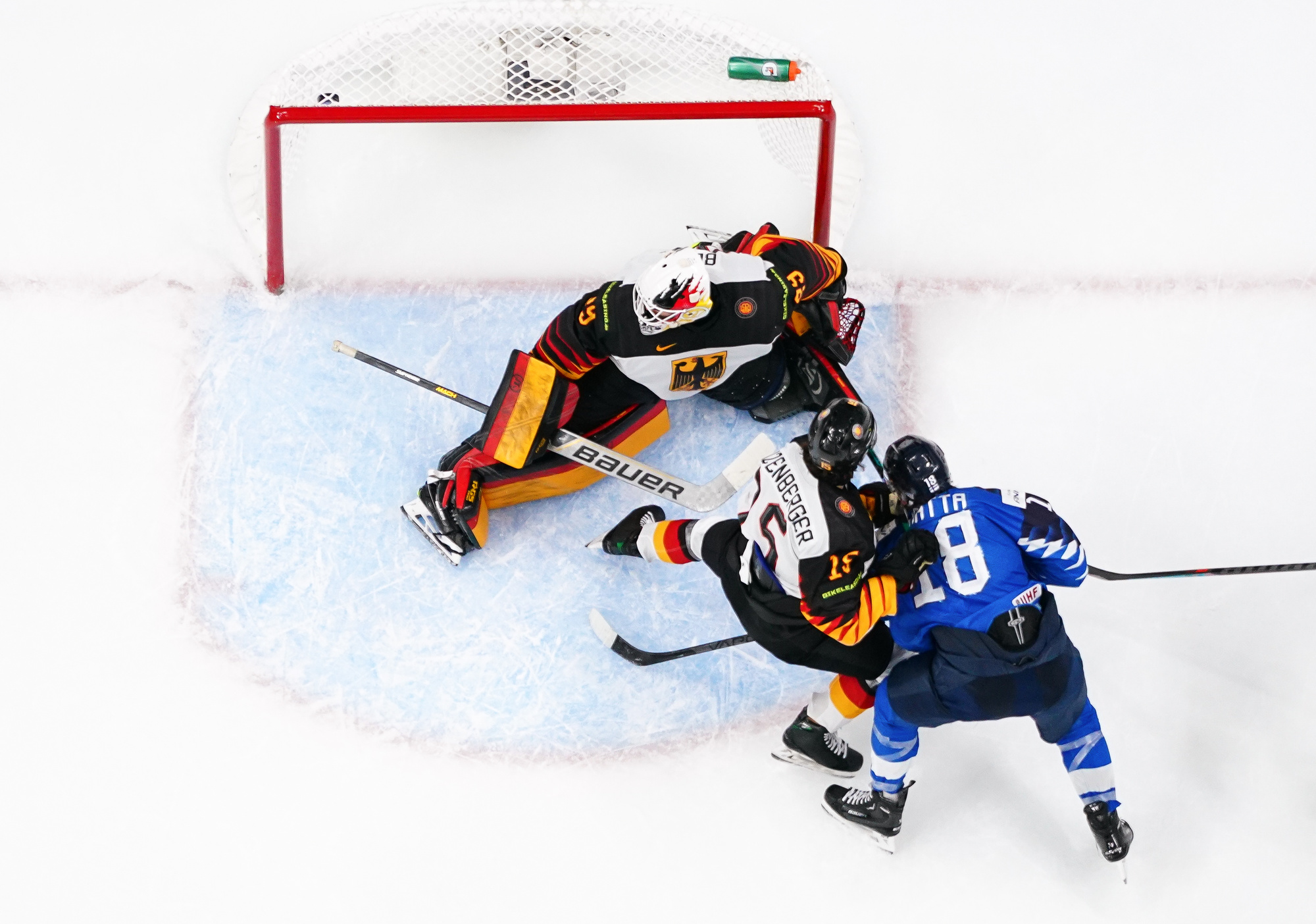 The Germans made it 3-2 on a beautiful power play goal by Rossmy at 17:21. From the top of the right faceoff circle, Haakon Hanelt found Rossmy at Merilainen's crease, and he pivoted to roof a backhander past the Finnish goalie for his fourth goal of the tournament. The power move would have made Sidney Crosby or Leon Draisaitl proud.