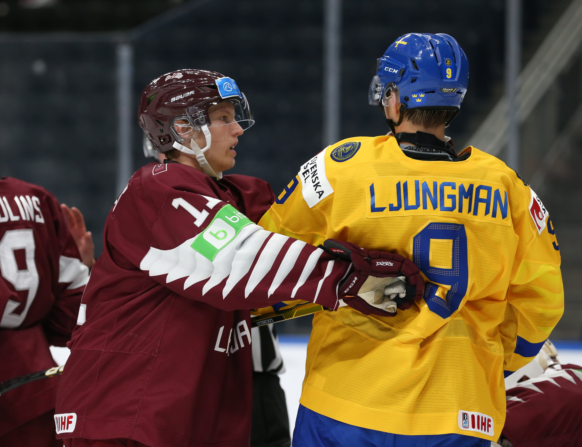 That all changed, however, when Gustavs Ozolins took a cross-checking penalty. Latvia’s Felikss Gavars had a great chance short-handed, racing down the ice on a breakaway, but Liam Ohgren caught up to him and stripped him of the puck before Ozolins could get a shot.