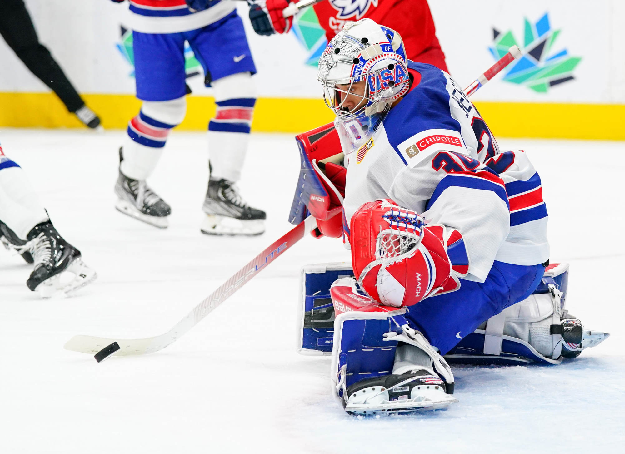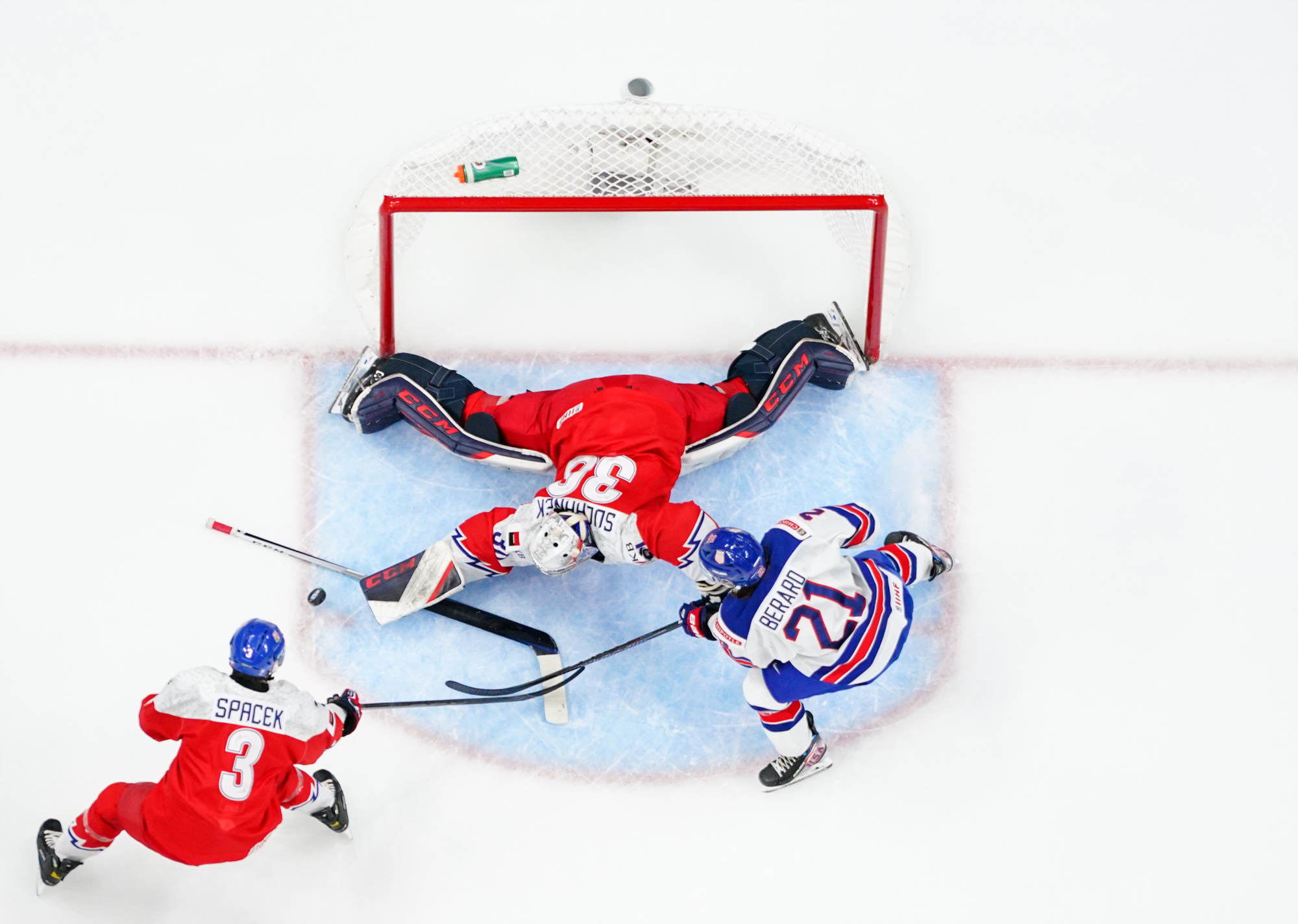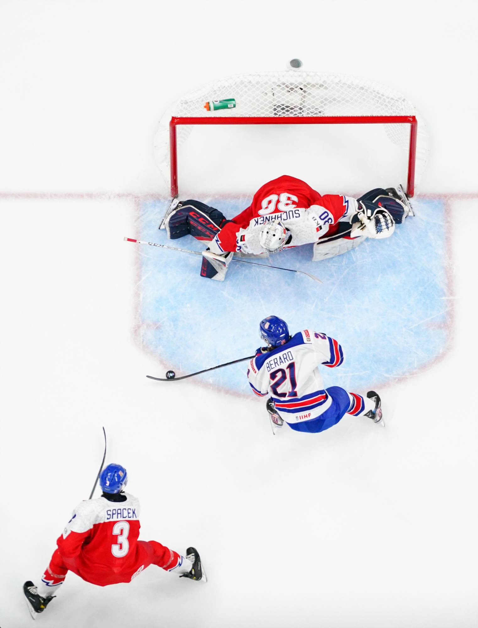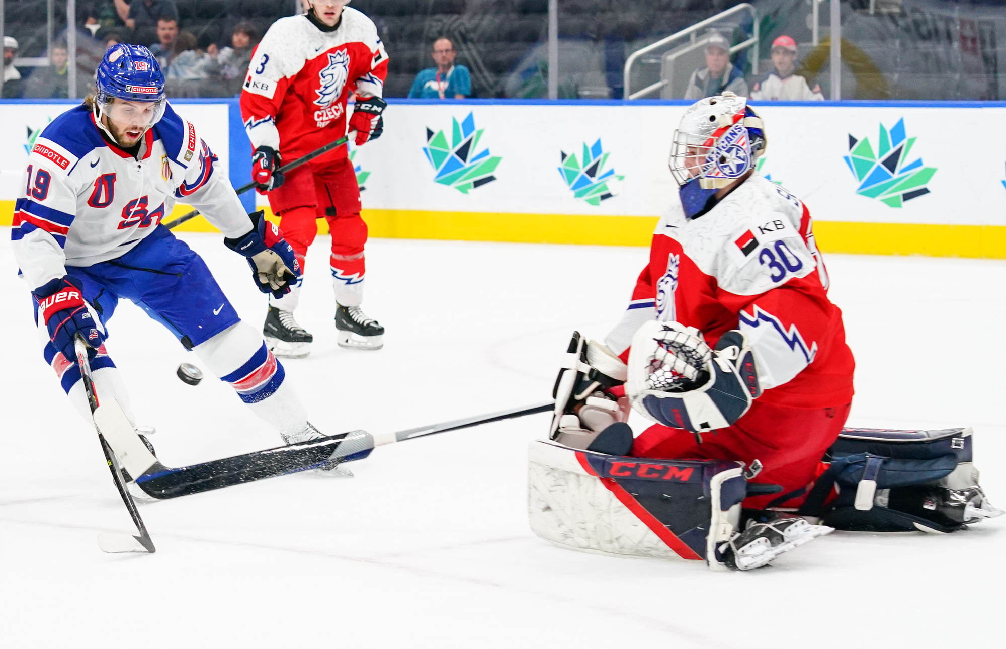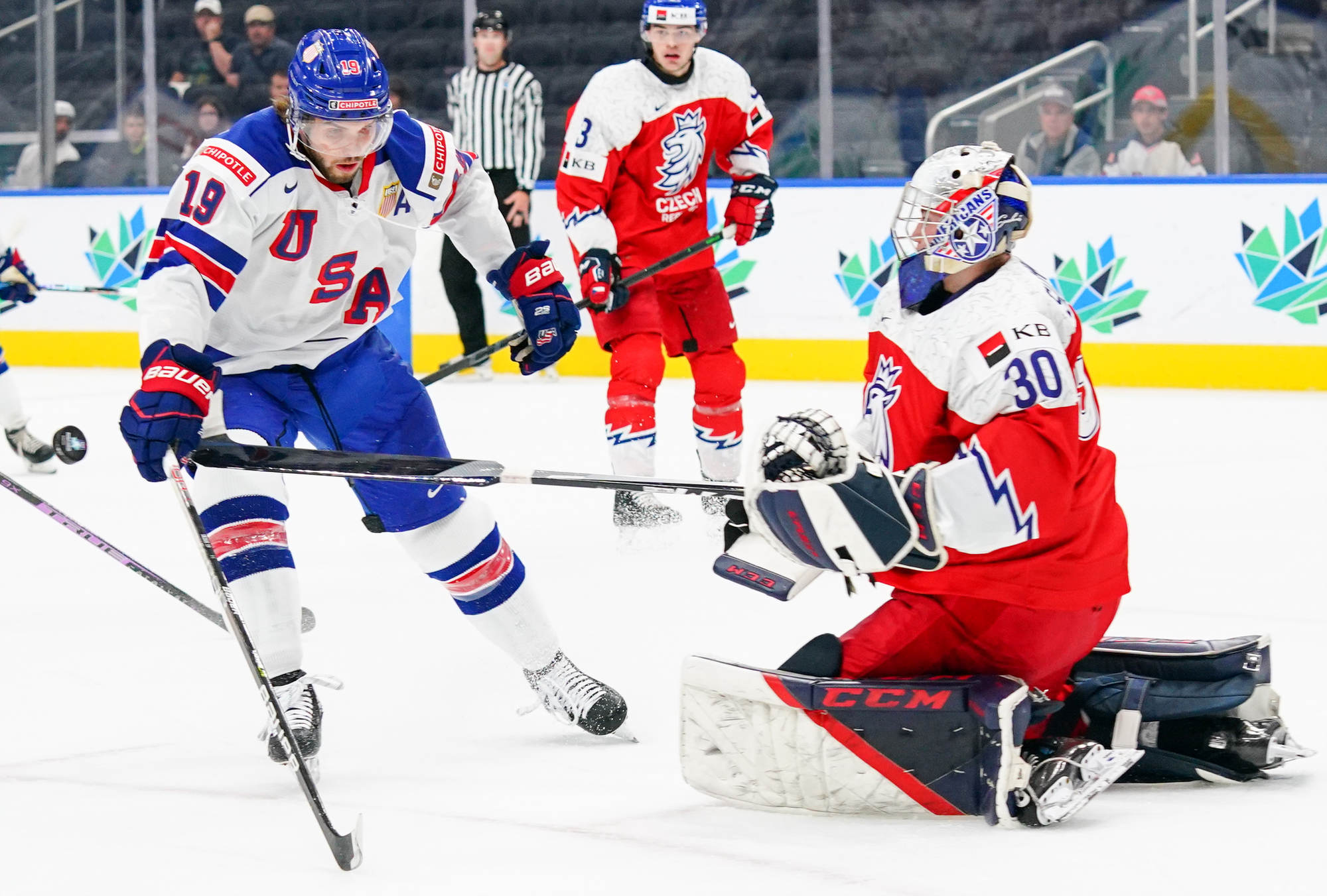 Sure enough, the U.S. cashed in on a scramble in front, Carter Mazur lifting the puck over a sprawled Suchanek at 11:31 to make it a one-goal game. But Czechia managed to contain the damage to that one goal, thanks to Suchanek, who robbed Mazur moments later from in close.