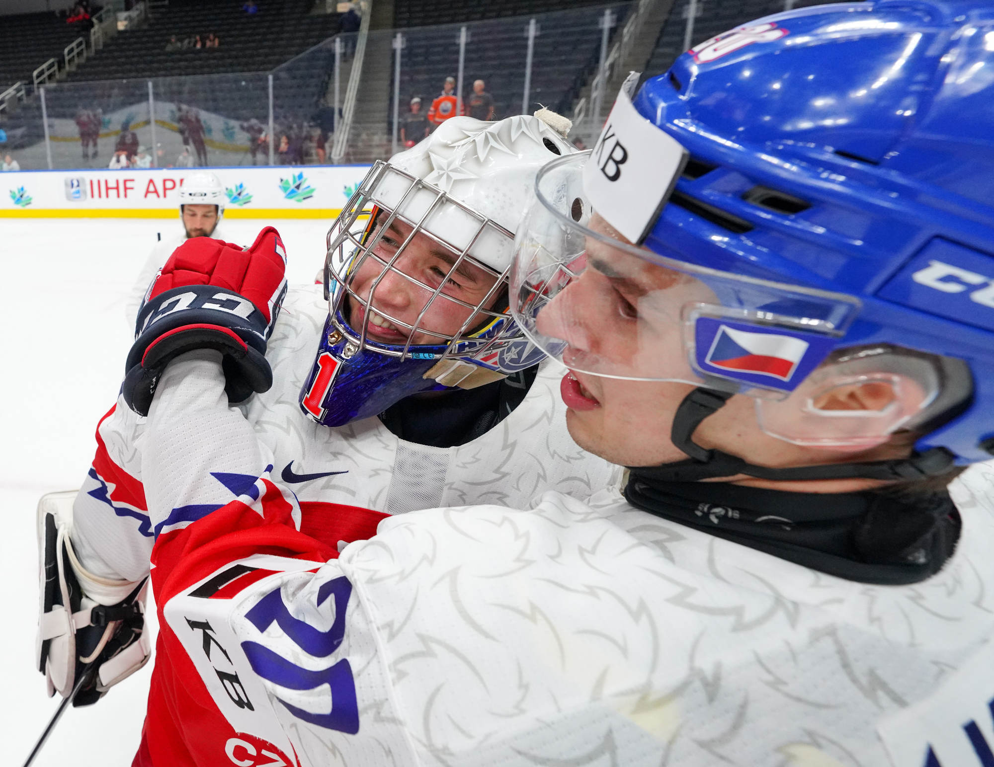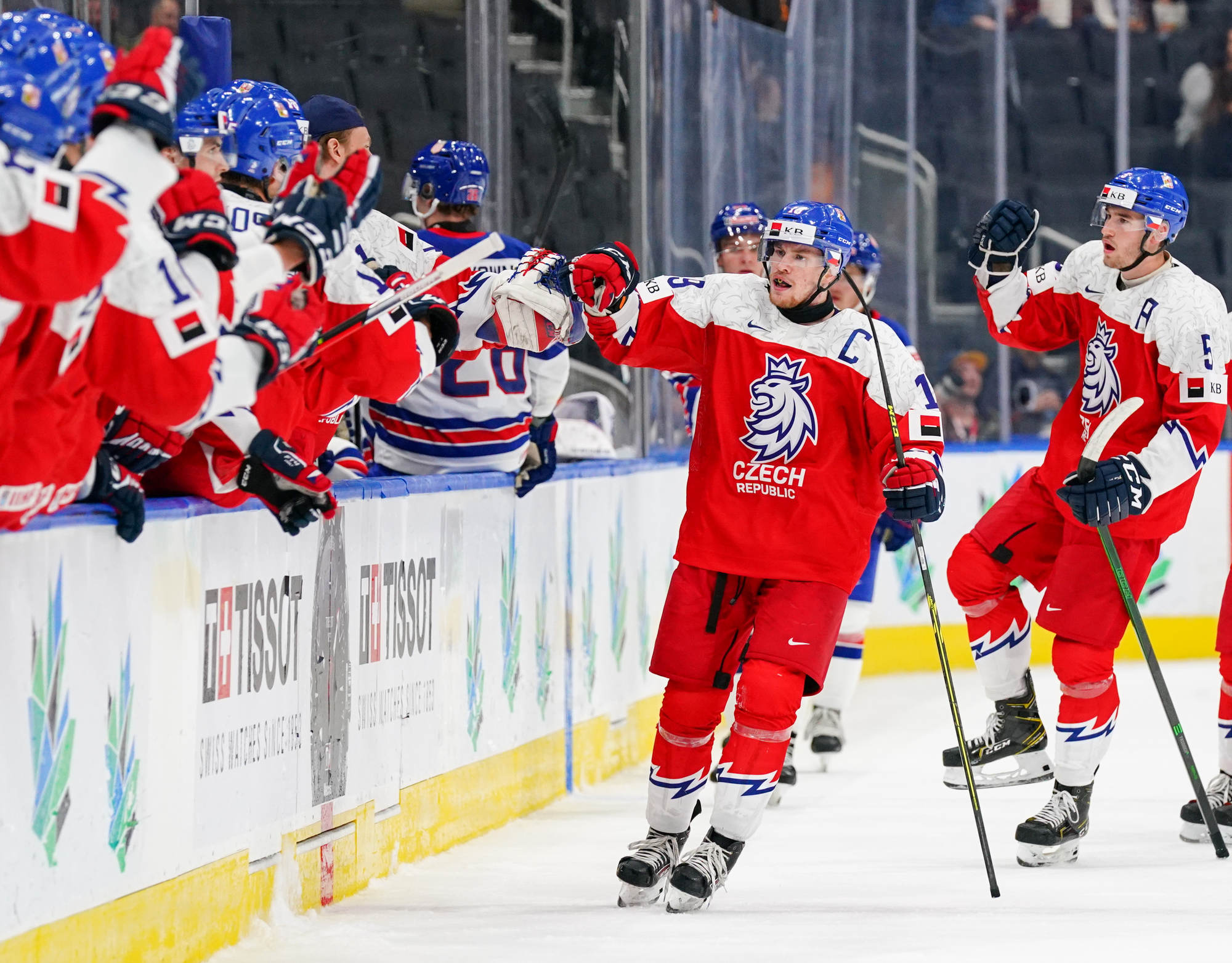 Czechia's Adam Mechura #11 and Ivan Ivan #16 celebrate a goal against Team USA.