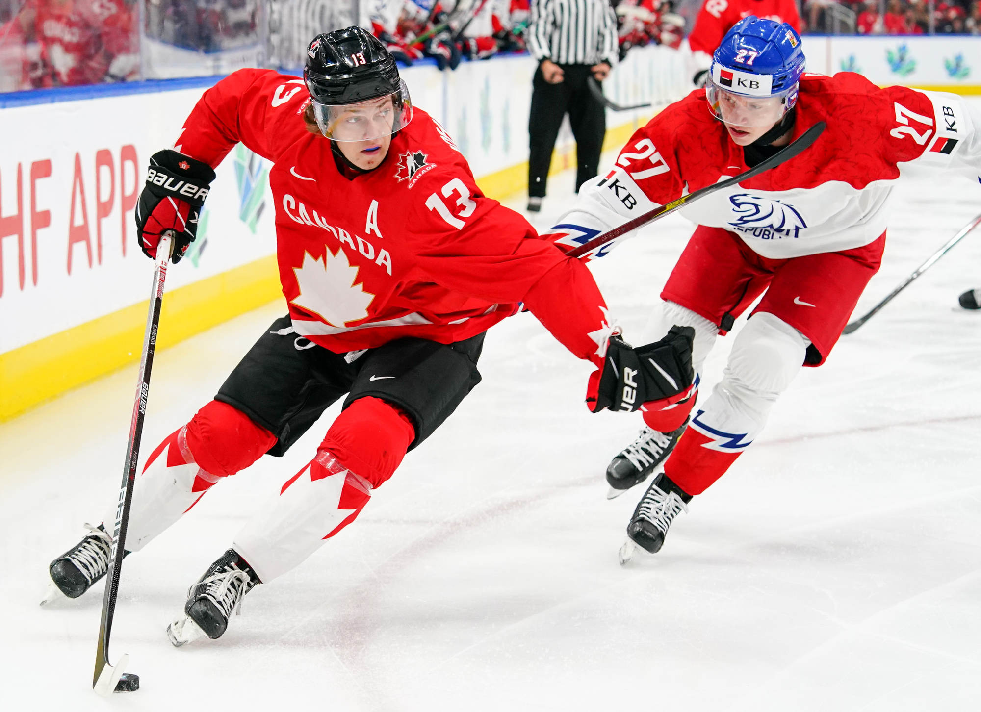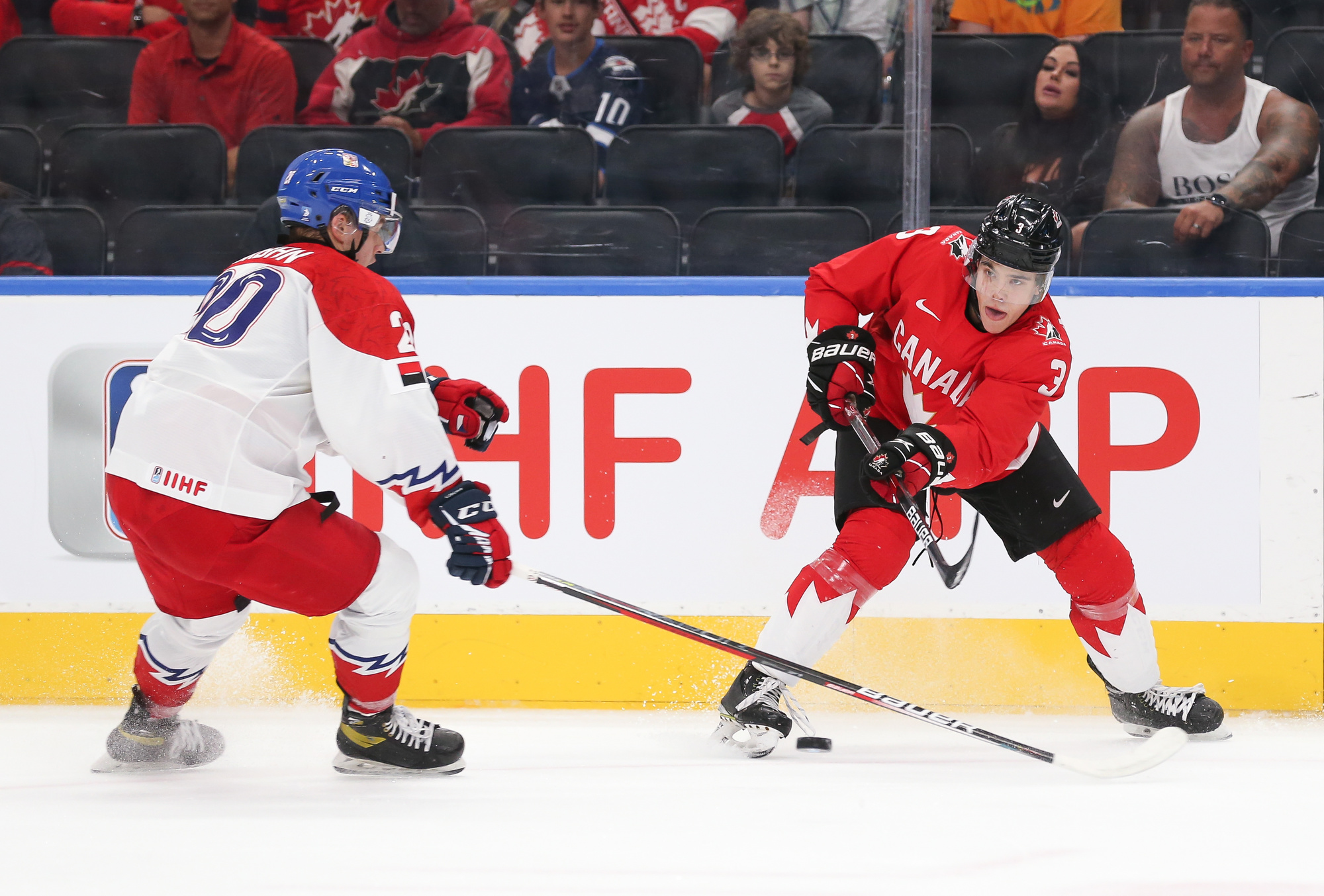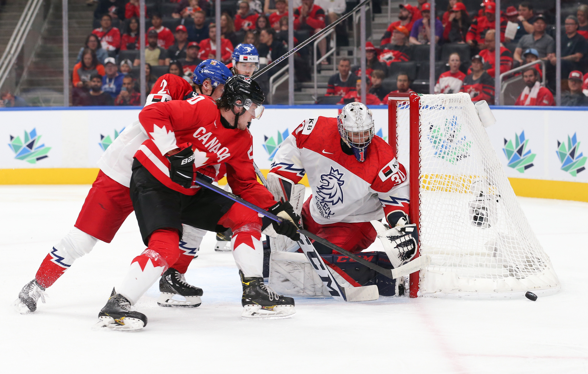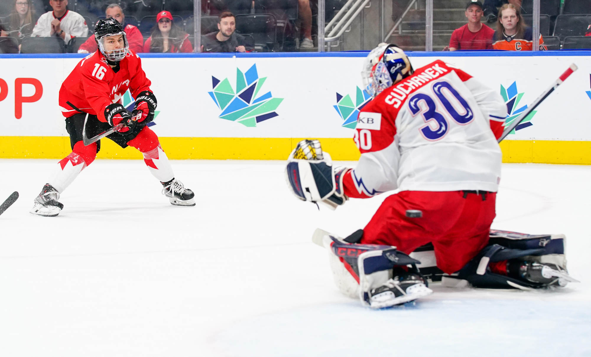 Playing an energetic but patient opening period, Canada scored the only two goals in a period they might have had several more but for the goaltending of Tomas Suchanek. The hosts opened the scoring at 10:04 thanks to the single-minded determination of Stankoven. He twisted and turned down the right side and made a great pass to Tyson Foerster at the side of the goal. Foerster had the open net, but Suchanek dove to make a ridiculous save, only to see the puck squirt out to Stankoven, who didn’t miss.