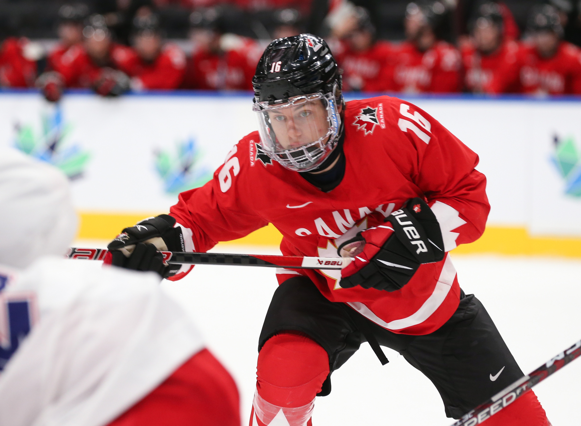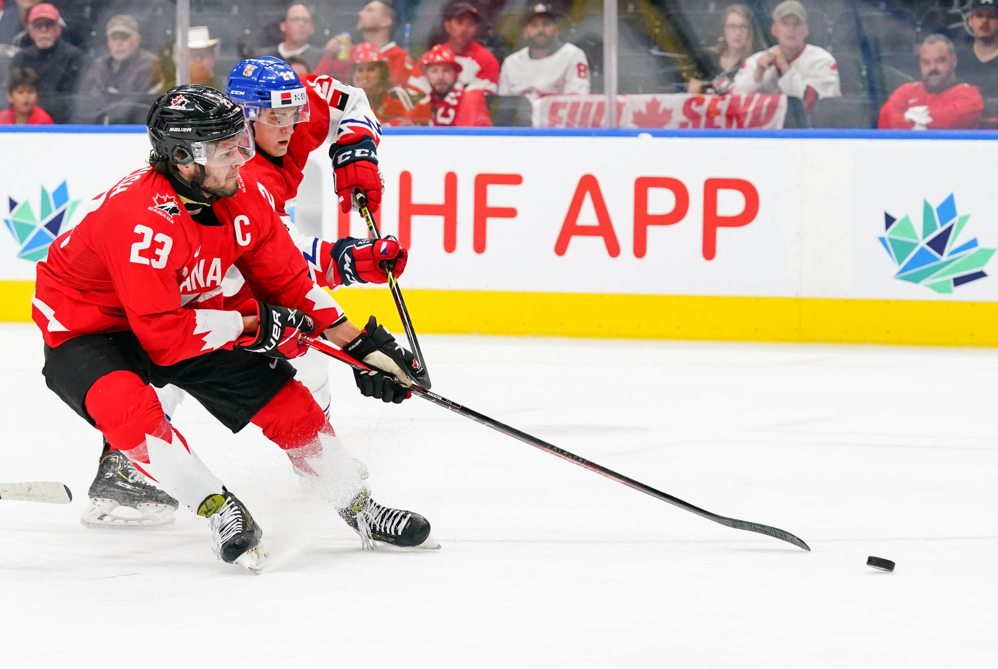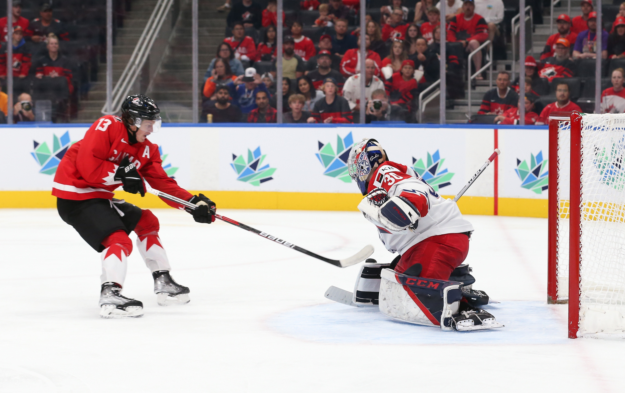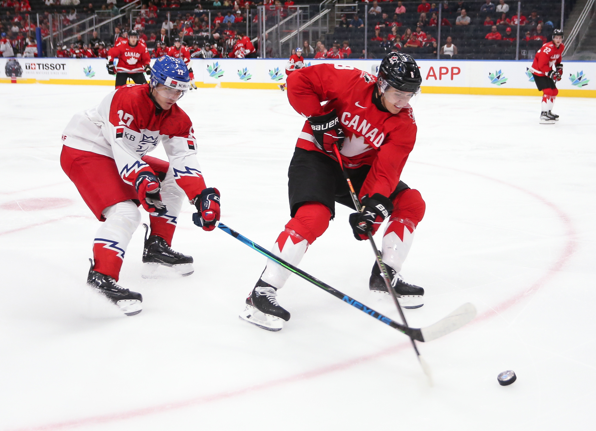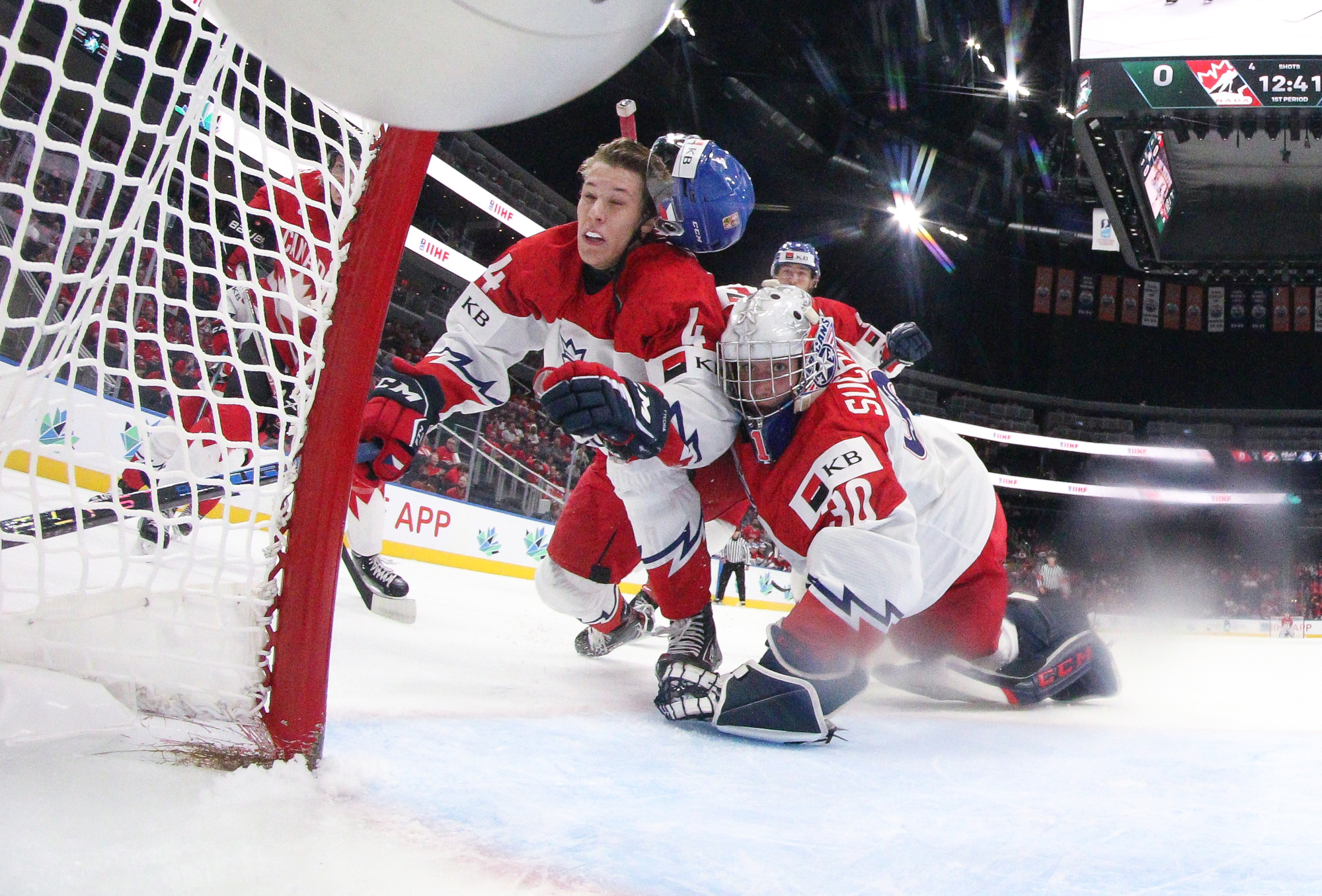 Playing an energetic but patient opening period, Canada scored the only two goals in a period they might have had several more but for the goaltending of Tomas Suchanek. The hosts opened the scoring at 10:04 thanks to the single-minded determination of Stankoven. He twisted and turned down the right side and made a great pass to Tyson Foerster at the side of the goal. Foerster had the open net, but Suchanek dove to make a ridiculous save, only to see the puck squirt out to Stankoven, who didn’t miss.