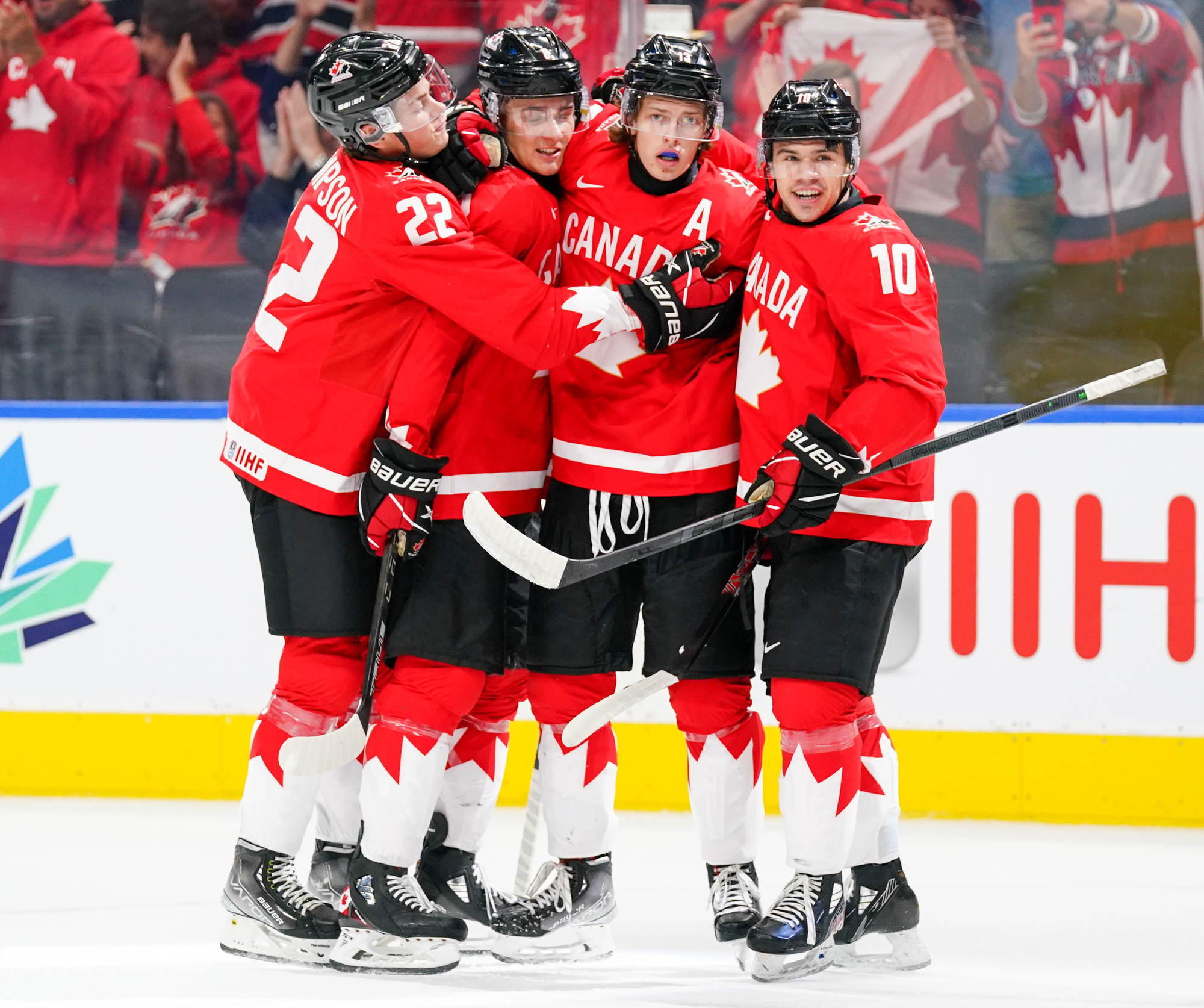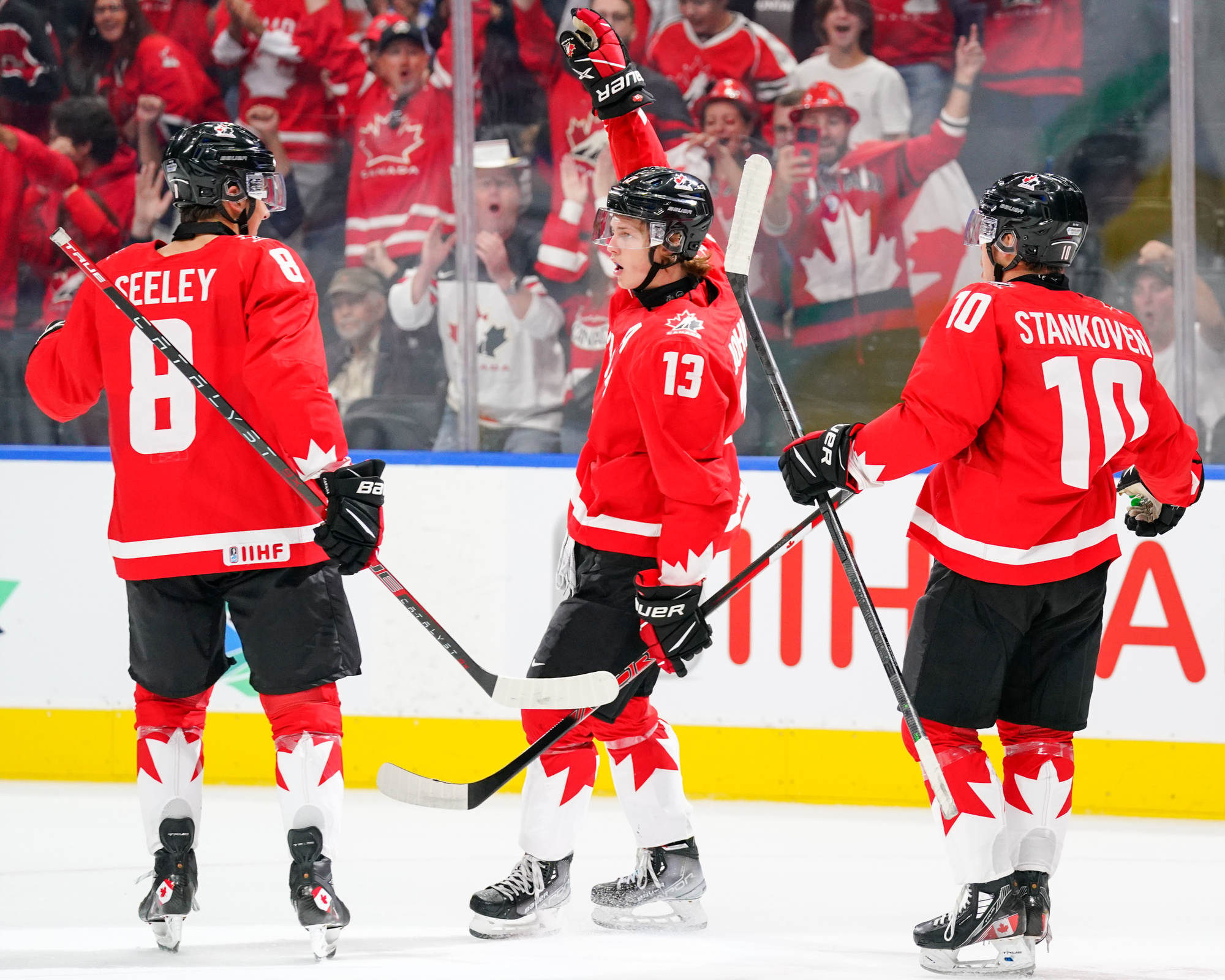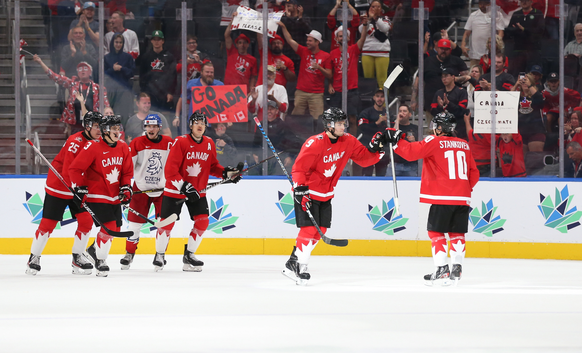 Canada's Logan Stankoven (#10) celebrates his second-period goal against Czechia with his teammates.