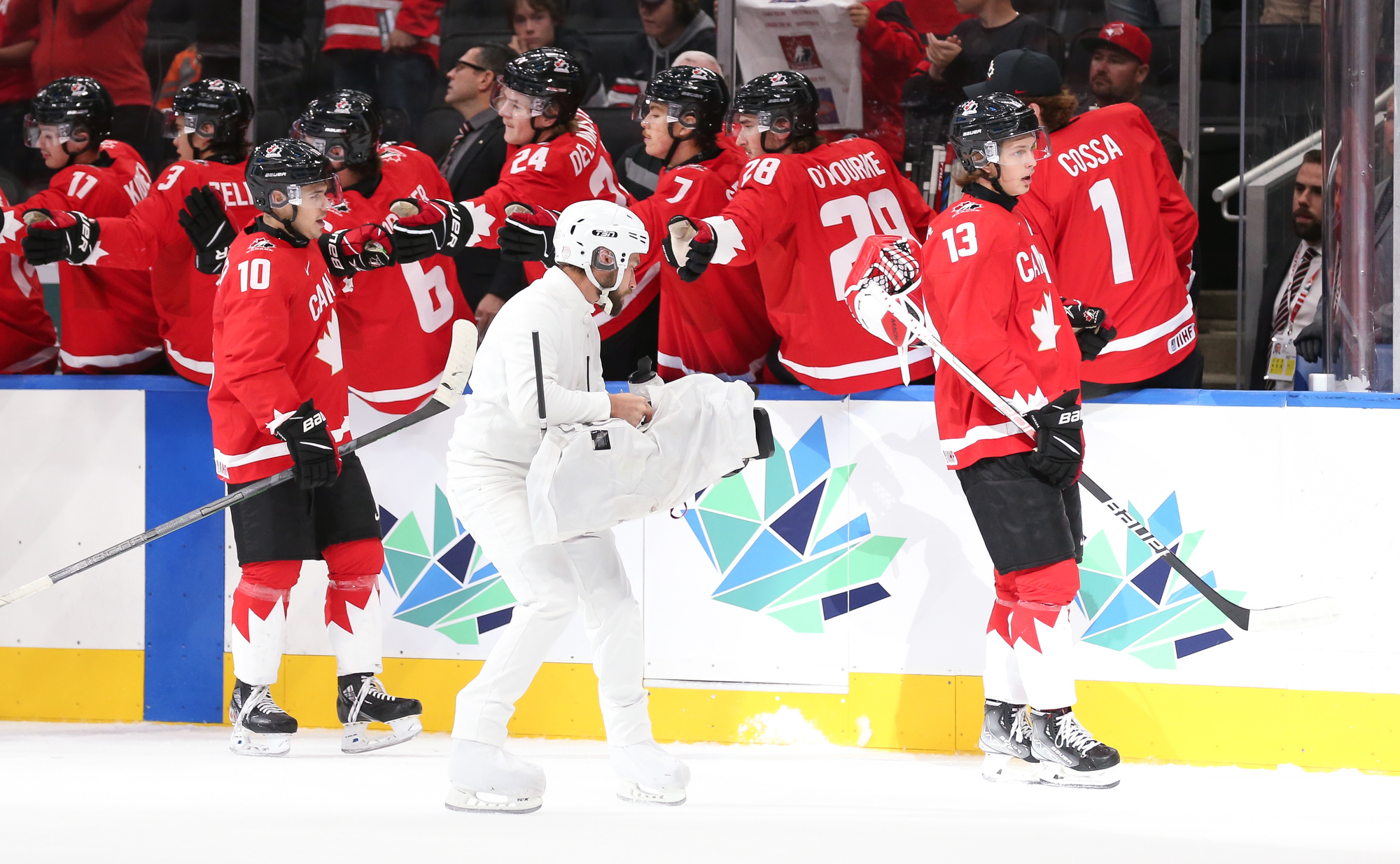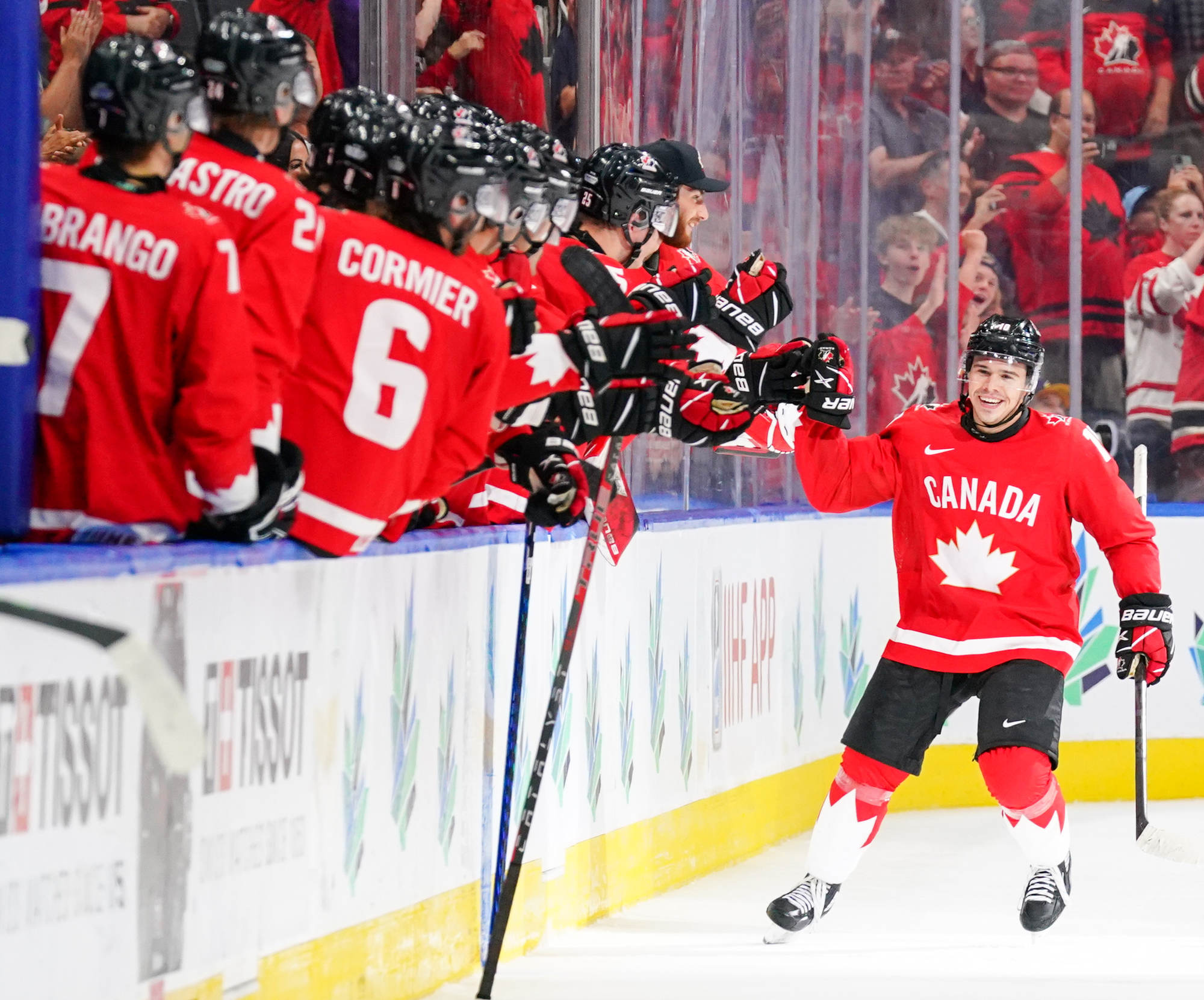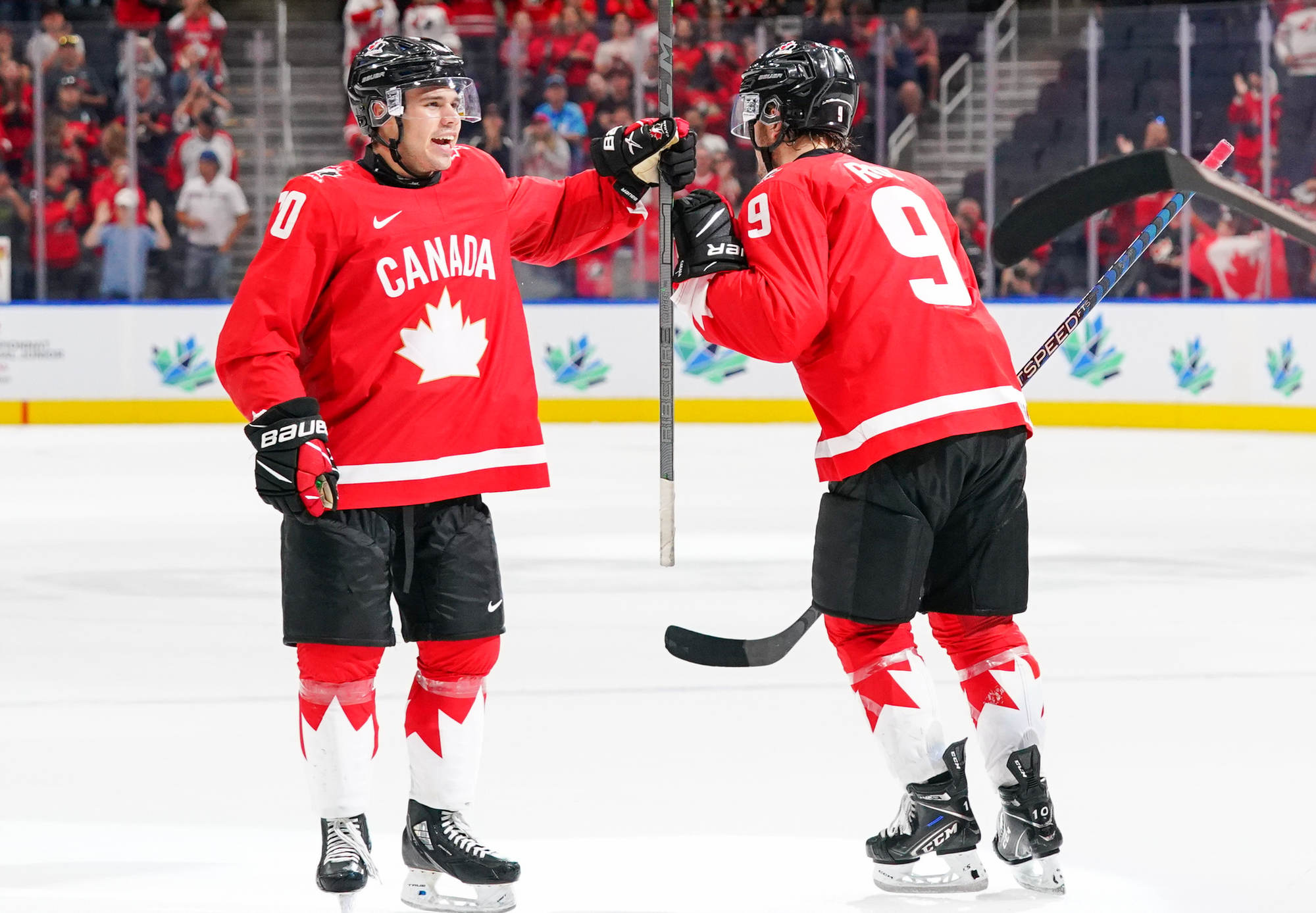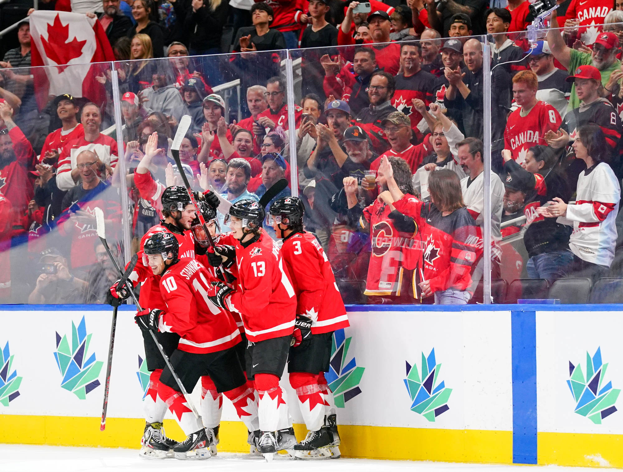 Canada's Logan Stankoven (#10) celebrates his second-period goal against Czechia with his teammates.