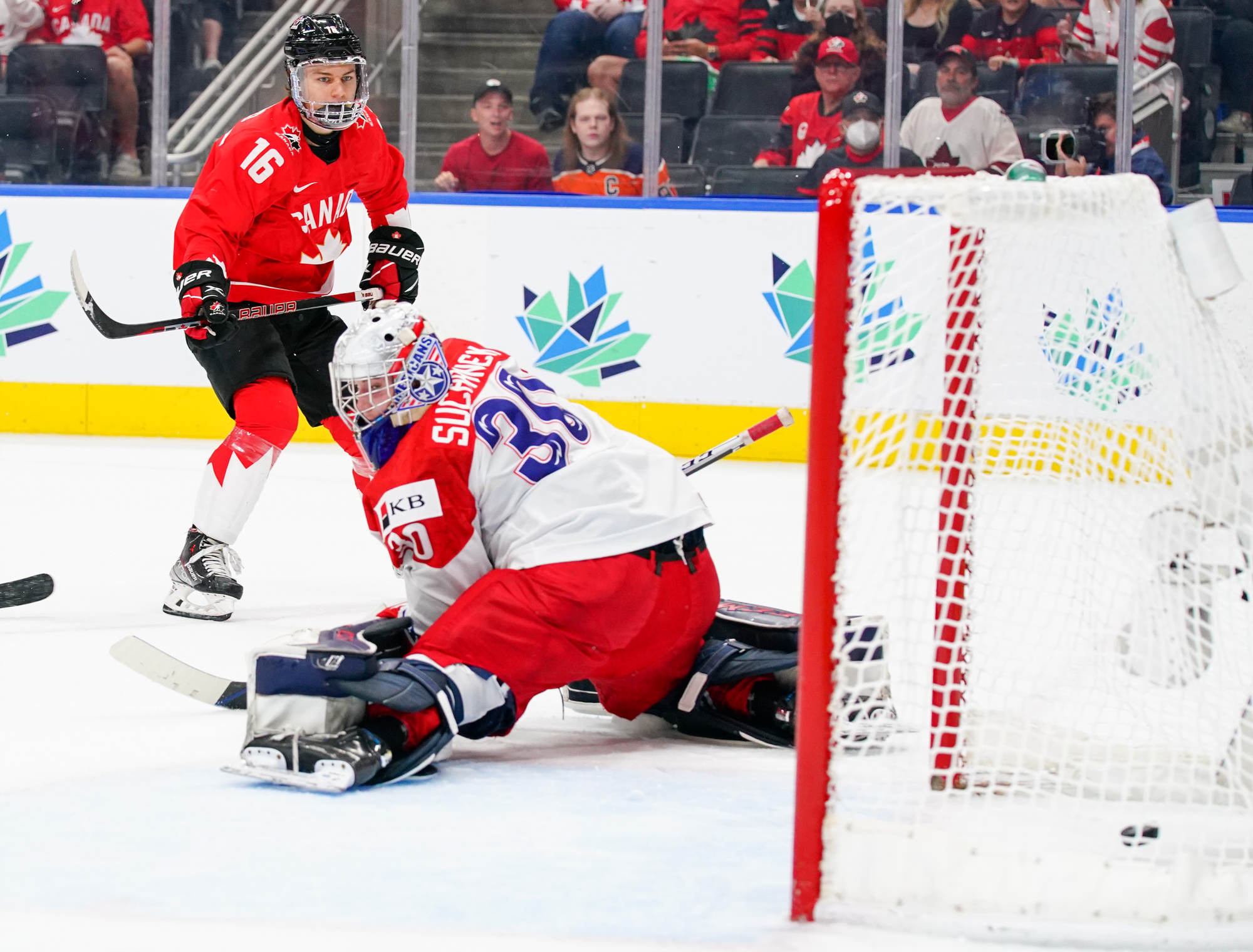 Five minutes later, the 17-year-old Bedard added another chapter to the book called “Here’s why he’ll be drafted number one next year.” He took a long pass from Nathan Gaucher and went in from a bit of a bad angle down the left side. But scorers score, and Bedard found a small opening under the glove of Suchanek, and that’s where he wired a shot to make it 2-0 Canada.