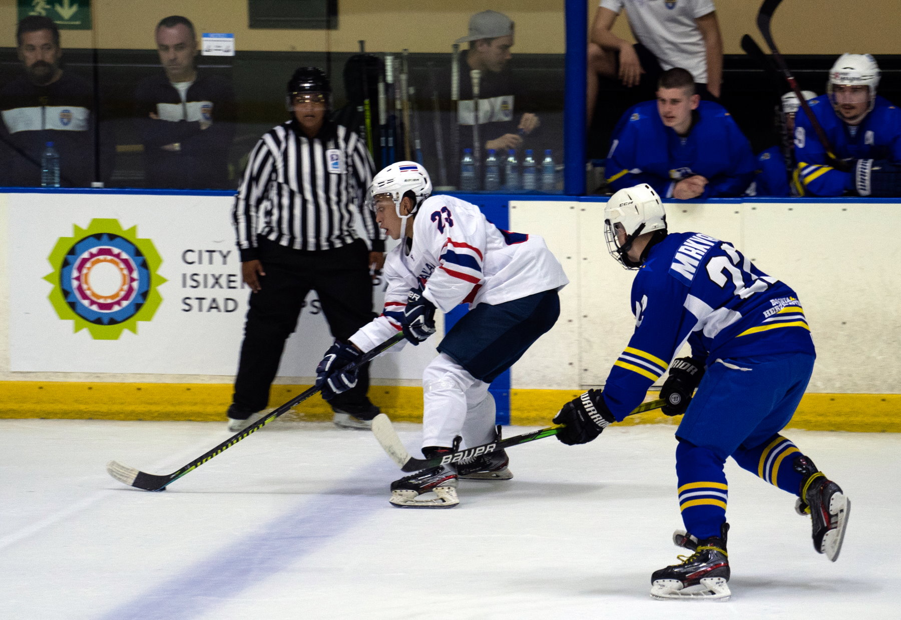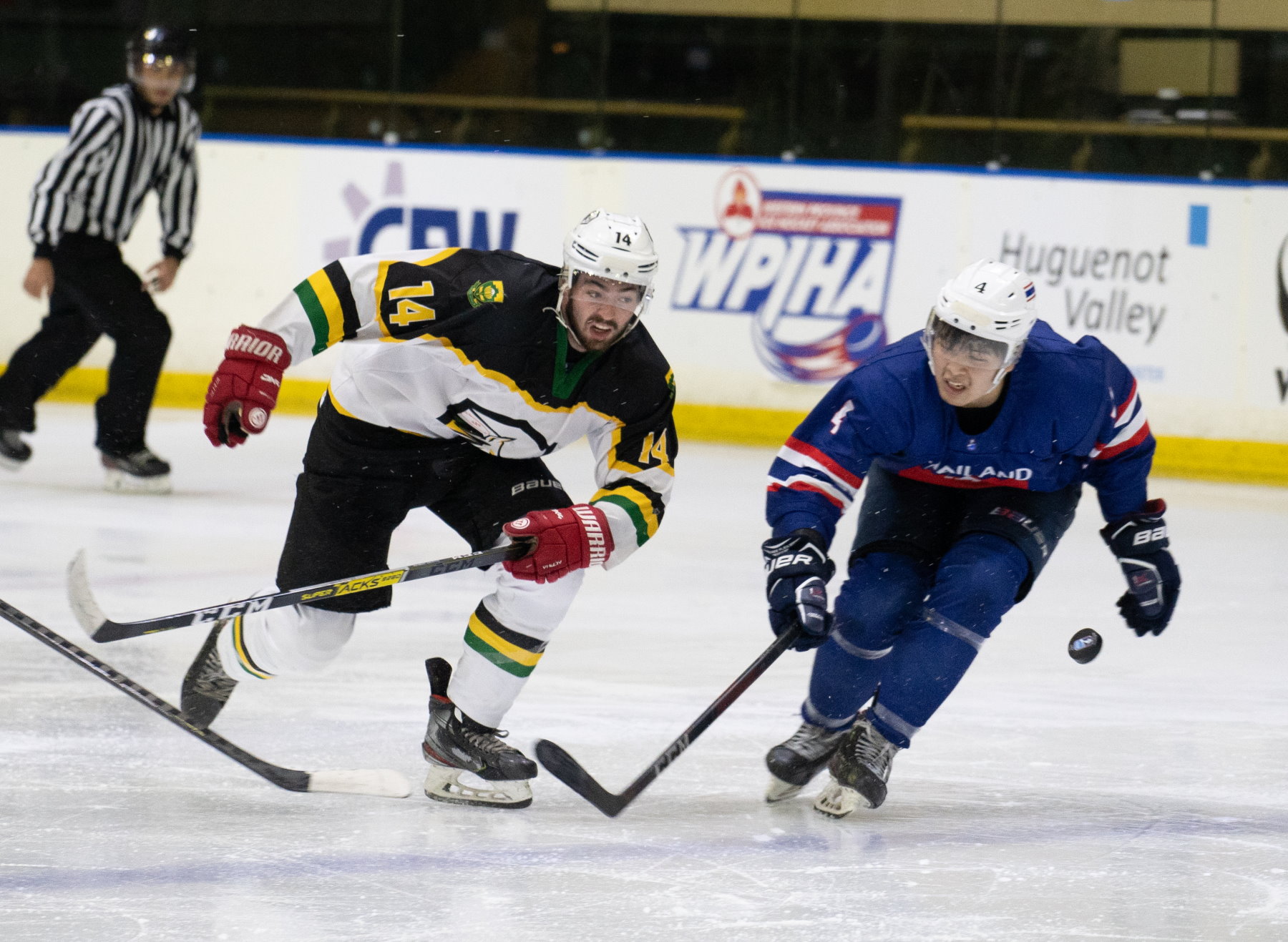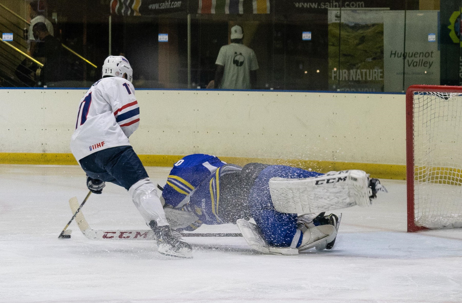 Despite losing the earlier meeting between the two countries, Thailand showed enough to suggest that it could be competitive against South Africa. And on Friday the visitor’s first-period performance was good enough to blow the whole tournament wide open. Two goals from Nattasate Phatigulsate sandwiched another from Phanaruj Surachiwat as the Thais stomped into a 3-0 lead. Early in the second, Surachiwat got his second of the game and suddenly Thailand was on course for gold.Then it all began to change. South Africa was always competitive in this game but struggled to turn chances into goals. However, in the 36th minute captain Uthmann Samaai set up John Ventner at the point and the defender’s shot, although it lacked power, somehow squirmed through the equipment of goalie Benjamin Kleinechay. Thailand still had a commanding lead in the game, but South Africa was back on top in the standings.