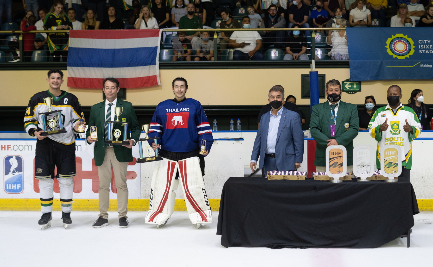 Thailand’s Isaksson, who played in Lulea’s junior system, finished as the tournament’s leading scorer with 12 (5+7) points. But South Africa’s Samaai, a Cape Town native in his 11th season of IIHF play, was named as top forward for the tournament. He had nine points and, crucially, masterminded his team’s recovery in Friday’s big showdown. Team-mate Cameron Birrell, also representing his country for the 11th time in senior World Championship play, was chosen as best defender. “He’s our best player,” added Samaai. “He was working for us throughout the tournament and then he got injured in the first period [of Friday’s game]. We put it all on the line and we got the job done for him.”Among the netminders, Thailand’s Kleinechay showed why he’s nicknamed ‘The Wall’. The Minnesota-born goalie had a busy tournament, facing 164 shots in total and returning the best save percentage of the three to take the directorate’s top goalie prize. South Africa’s ‘Spiderman’, Ryan Boyd ranked second ahead of Bosnia’s Dino Pasovic.