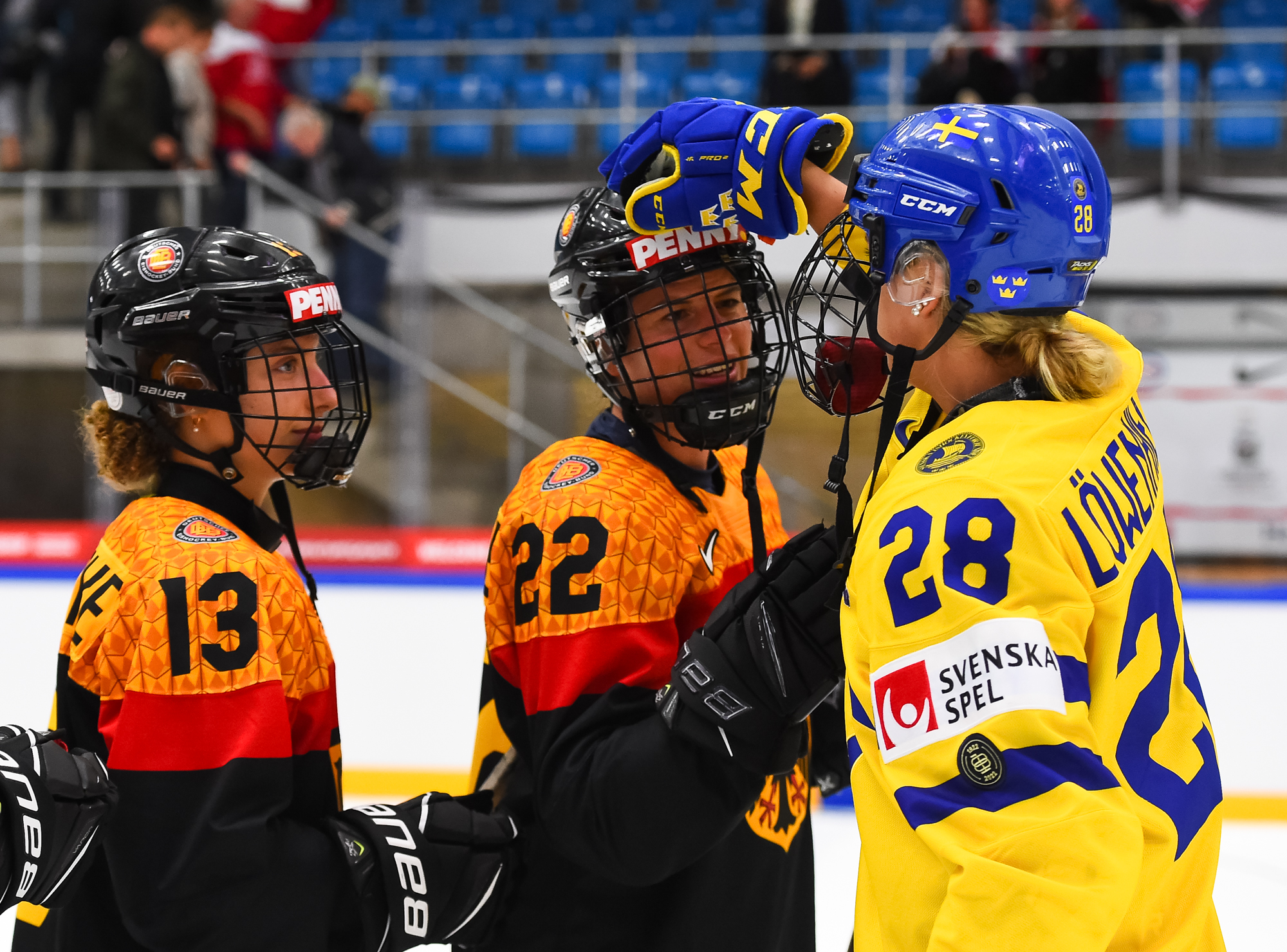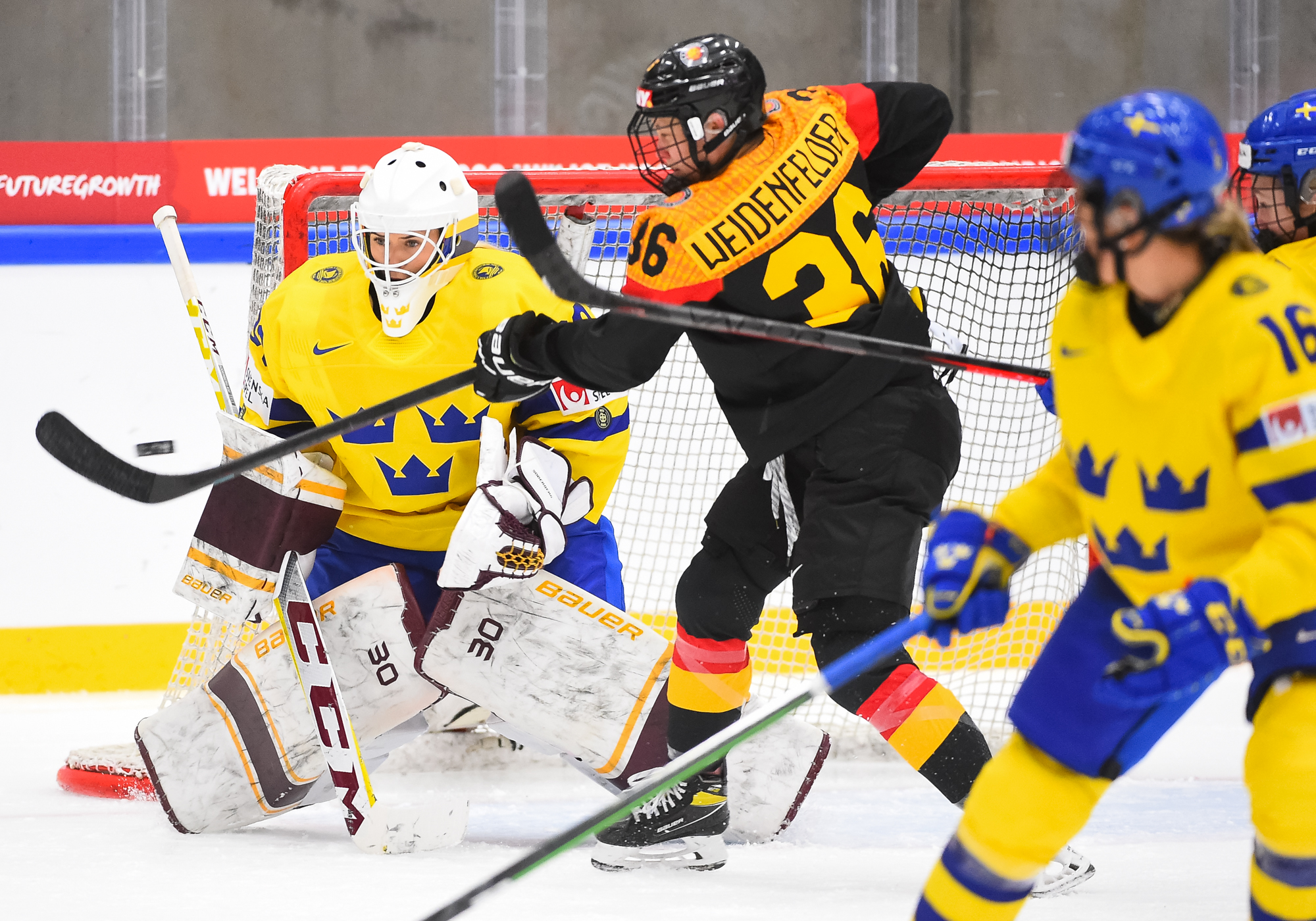 Germany’s line of Bernadette Karpf and Luisa and Lilli Welcke put the pressure on Soderberg in the third period, with a wrap around attempt and a scramble in front that sent a loose puck on top of the net. Sweden responded with another goal to go up 3-0, a shot from defender Paula Bergstrom that fell awkwardly behind Abstreiter and across the line.