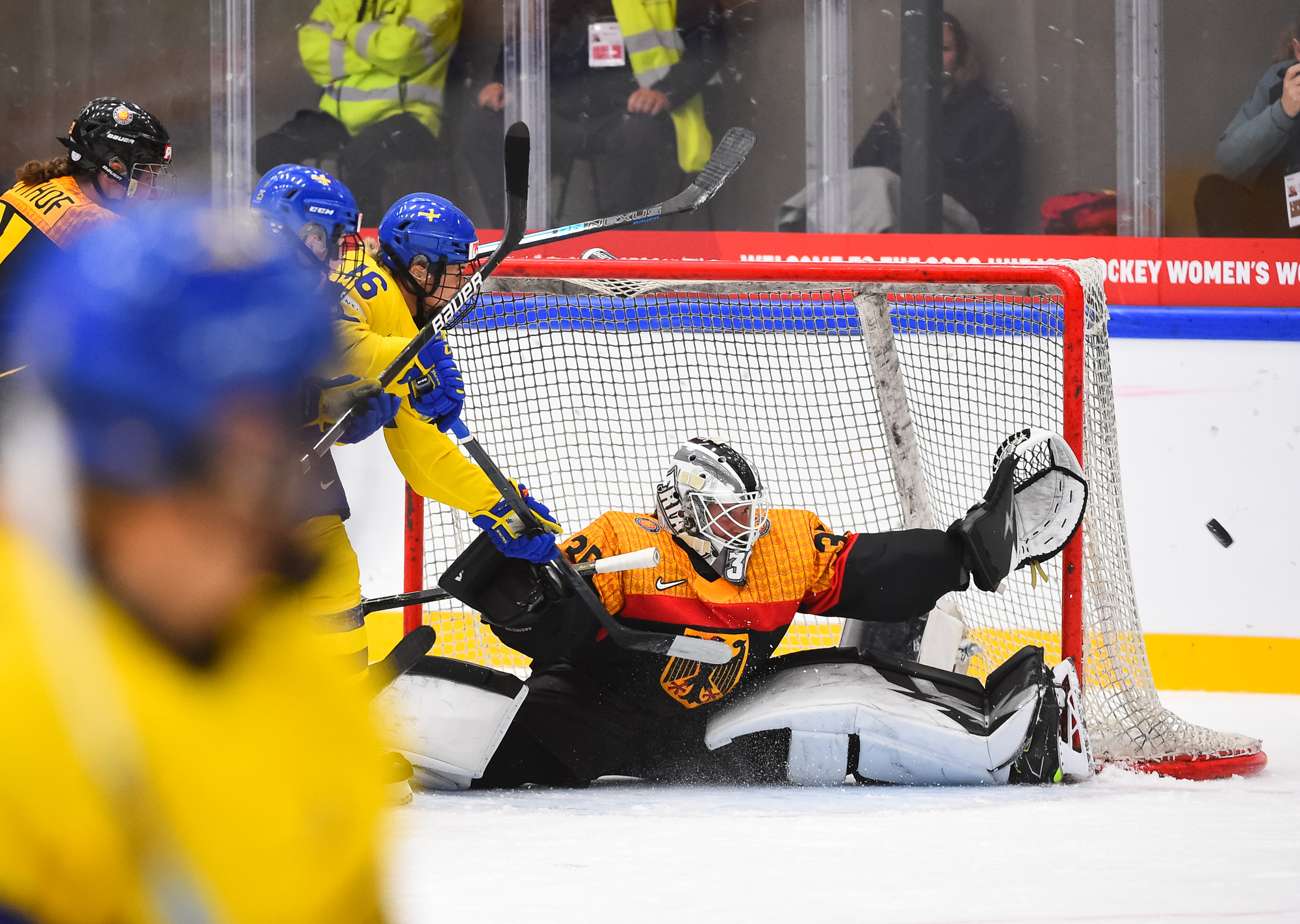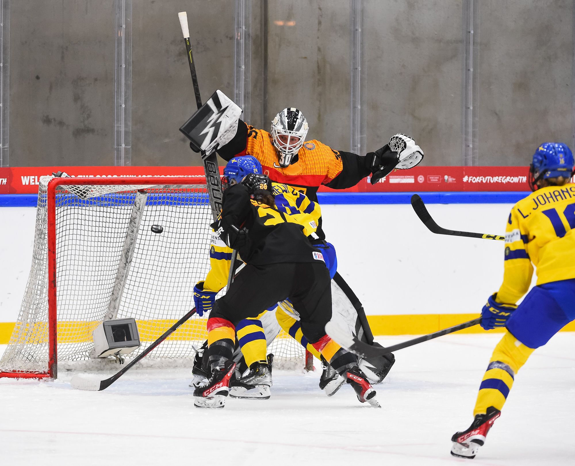 Germany changed up their goaltending for this game, with Abstreiter getting the start over Franziska Albl. In the first period, she made saves off of a one-timer from Hanna Olsson and a point blank shot from Mira Jungaker.