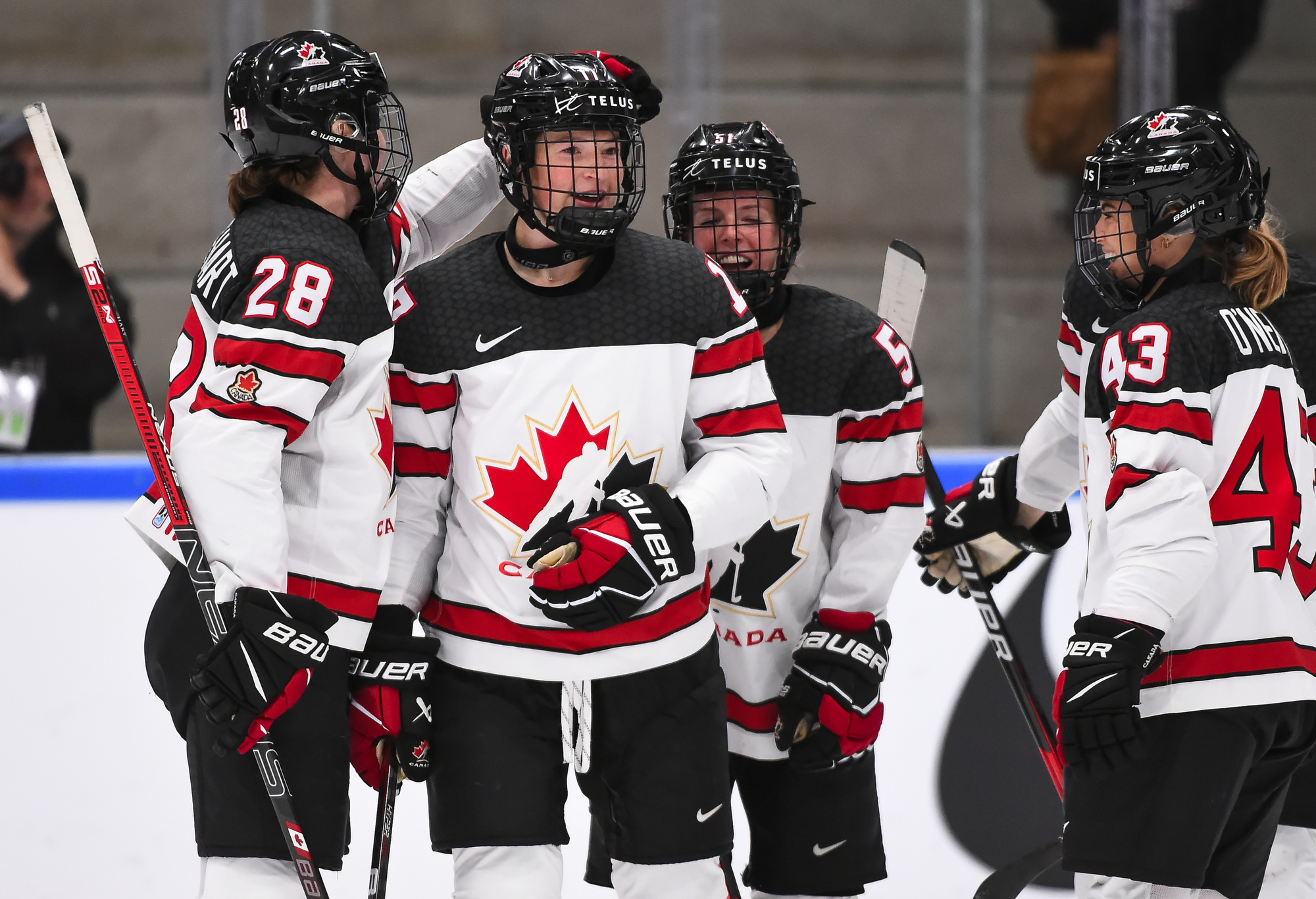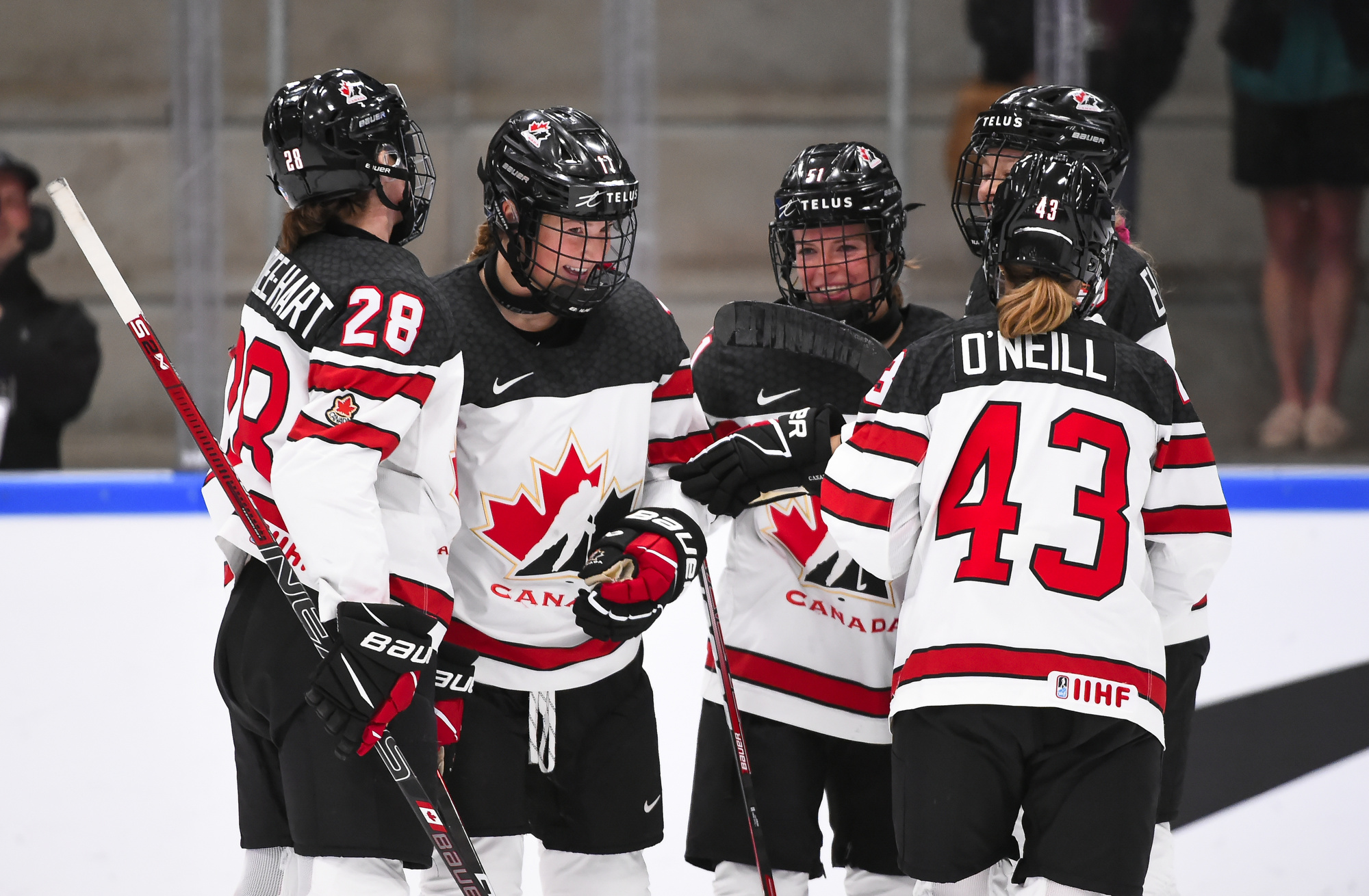 Canada's Ella Shelton #17 celebrates with Micah Zandee-Hart #28, Victoria Bach #51, Jessie Eldridge #9 and Kristin O'Neill #43 after scoring a goal against Japan.