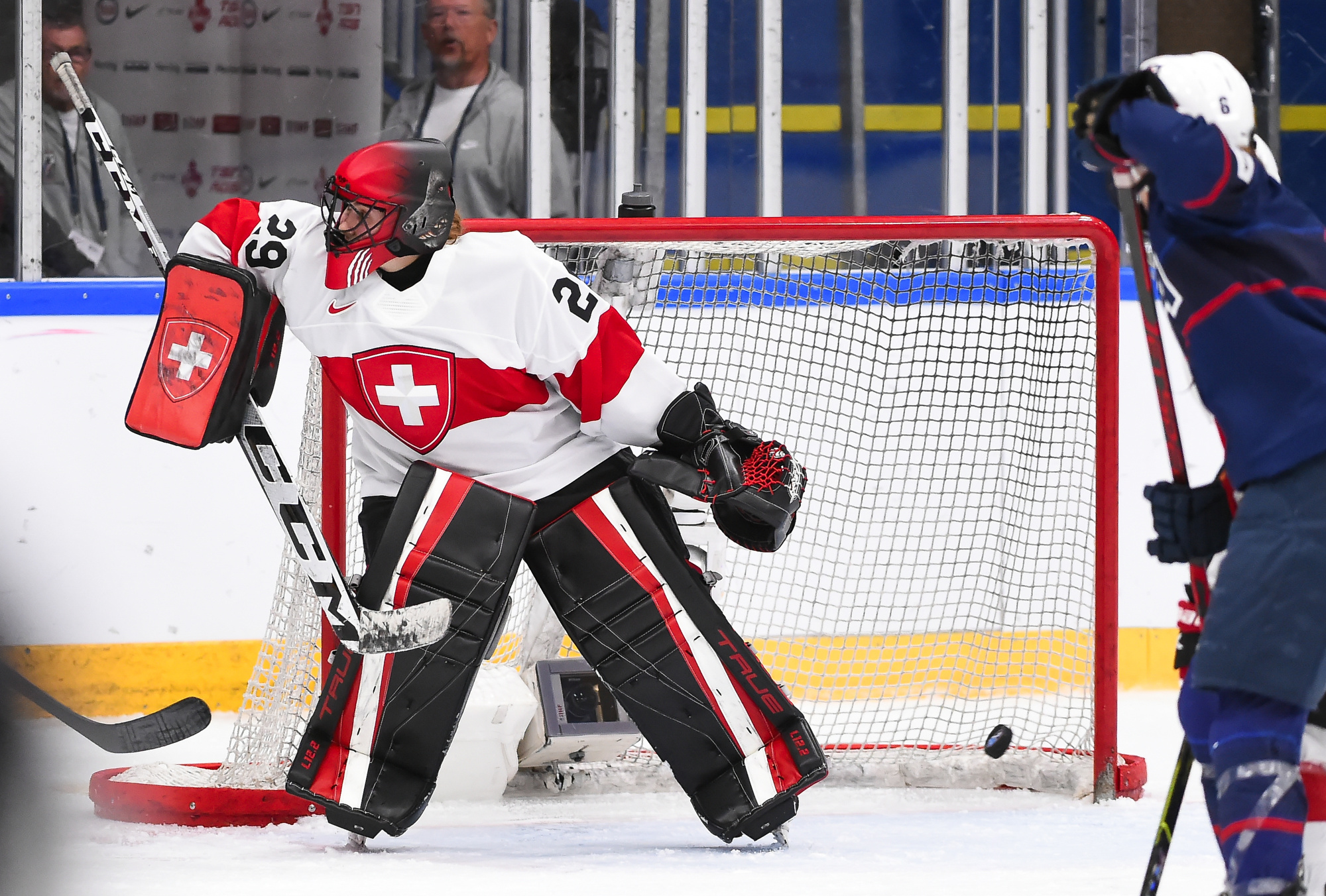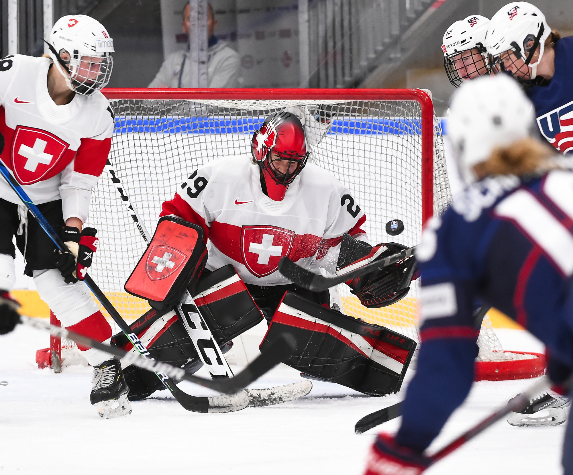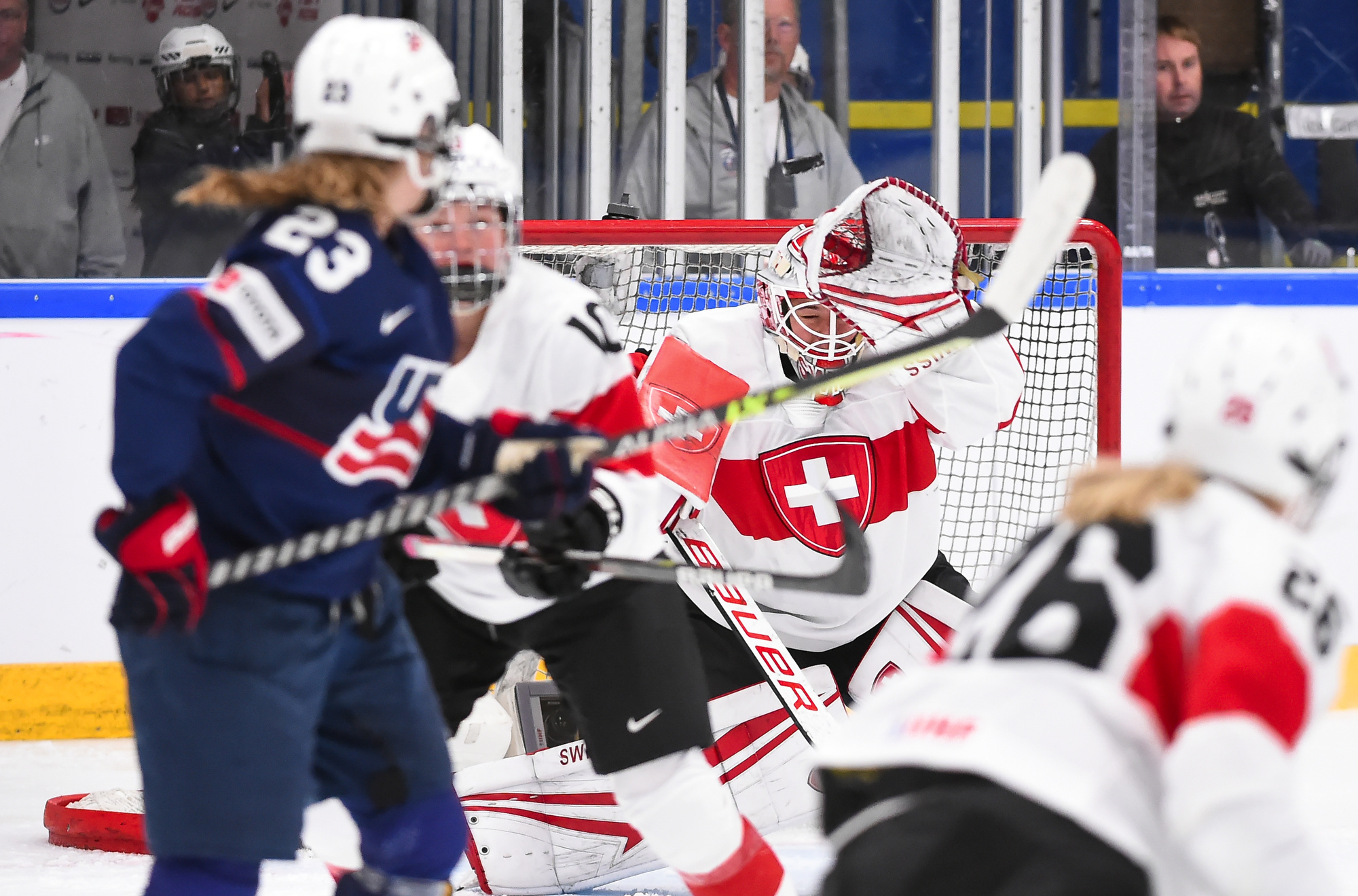 Maddie Rooney had to stop a mere four shots (1-2-1) to record the fourth shutout of her career in five Women's Worlds games. She now has a 5-0 record in WW history and has allowed just one goal. Two Swiss goalies faced a barrage of 57 shots at the other end.