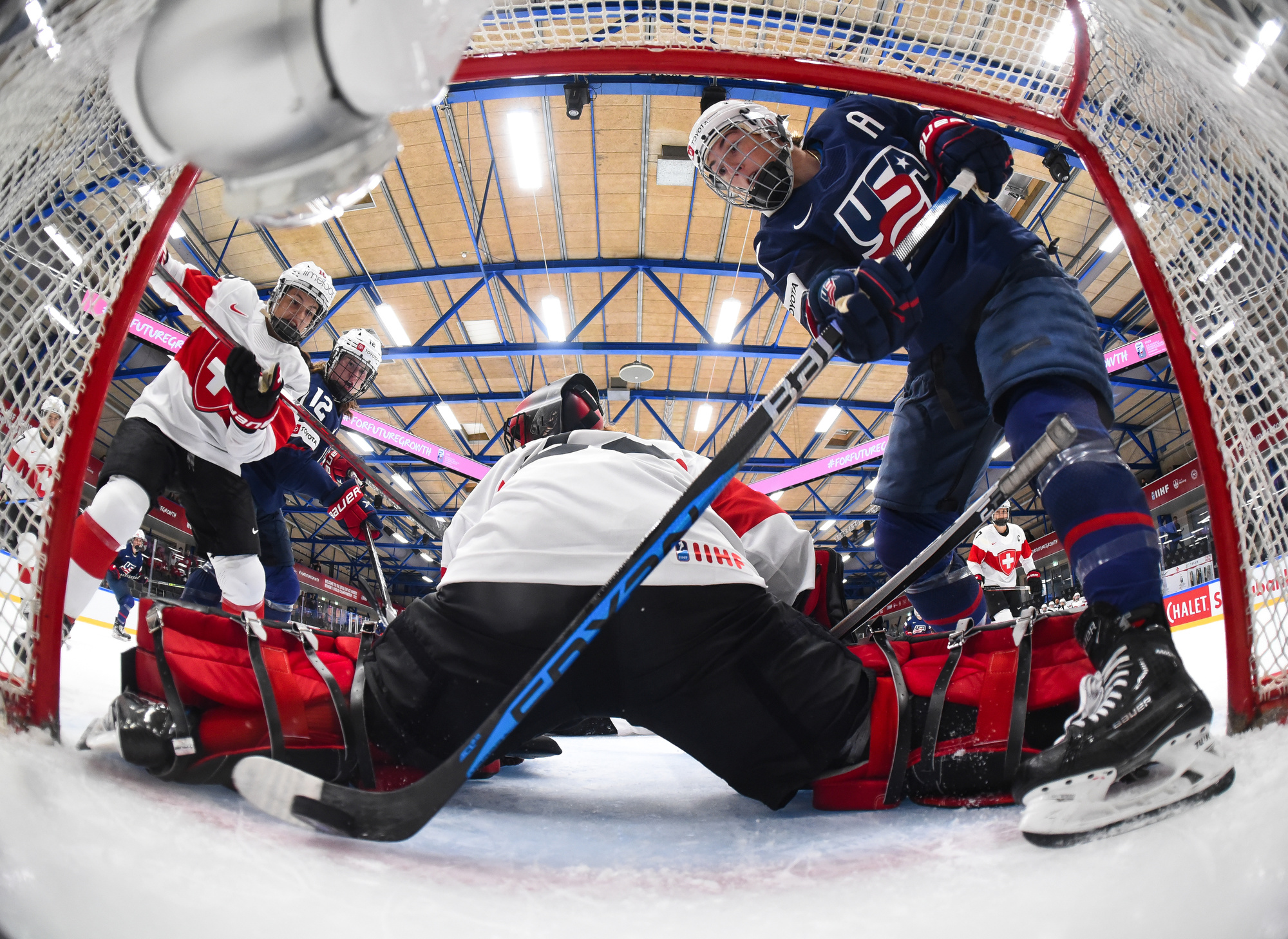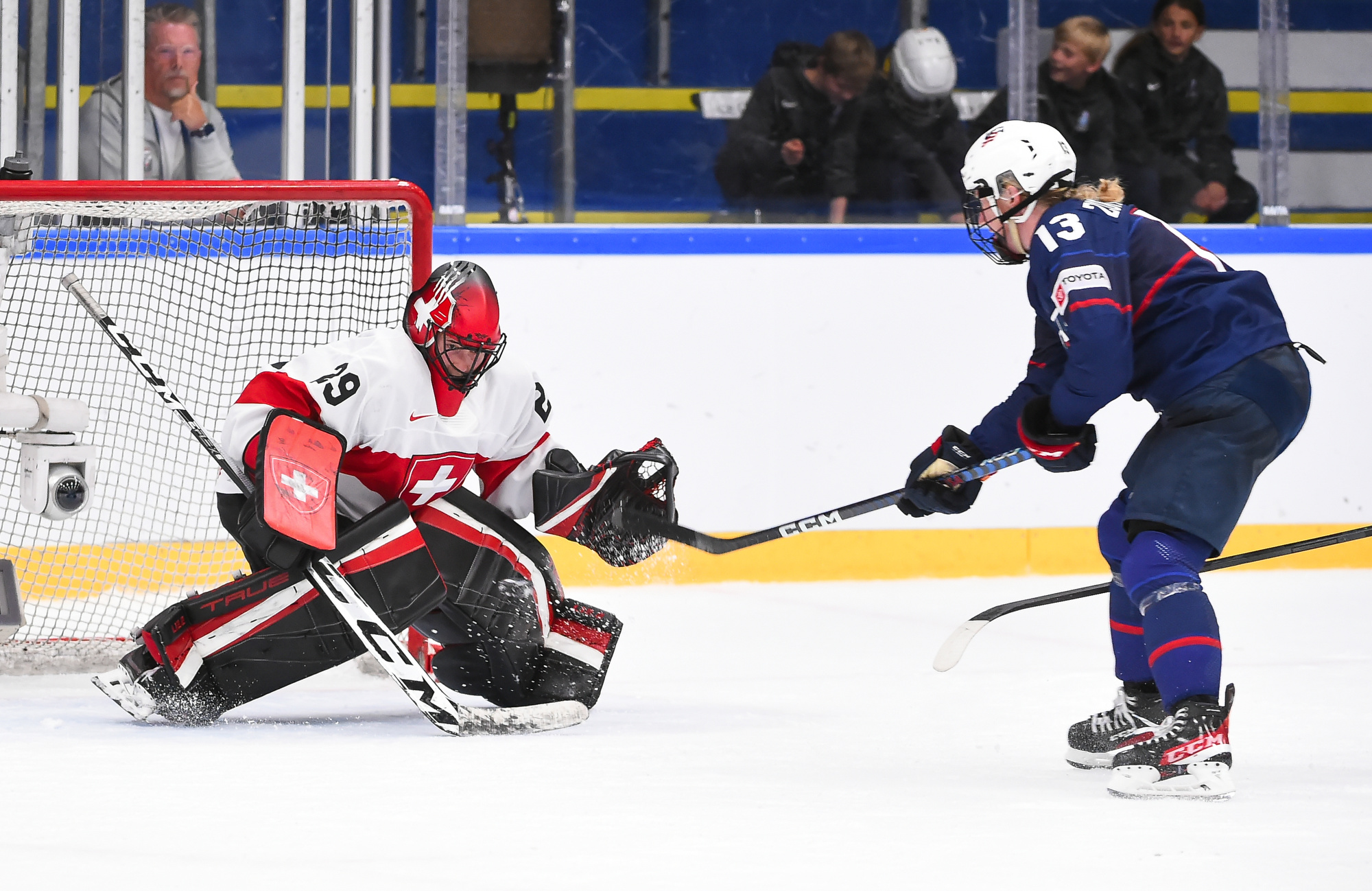 The U.S. brought their usual intensity to the first period, not giving the Swiss any hope for the possibility of an upset. Given that the Americans had won all nine previous meetings by a cumulative score of 91-5, that wasn’t very likely anyway, but Abby Roque pointed them in the right direction all the same. She planted herself in the slot, and Lee Stecklein fed her a perfect pass from behind the goal. In target-practise precision, Roque snapped a shot top shelf beyond the glove of Andrea Braendli at 5:48.