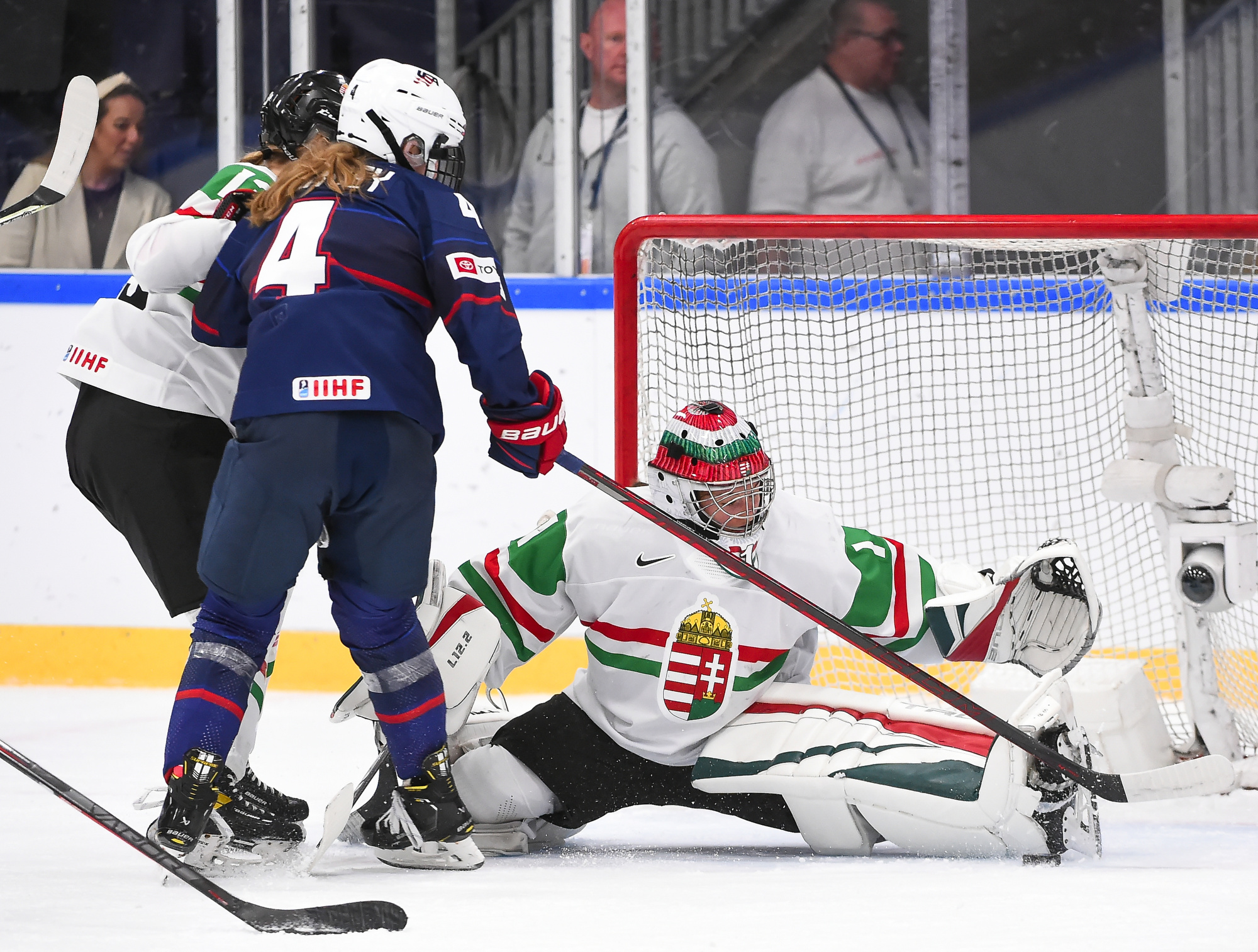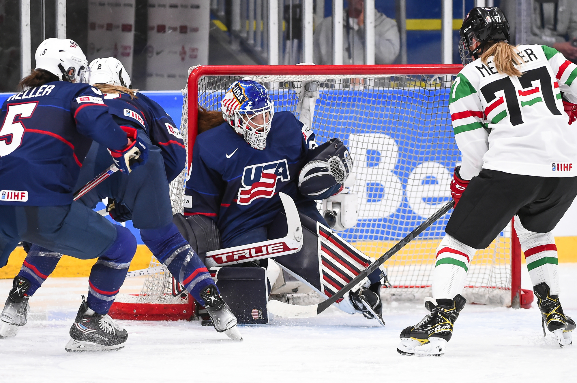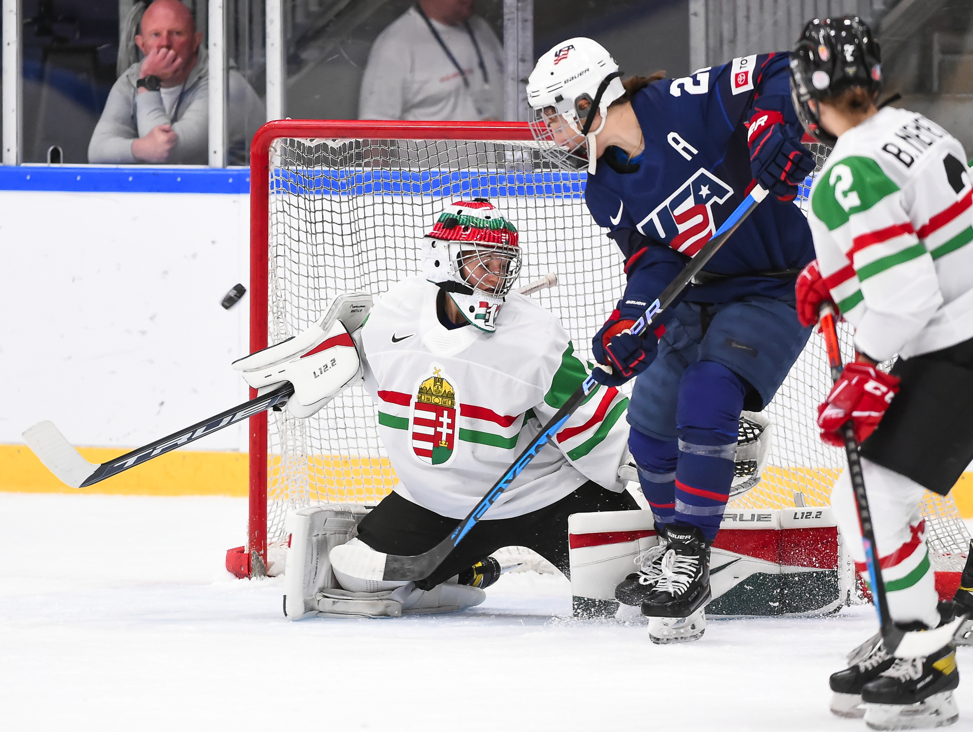 One thing was sure from the outset: Cortina was going to do what he could to avoid a blowout. And for one period, the Hungarians succeeded in spades. Hungary spent almost the entire first period in its own end, but goalie Aniko Nemeth was rock solid and the entire team collapsed around her to clog up the middle give the Americans nothing to shoot at.