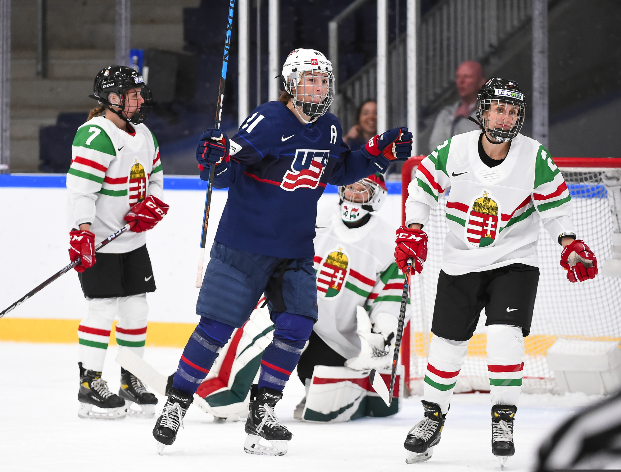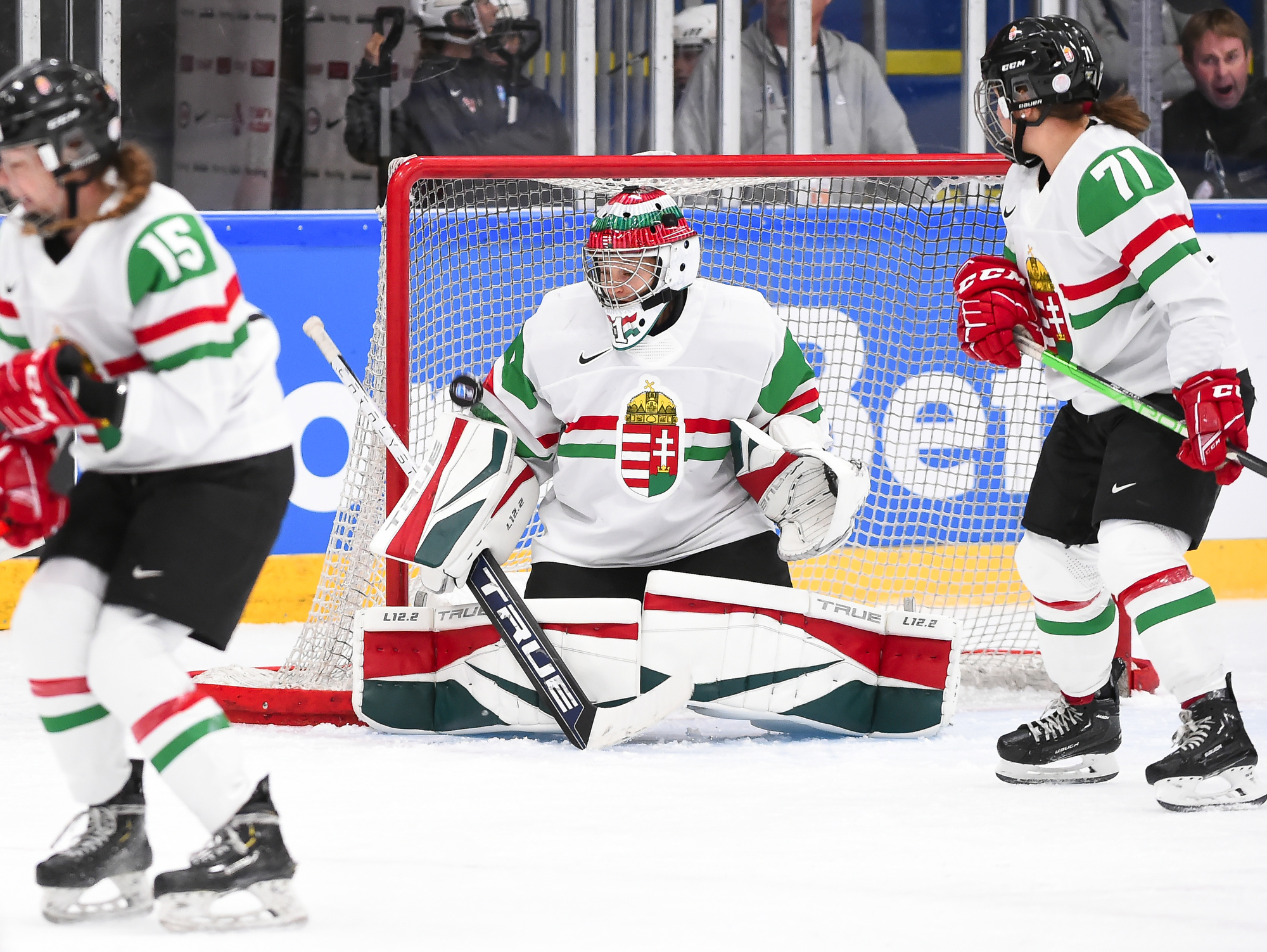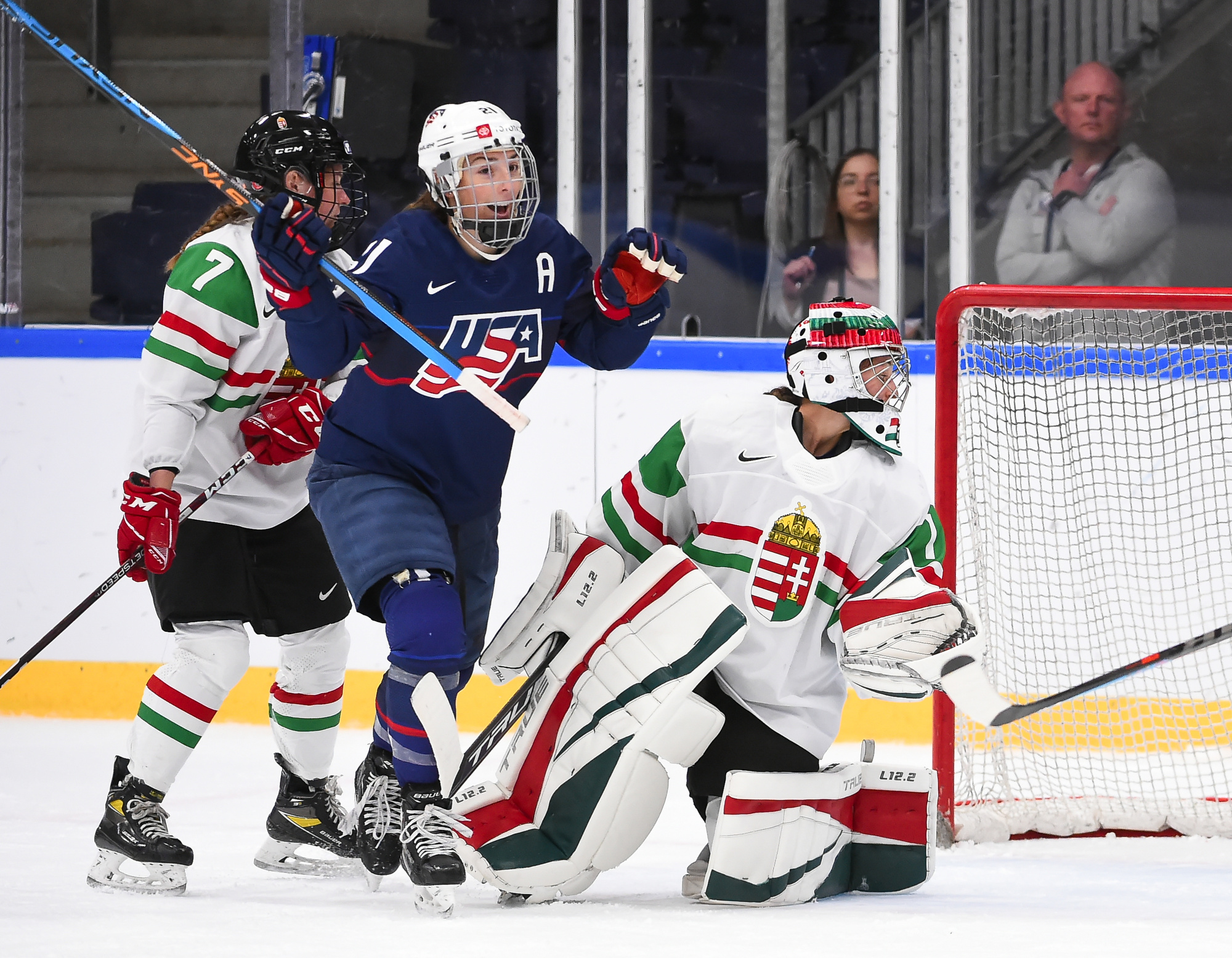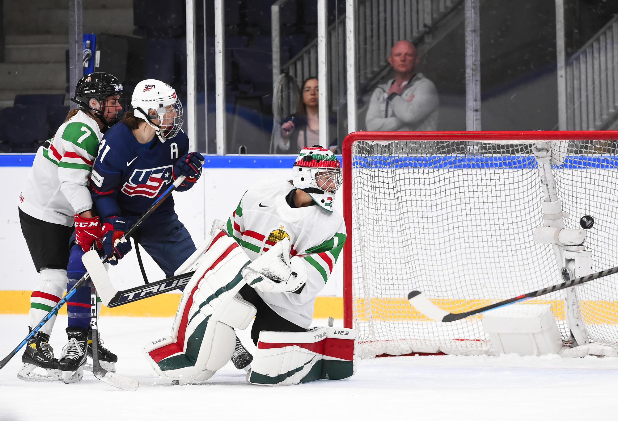 One thing was sure from the outset: Cortina was going to do what he could to avoid a blowout. And for one period, the Hungarians succeeded in spades. Hungary spent almost the entire first period in its own end, but goalie Aniko Nemeth was rock solid and the entire team collapsed around her to clog up the middle give the Americans nothing to shoot at.