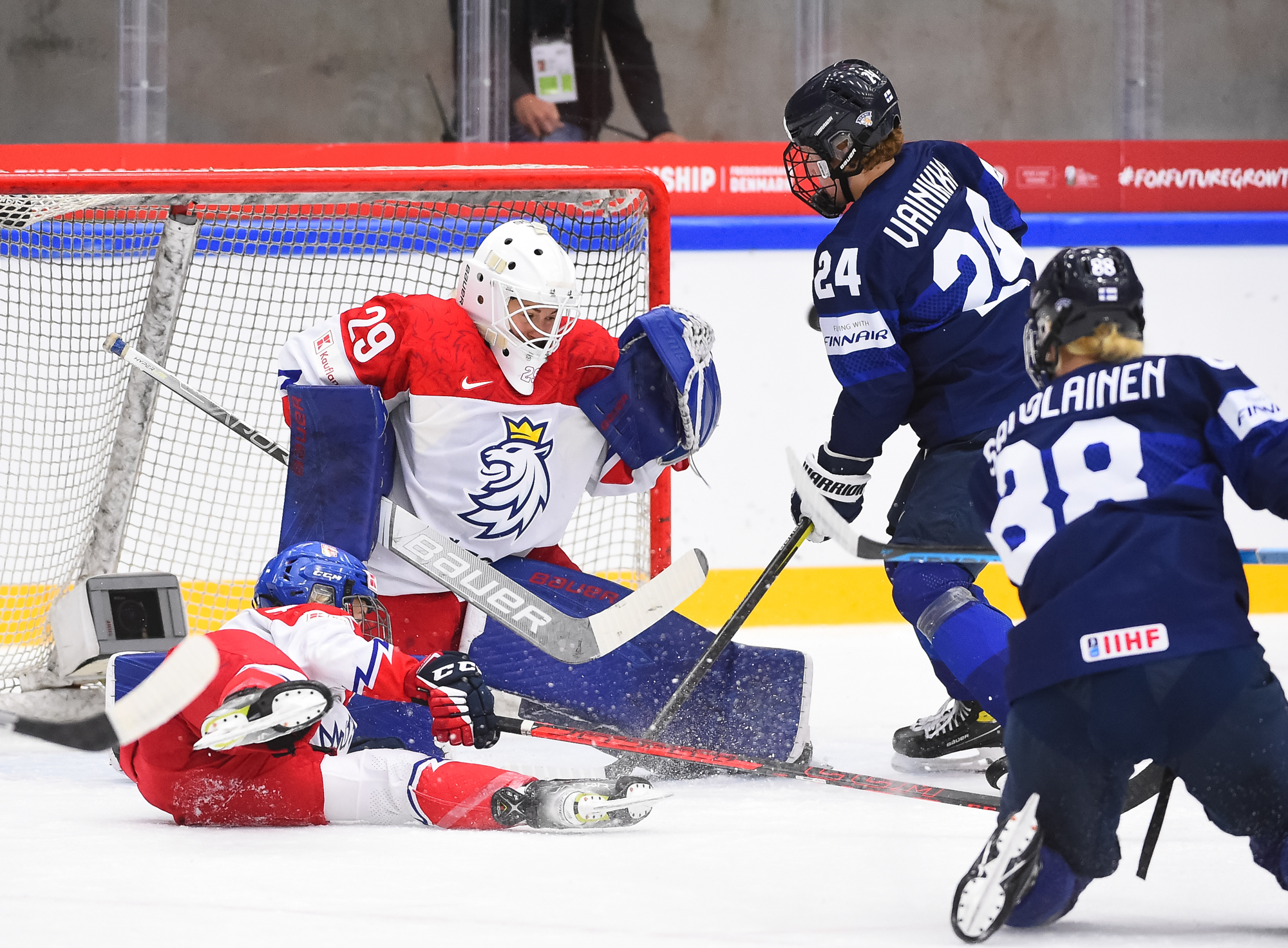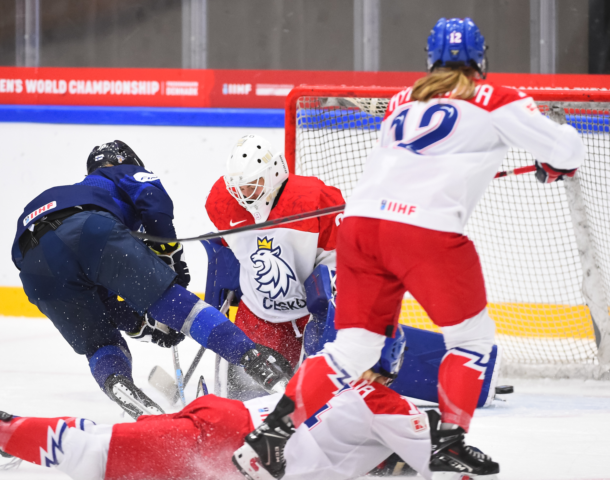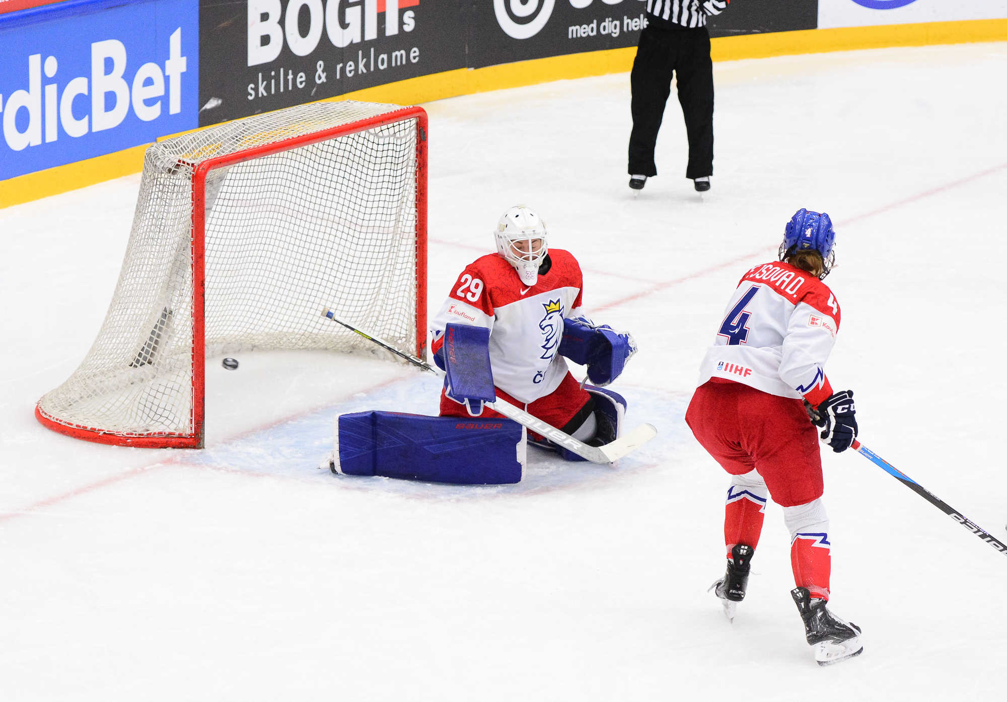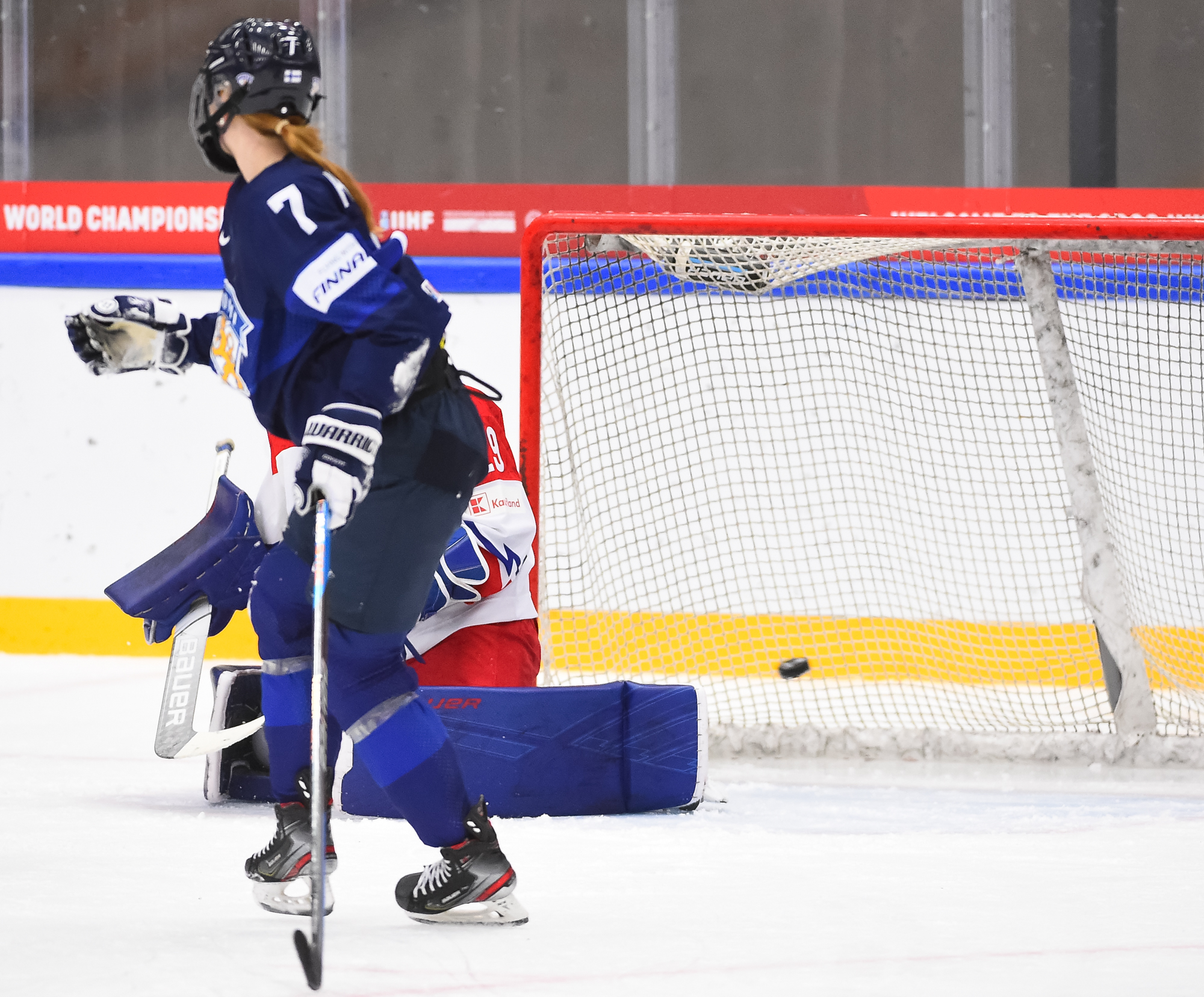 Defender Daniela Pejsova gave Czechia a 1-0 lead at 37:00. Jumping up into Finland’s zone, she received a pass from captain Alena Mills with her back to the net, and spun around to face Keisala and score her fourth of the tournament.