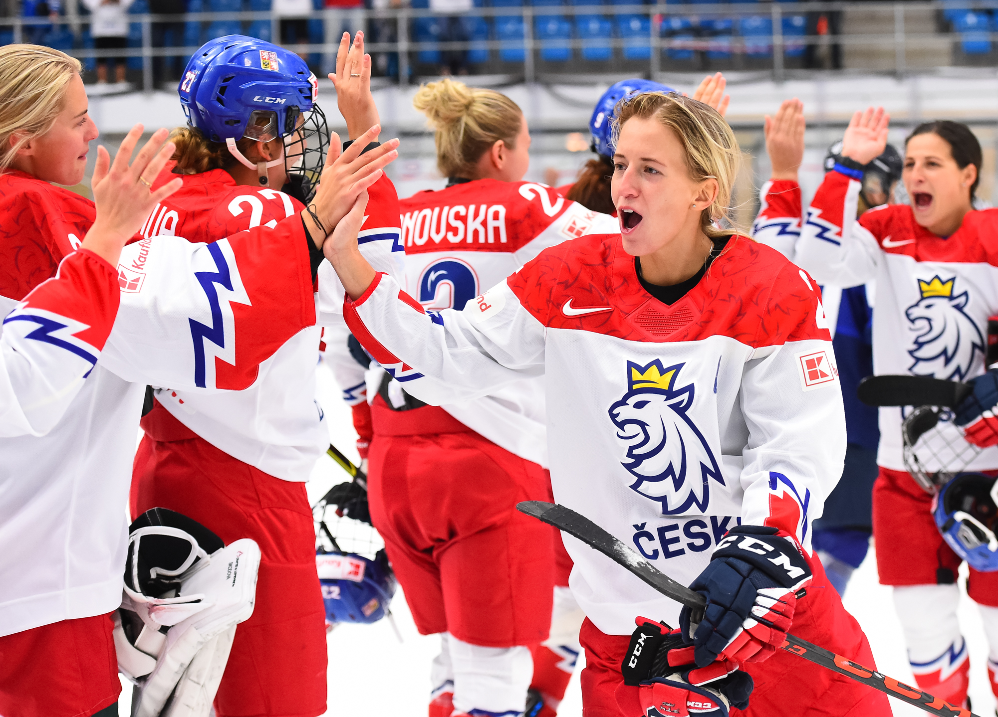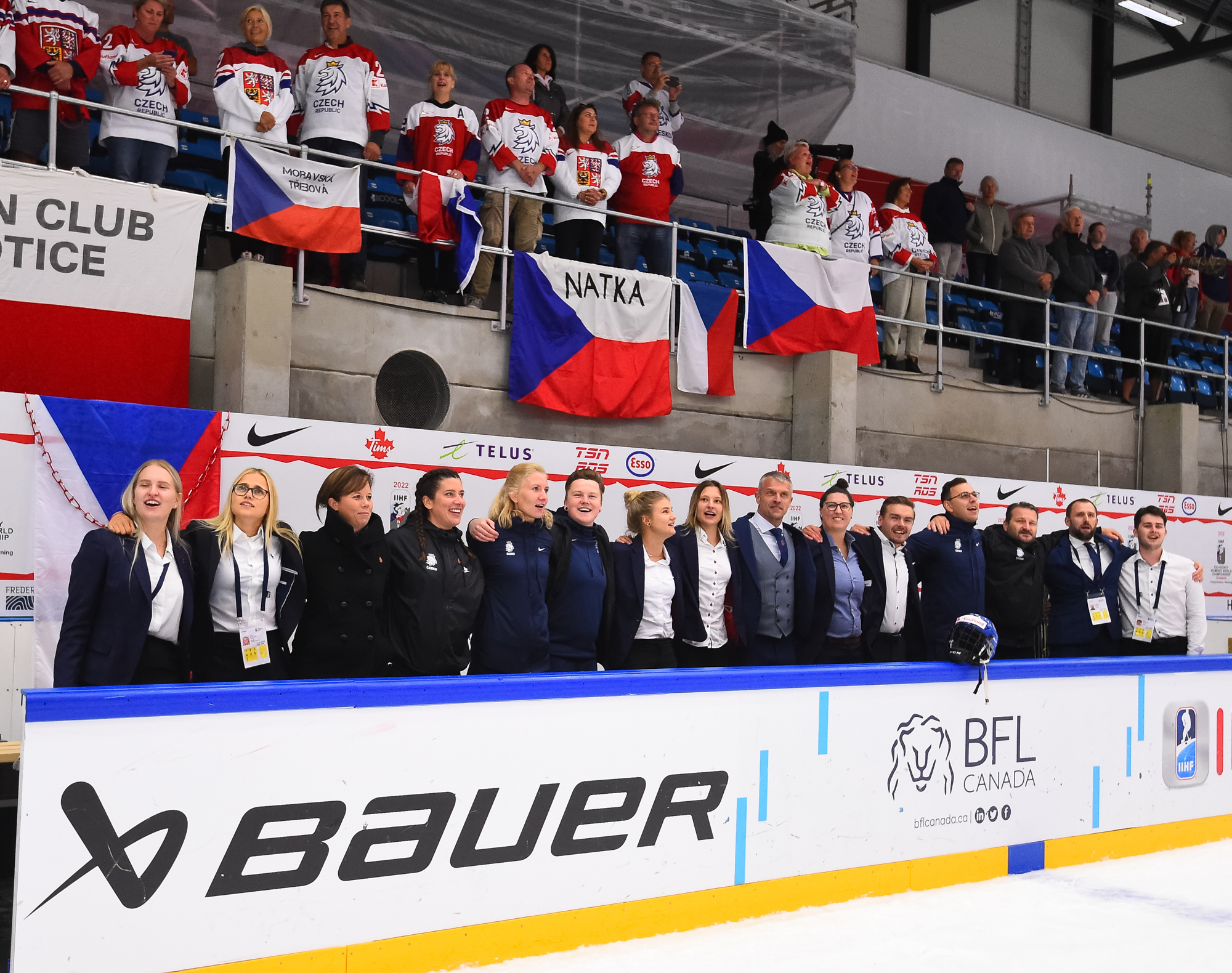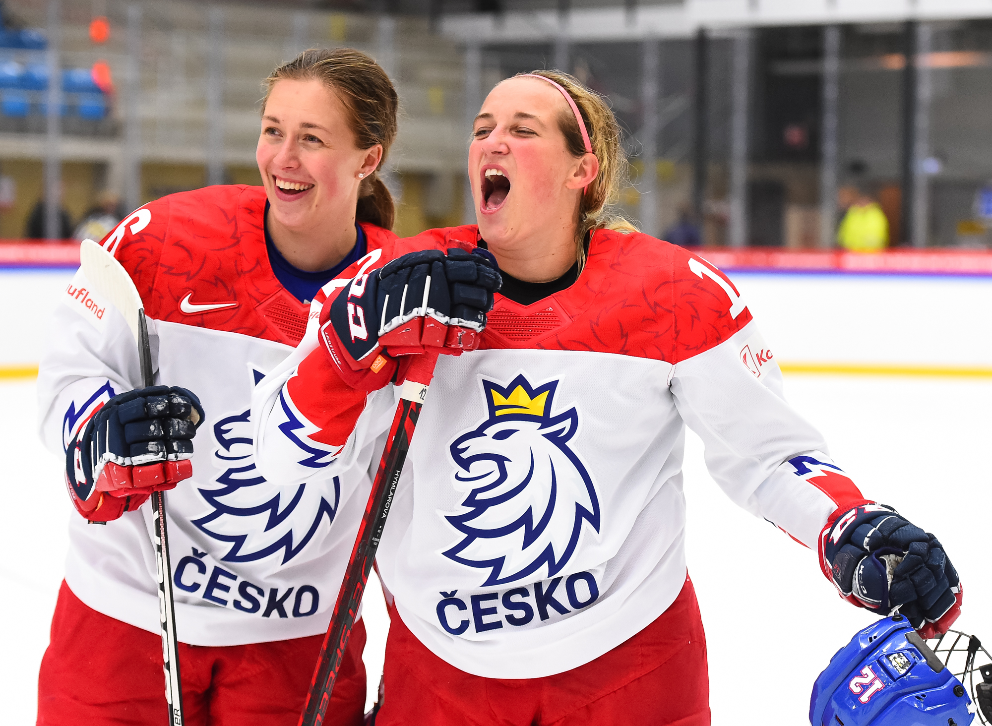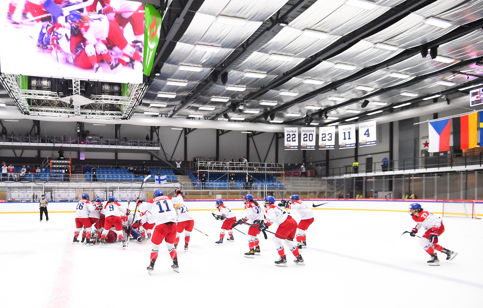 The entire Czech bench piled onto the ice as the buzzer sounded, celebrating what is a monumental moment for Czechia's women's ice hockey program.