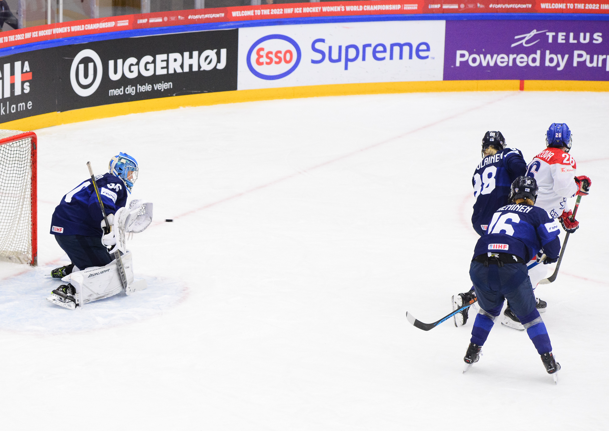 Like in all of their other meetings at the World Championships, the first period was scoreless. These teams have played each other three times before (all in the quarterfinals), in 2016, 2019, and 2021. Finland came out the winner in all three, but as the years went by, Czechia continued to close the gap; while they lost 5-0 in 2016, in 2021 the score was just 1-0. Klara Peslarova was in the net for Czechia for each of these games, and got the start again in Frederikshavn.