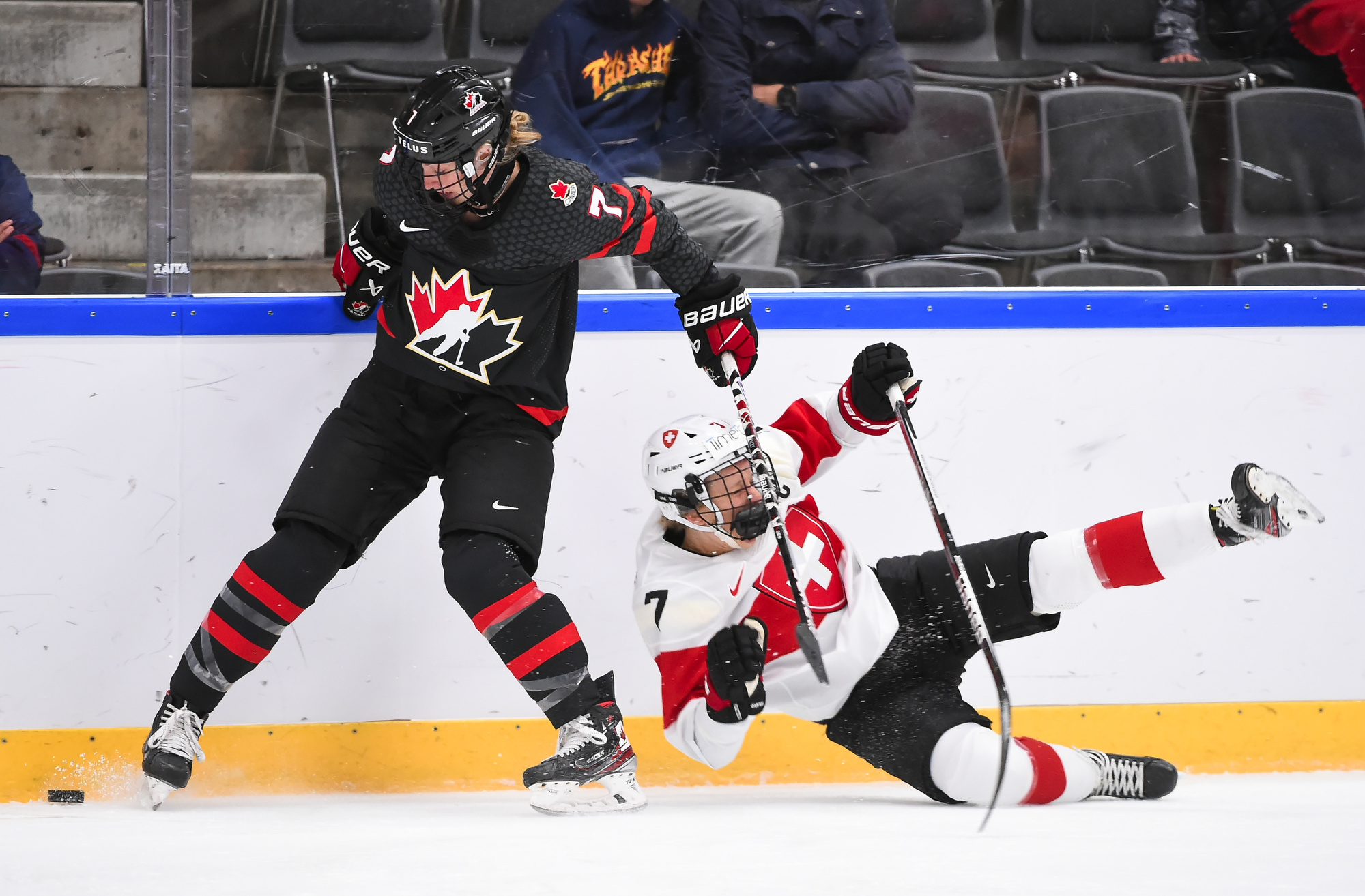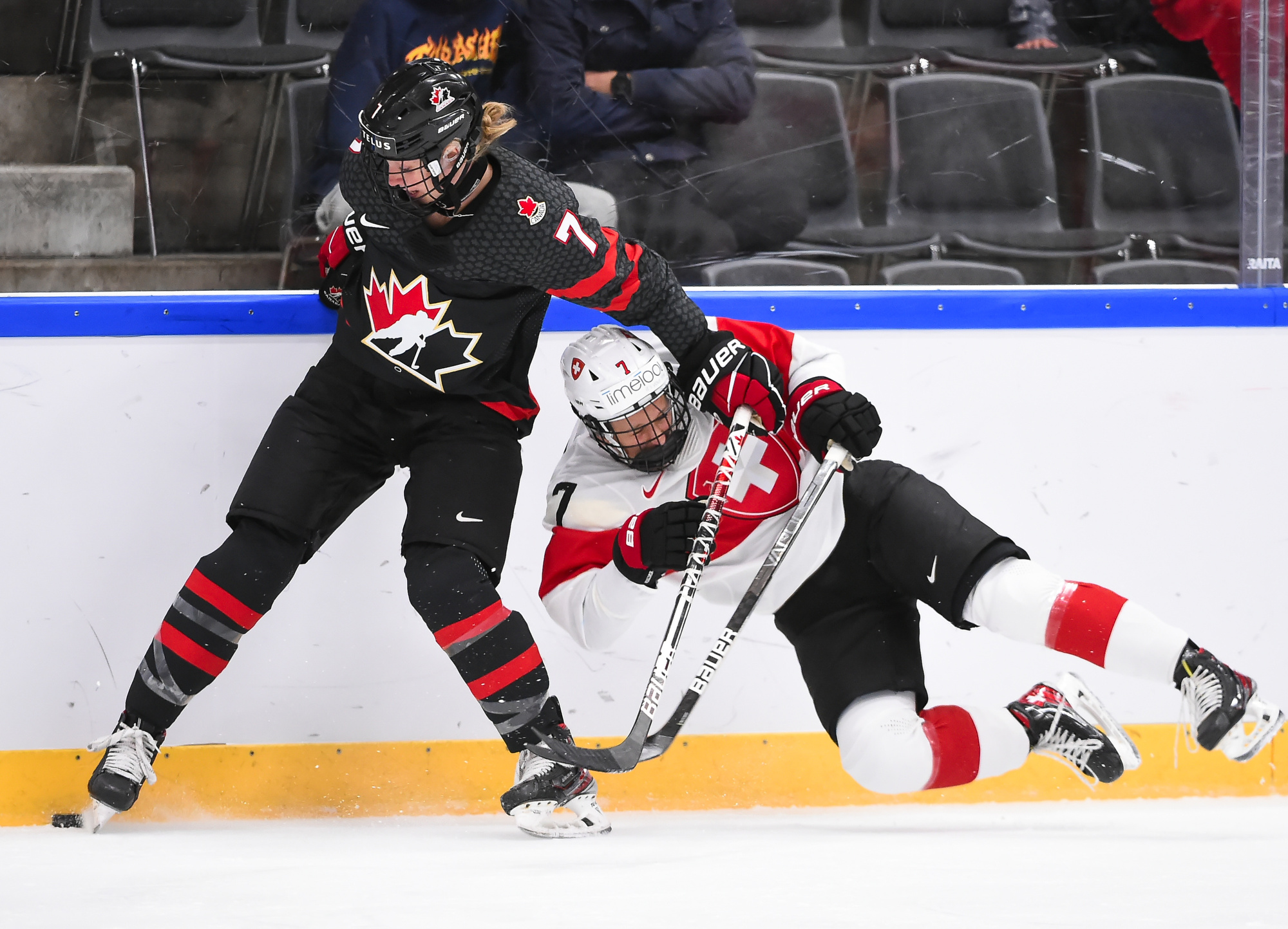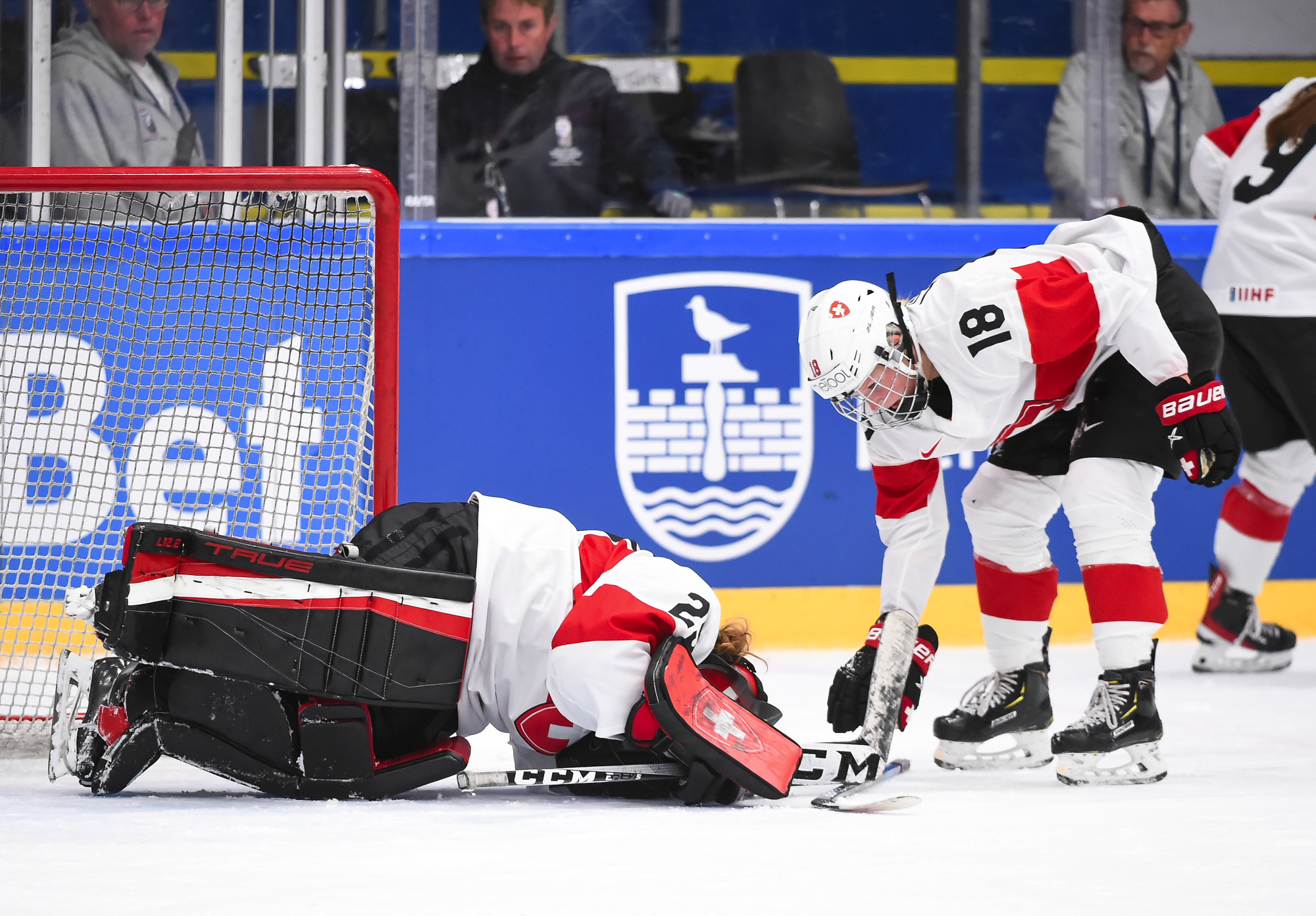 Midway through the period, another scary moment for a Swiss team riddled by injury problems. Playing short-handed, Stalder stole the puck and dashed up the ice on a breakaway. Fillier tracked her down and swiped the puck away with a beautiful play, but she tripped Stalder in the process and they both fell heavily into the boards. Fillier got up quickly but Stalder was a bit shaken up and took a few moments longer.
