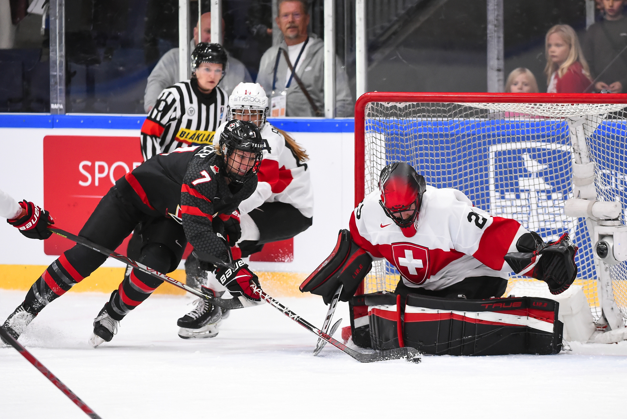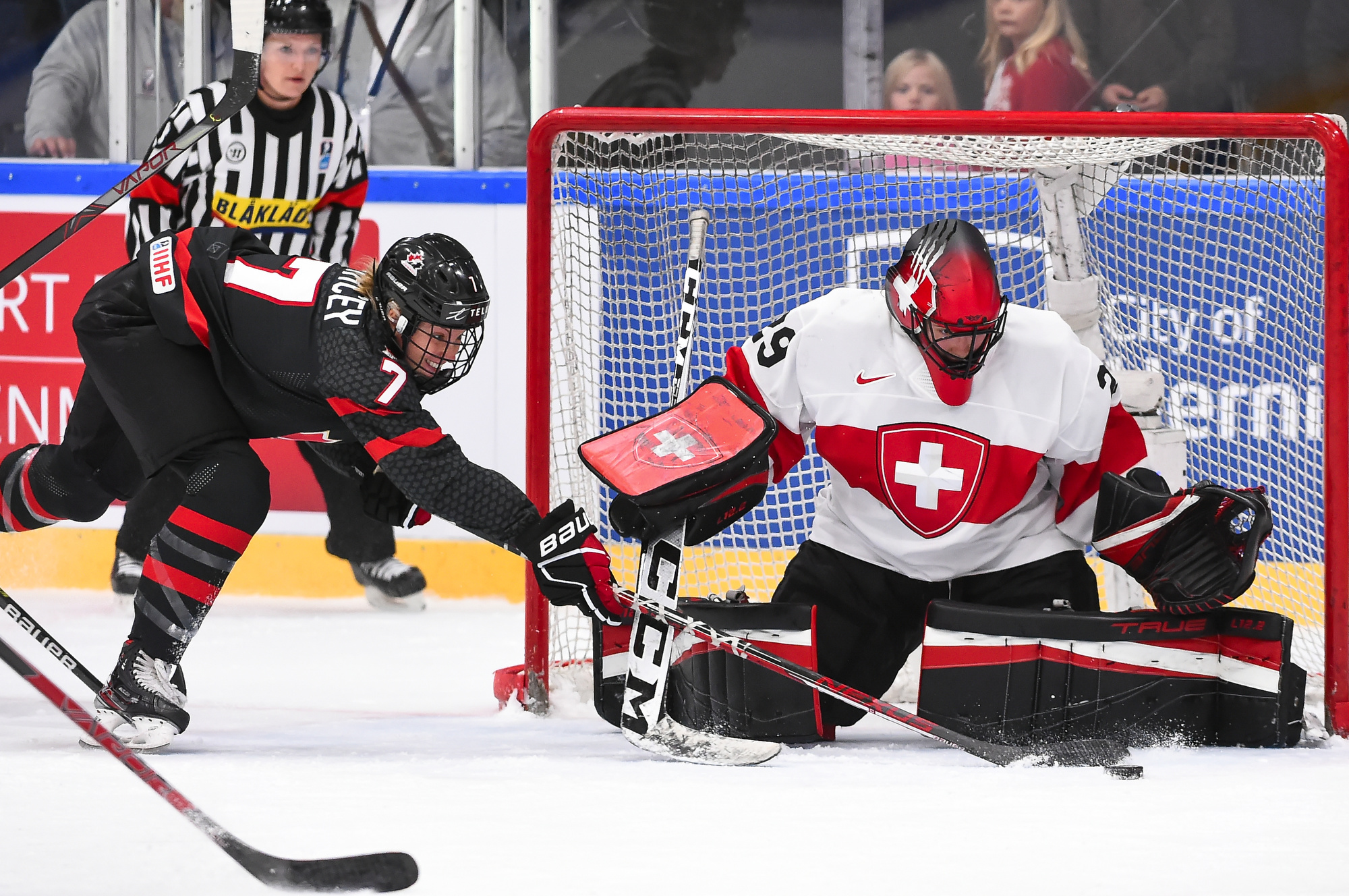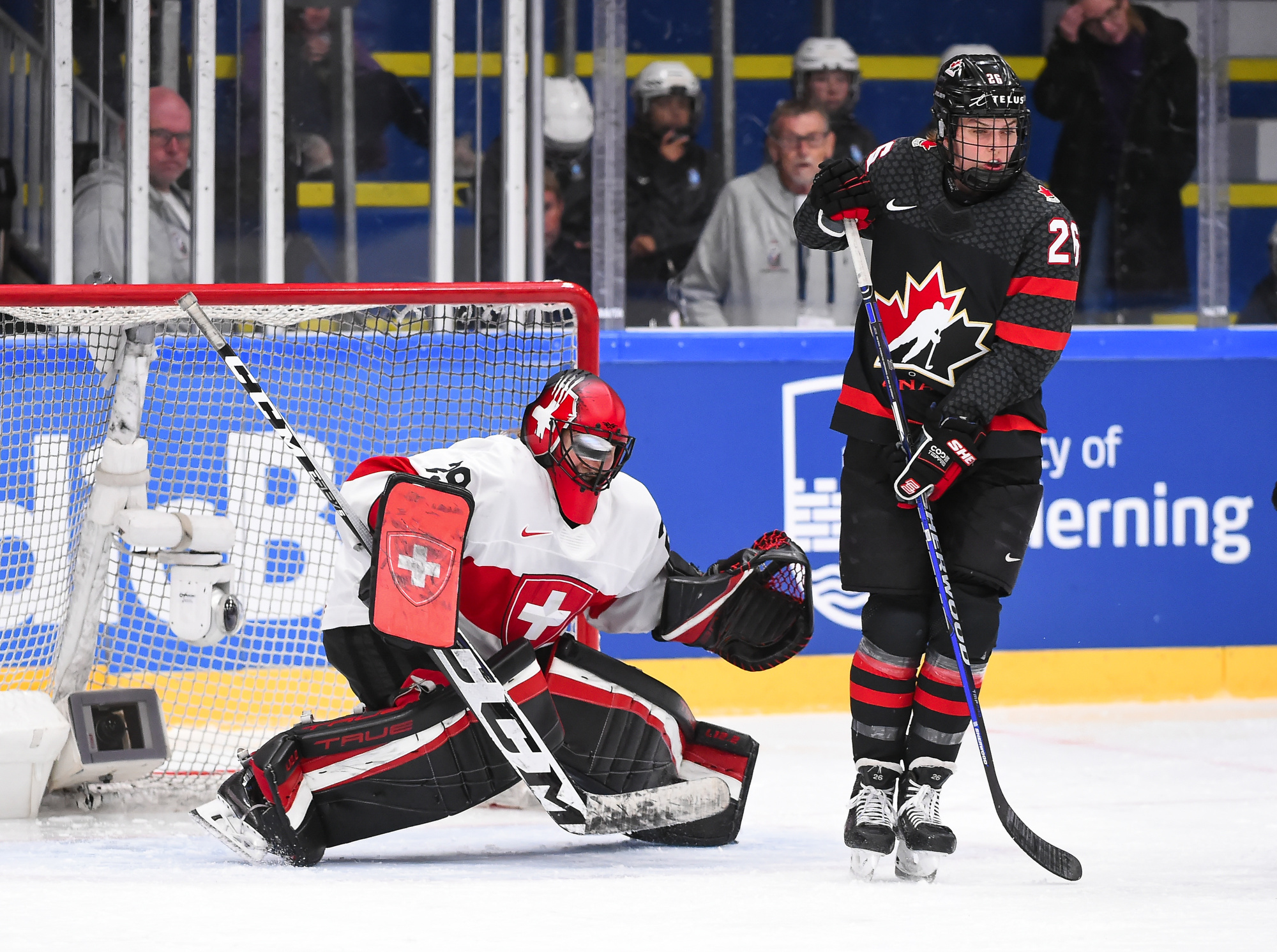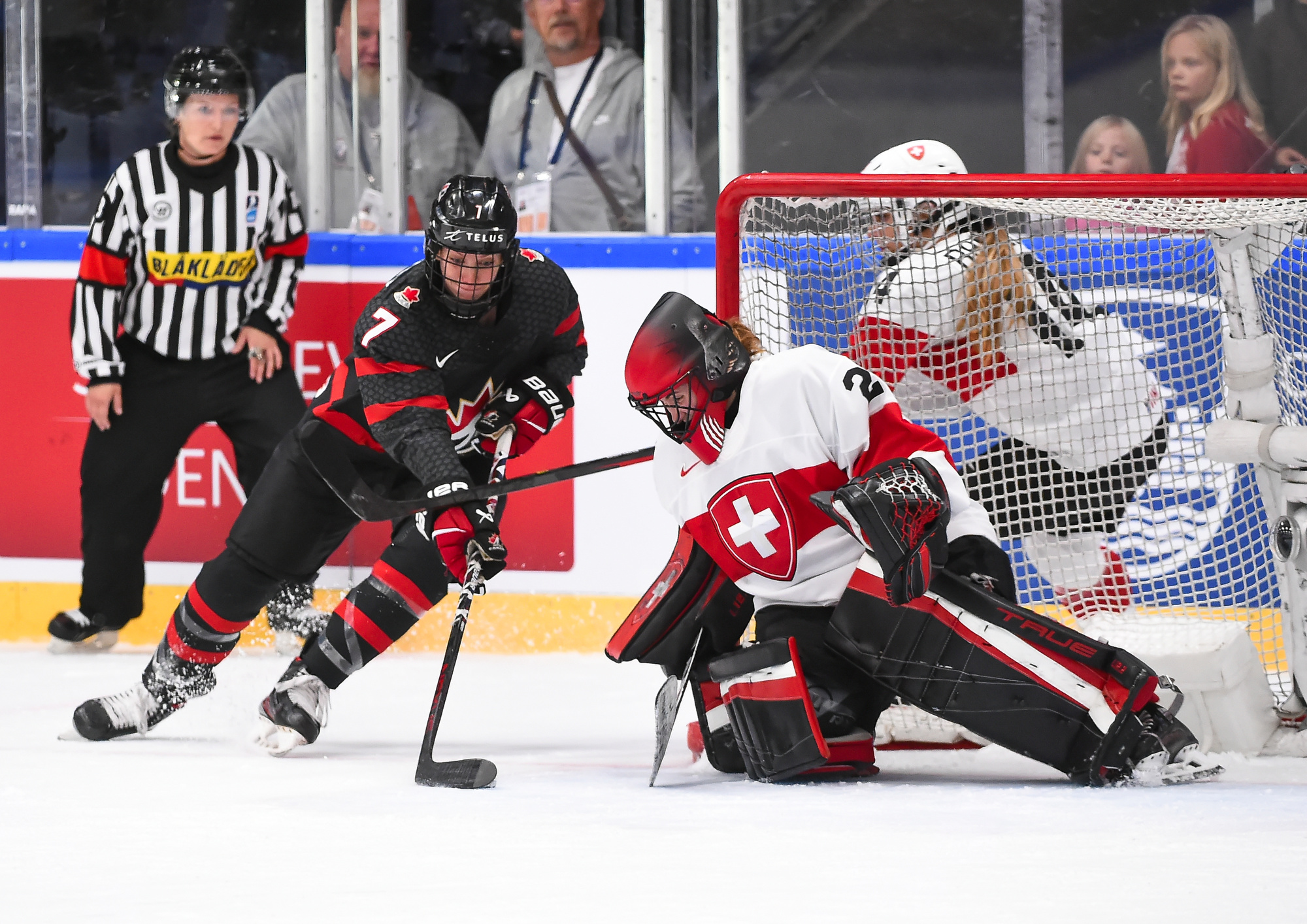 Canada outshot the Swiss, 56-6, Ann-Renee Desbiens recording the easy shutout while Saskai Maurer was peppered with many tough shots among the onslaught.