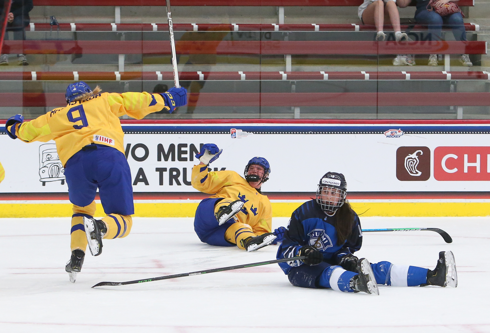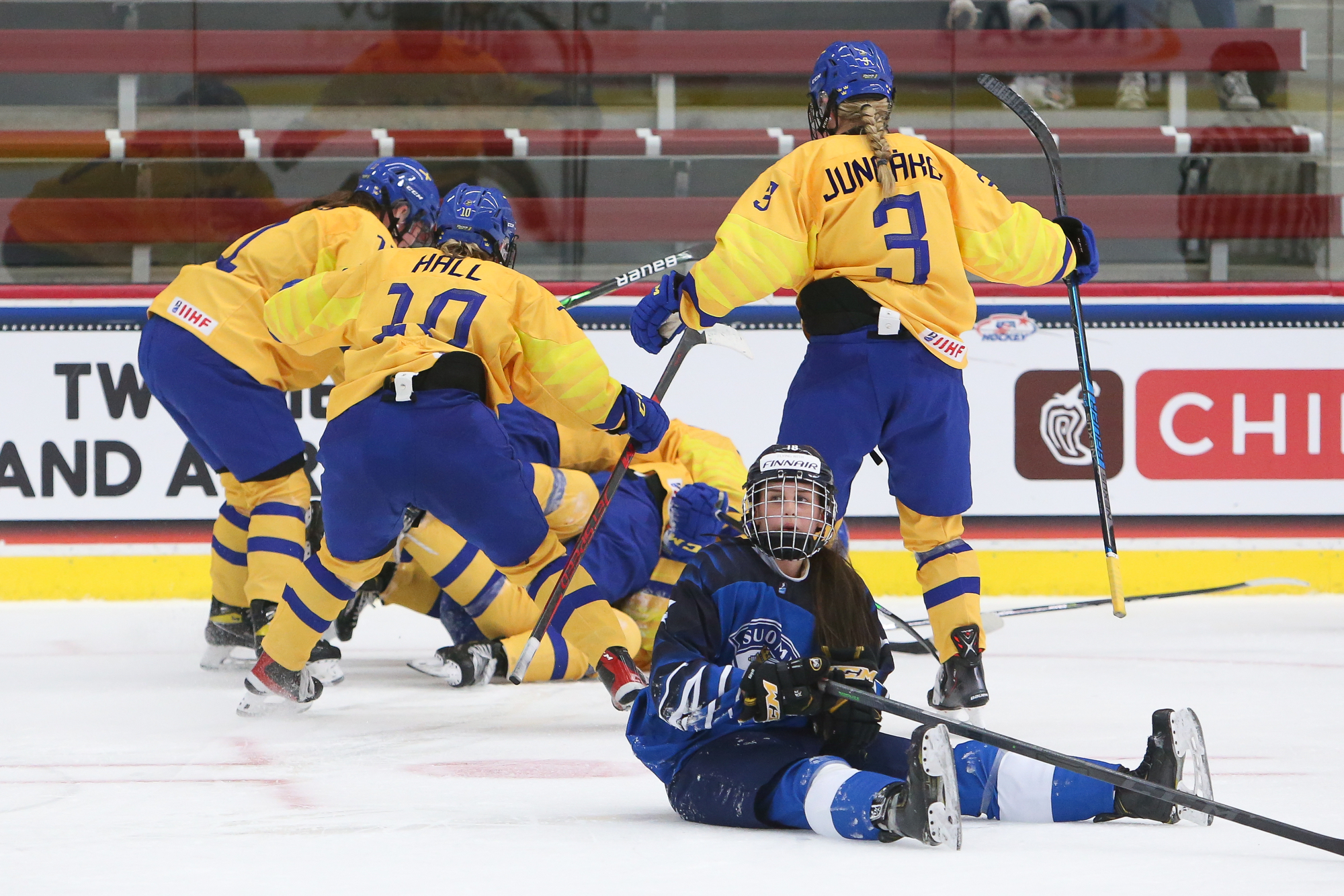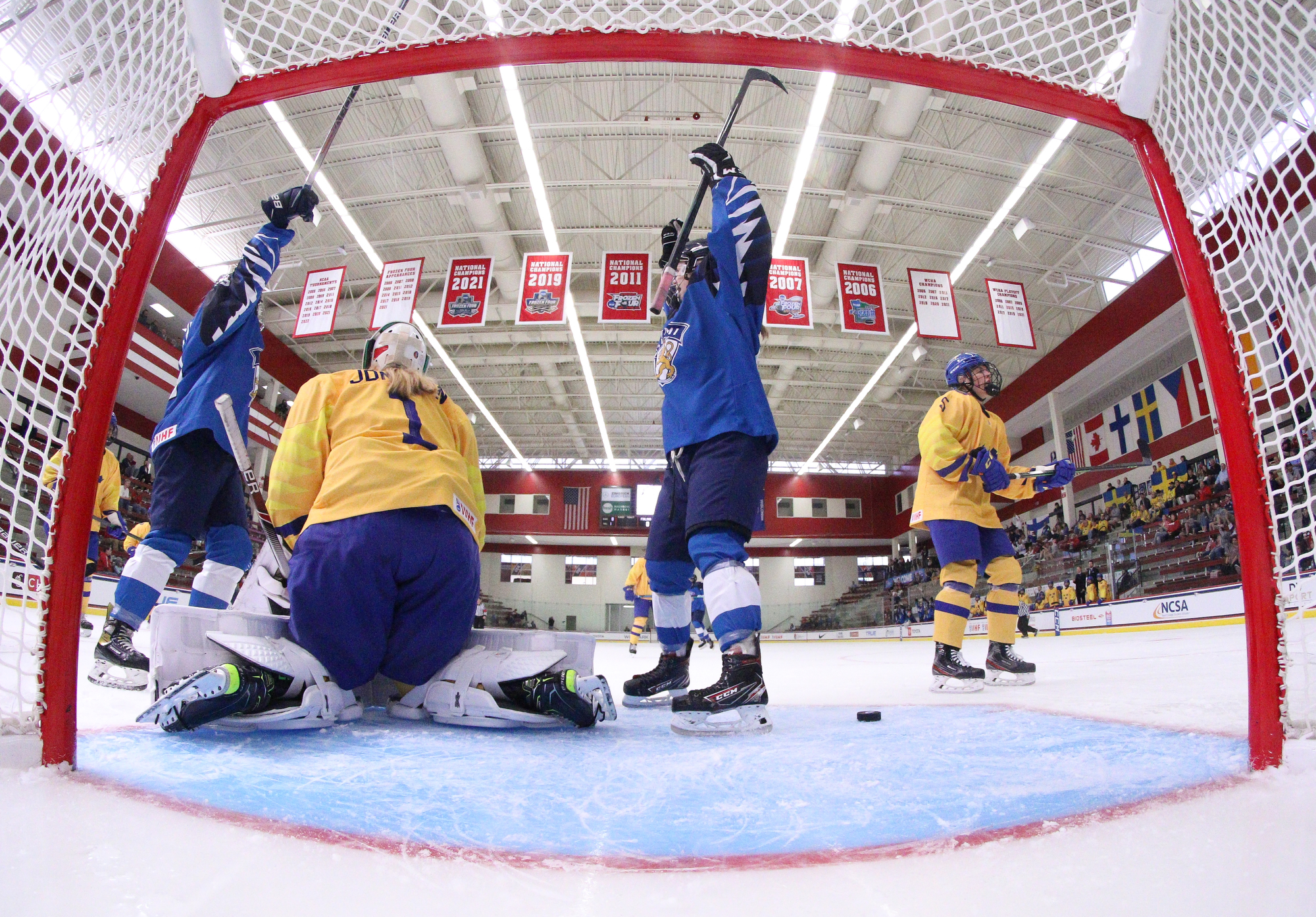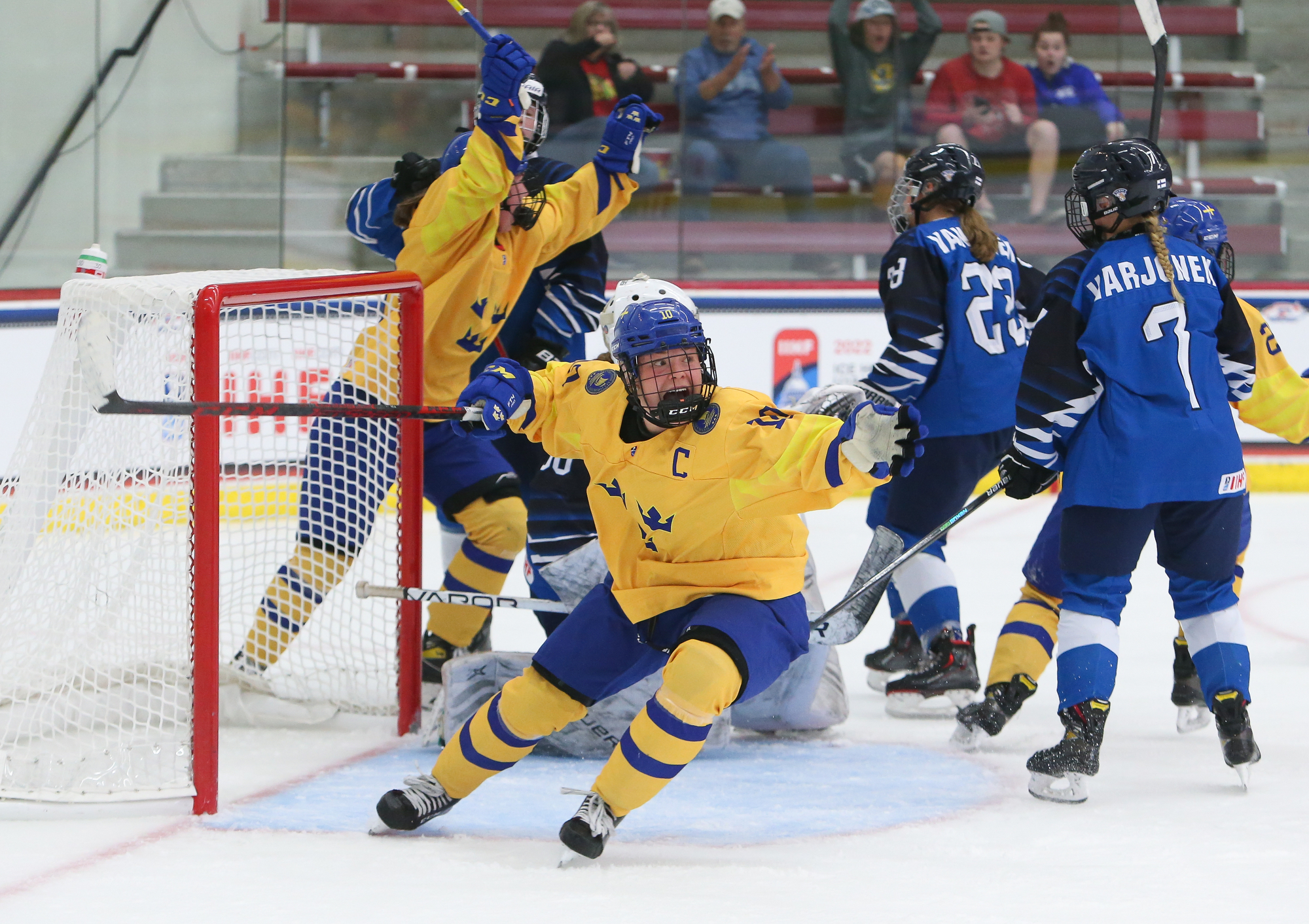 Advantage Sweden! The Swedes defeated the Finns 4-3 at LaBahn Arena on Thursday in the latest installment of the great Nordic hockey rivalry at the 2022 U18 Women's Worlds. It couldn't have been more dramatic, as the Swedes scored twice with the goalie pulled for the extra attacker, including Jenna Raunio's winner with eight seconds left.