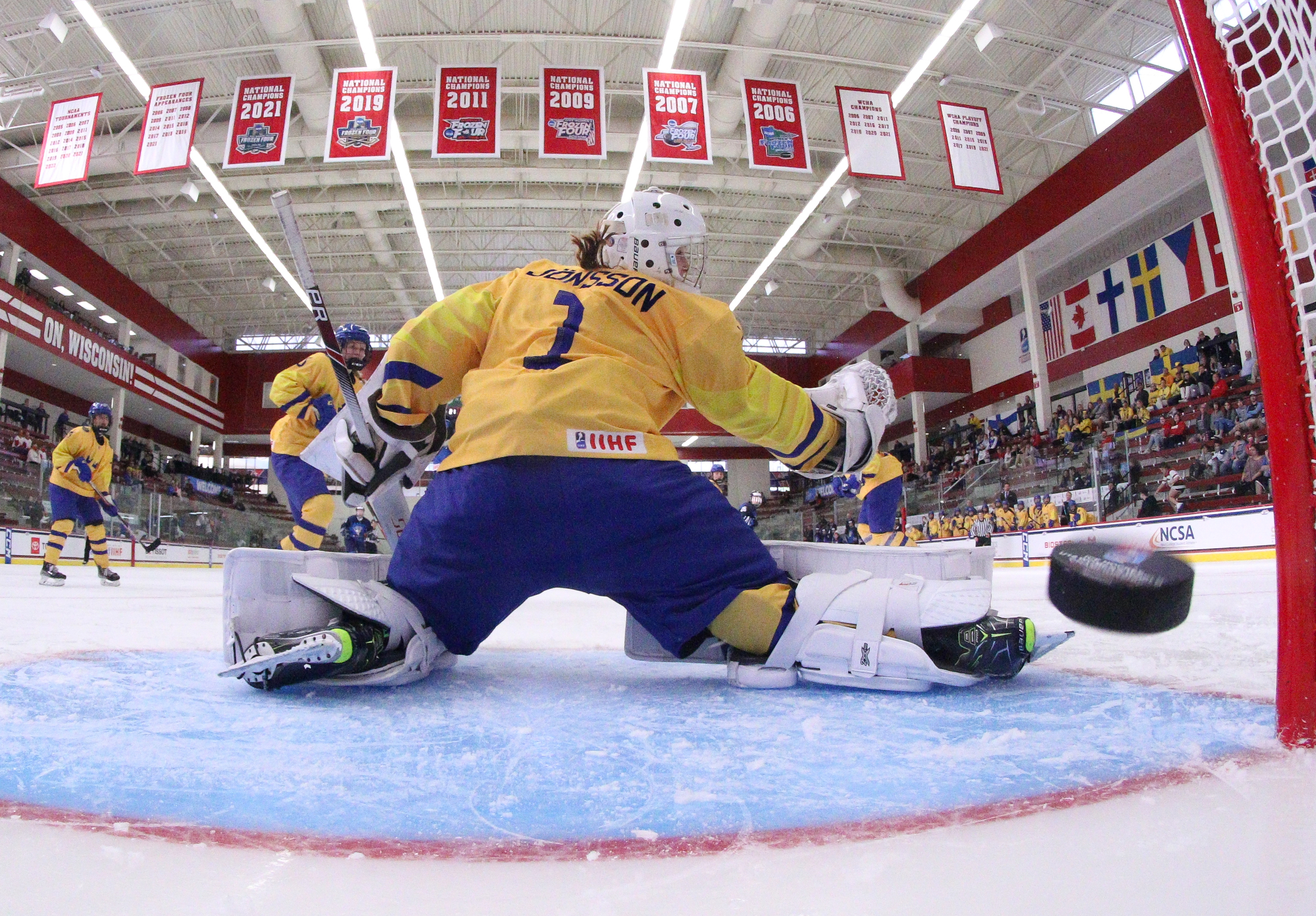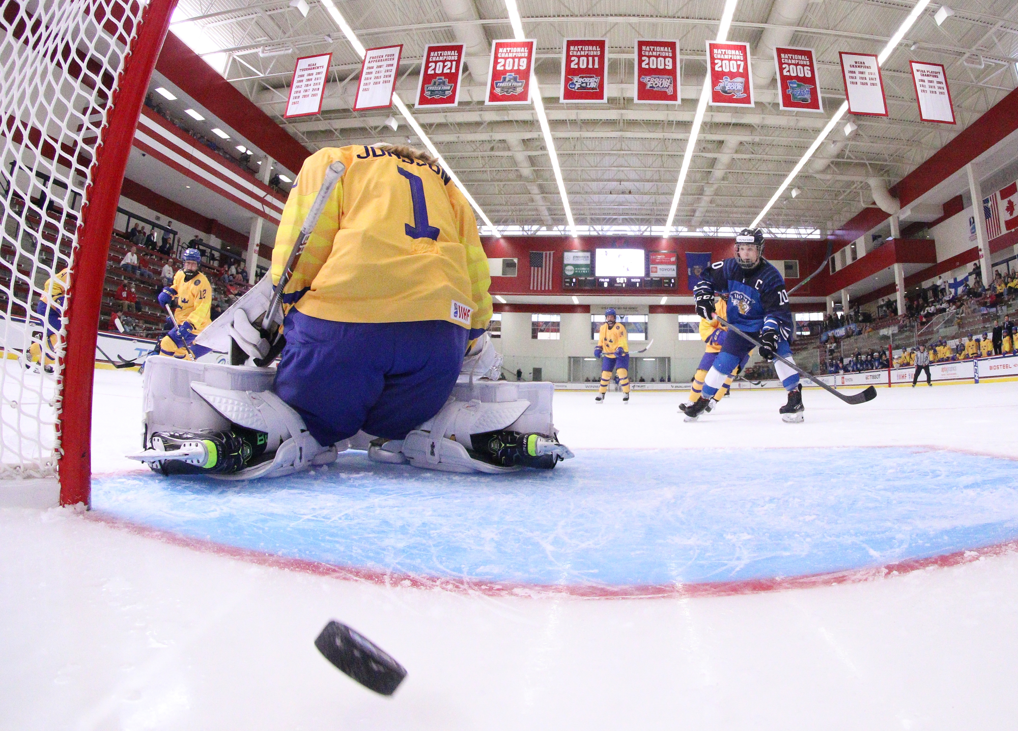 During Finland's next power play, Jonsson came up big to stop captain Anna-Kaisa Antti-Roiko from the bumper position, but just as the woman advantage expired, Makkonen's centre point shot sailed past the Swedish goalie on the stick side at 10:05.
