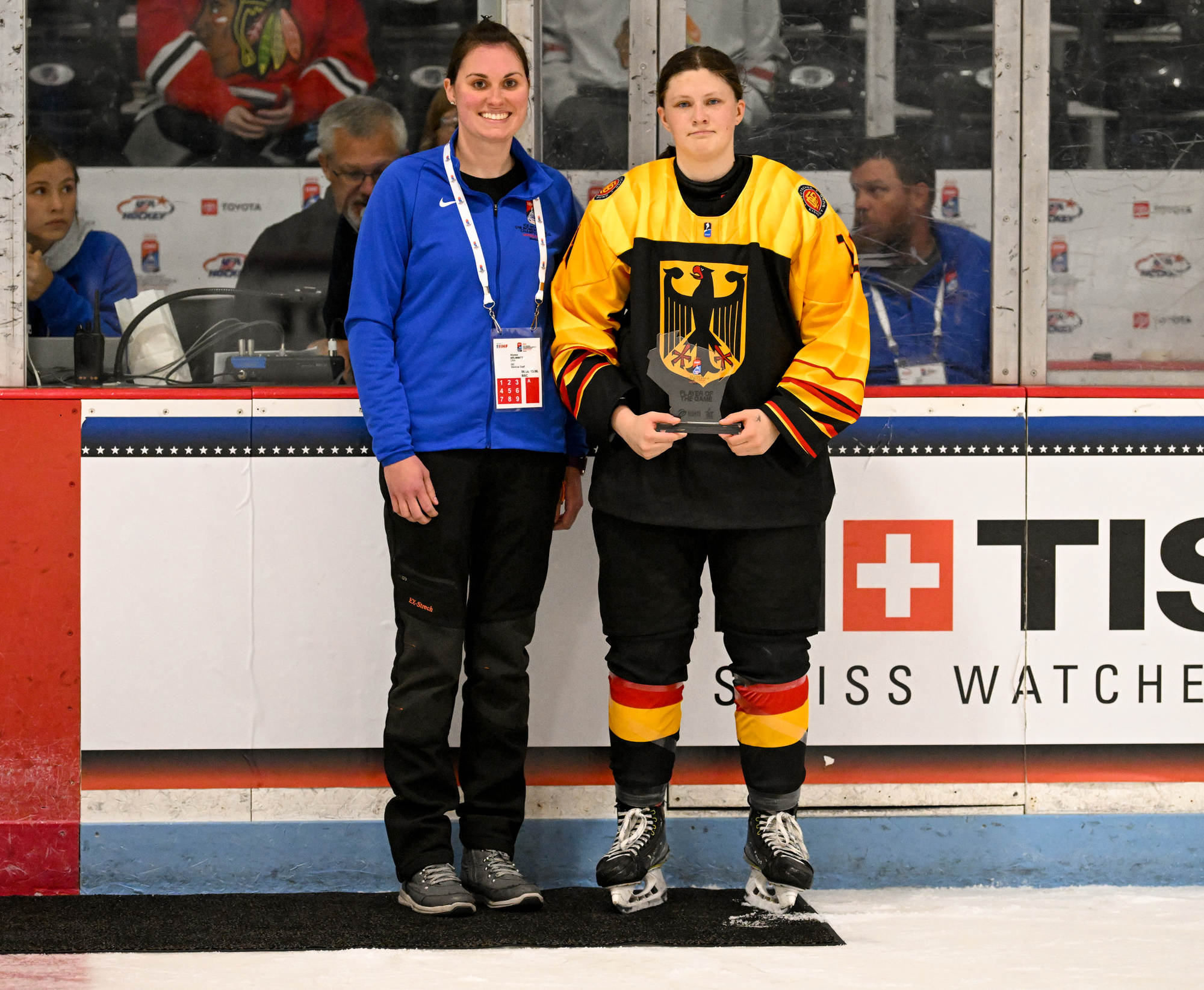 Germany got on the board first midway through the opening period on Lola Liang's second goal of the tournament. On a scrum in front, Liang collected the rebound from her initial shot, shifted to her backhand and put it past Debnarova at 10:31.