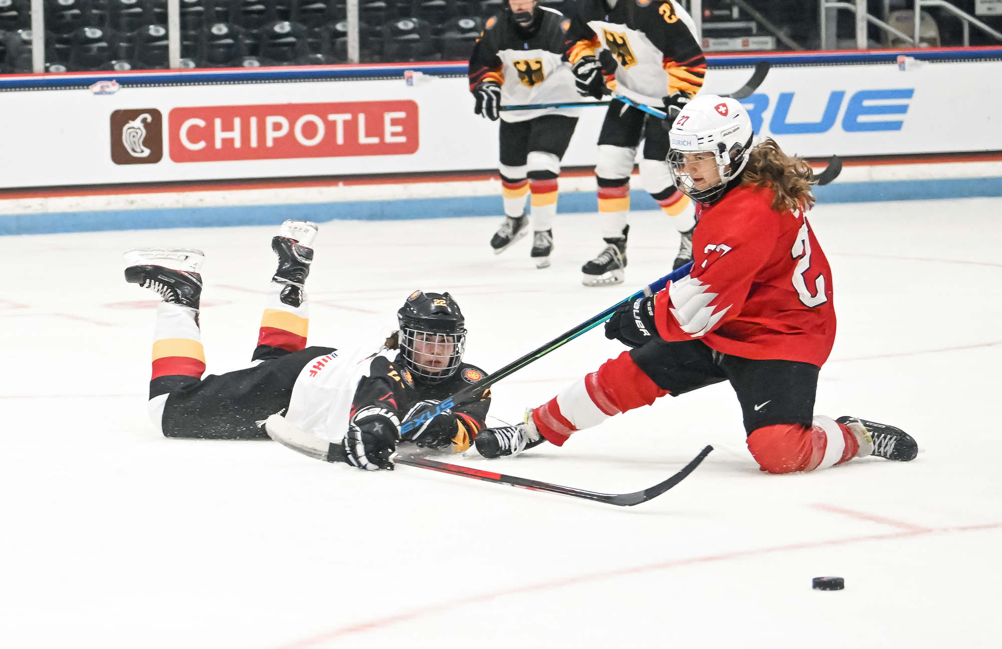 Herzig scored on power play when she found a rebound in the slot and fired it under the blocker of German goaltender Sara Brammen while falling to the ice.