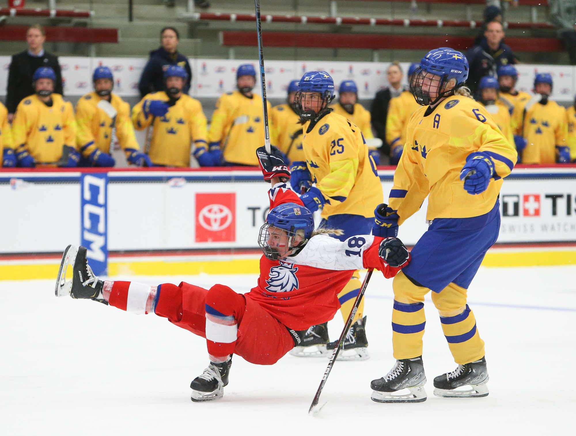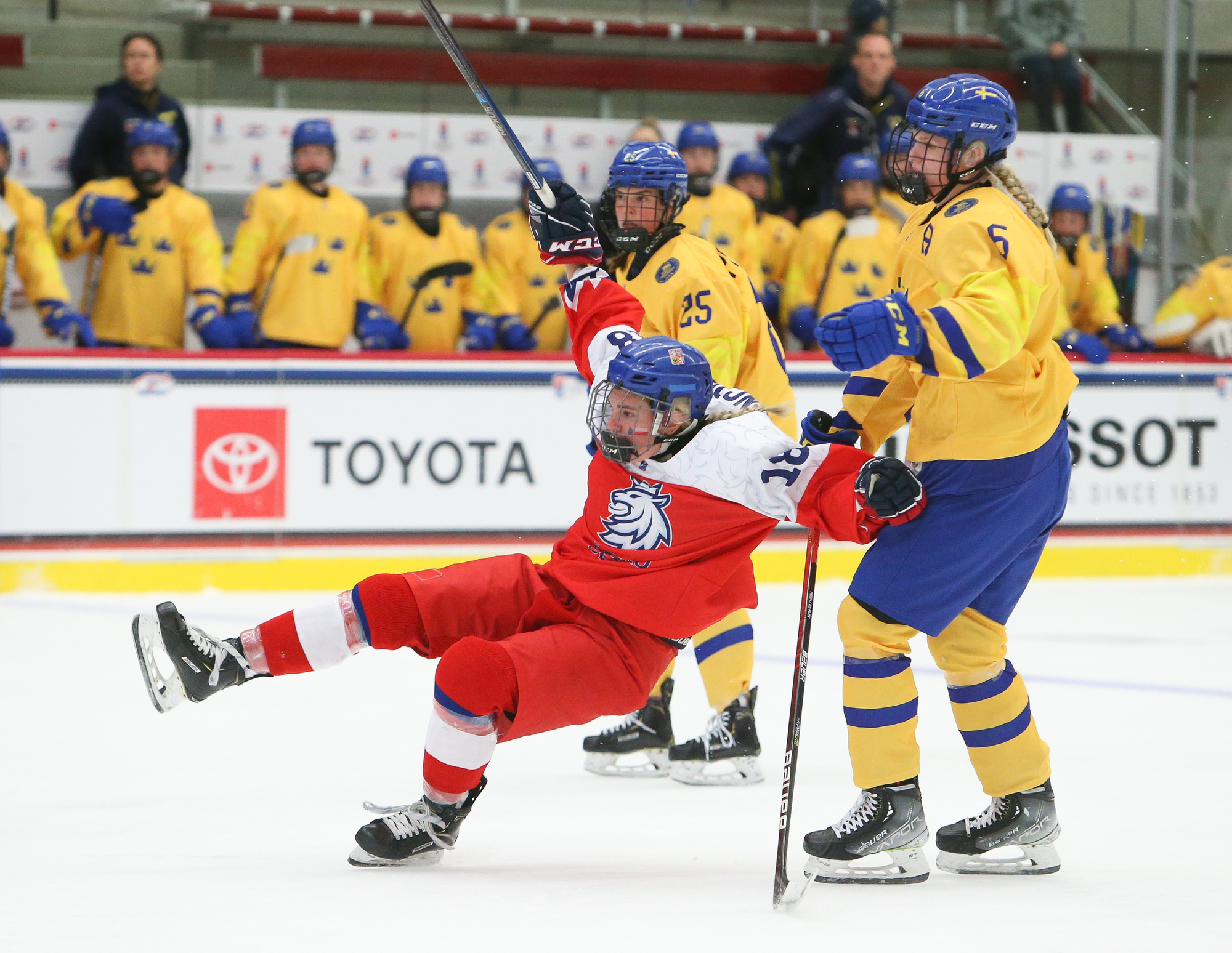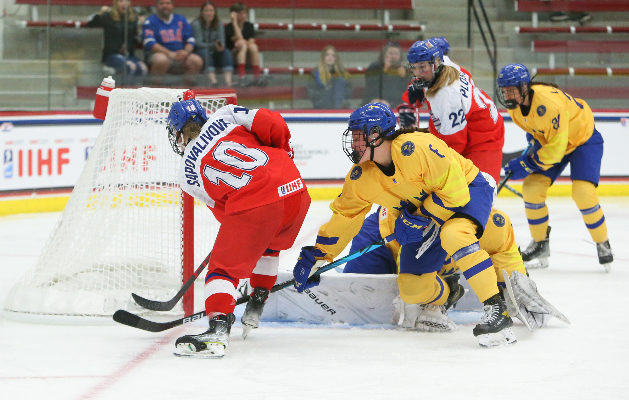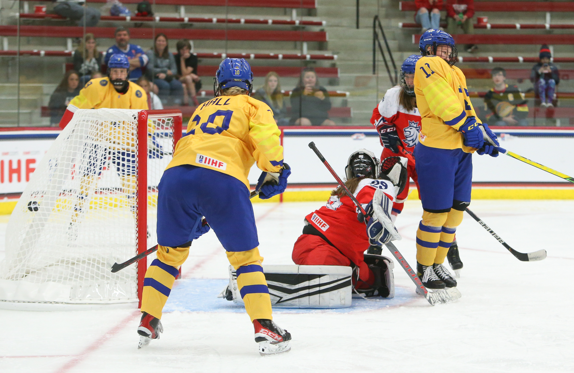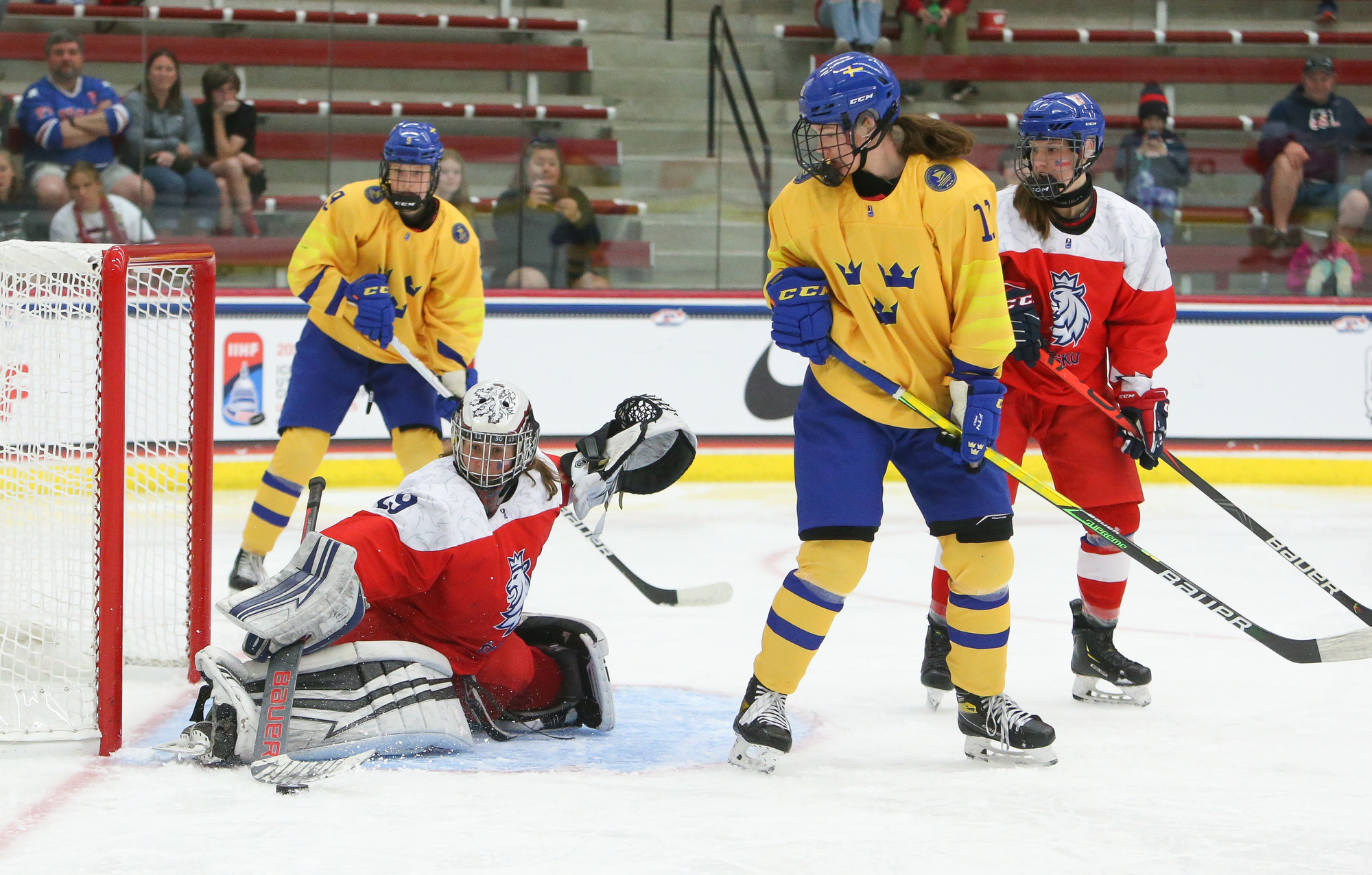 More Swedish penalties marked the start of the third, and the Czechs kept coming close as they mounted their push. With Astrid Lindeberg off for an illegal hit, Sapovalivova rang one off the iron, and Jonsson didn't bite on Plosova's dekes when she was left alone in front moments later.