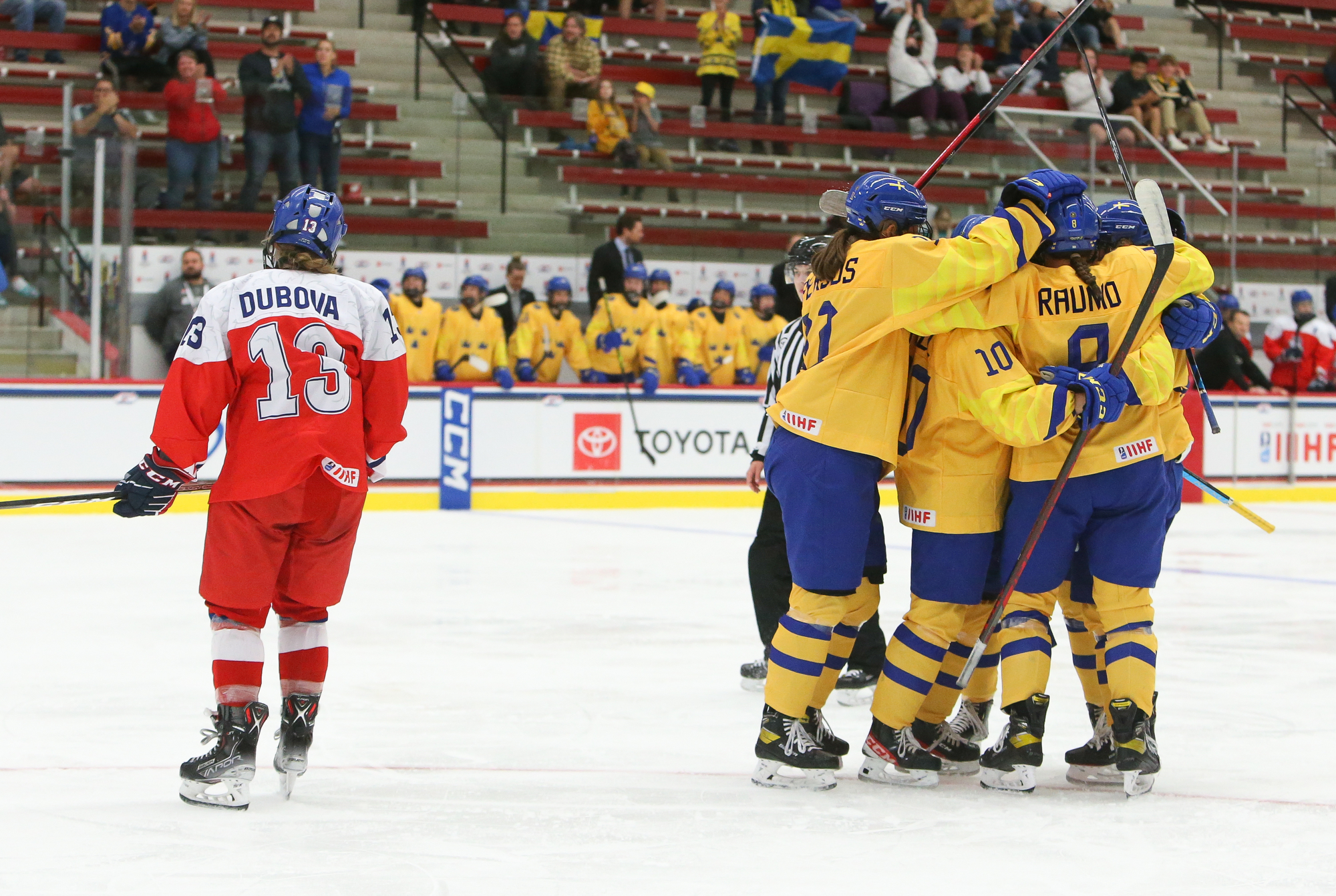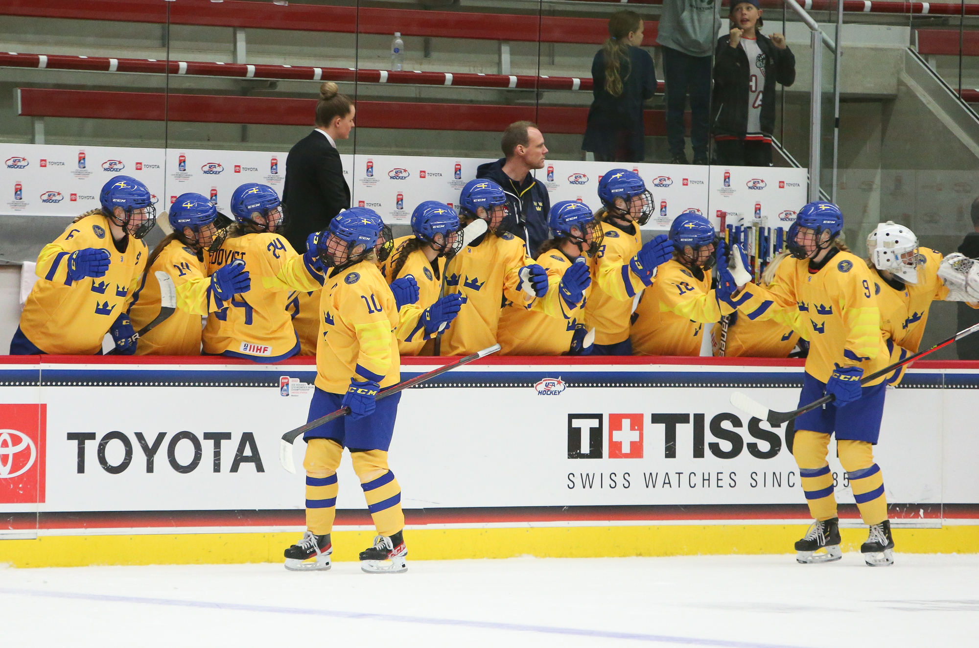 The Swedish bench celebrates after a first-period goal by captain Nicole Hall (#10) in a 2-1 quarter-final win over Czechia at the 2022 U18 Women's Worlds.
