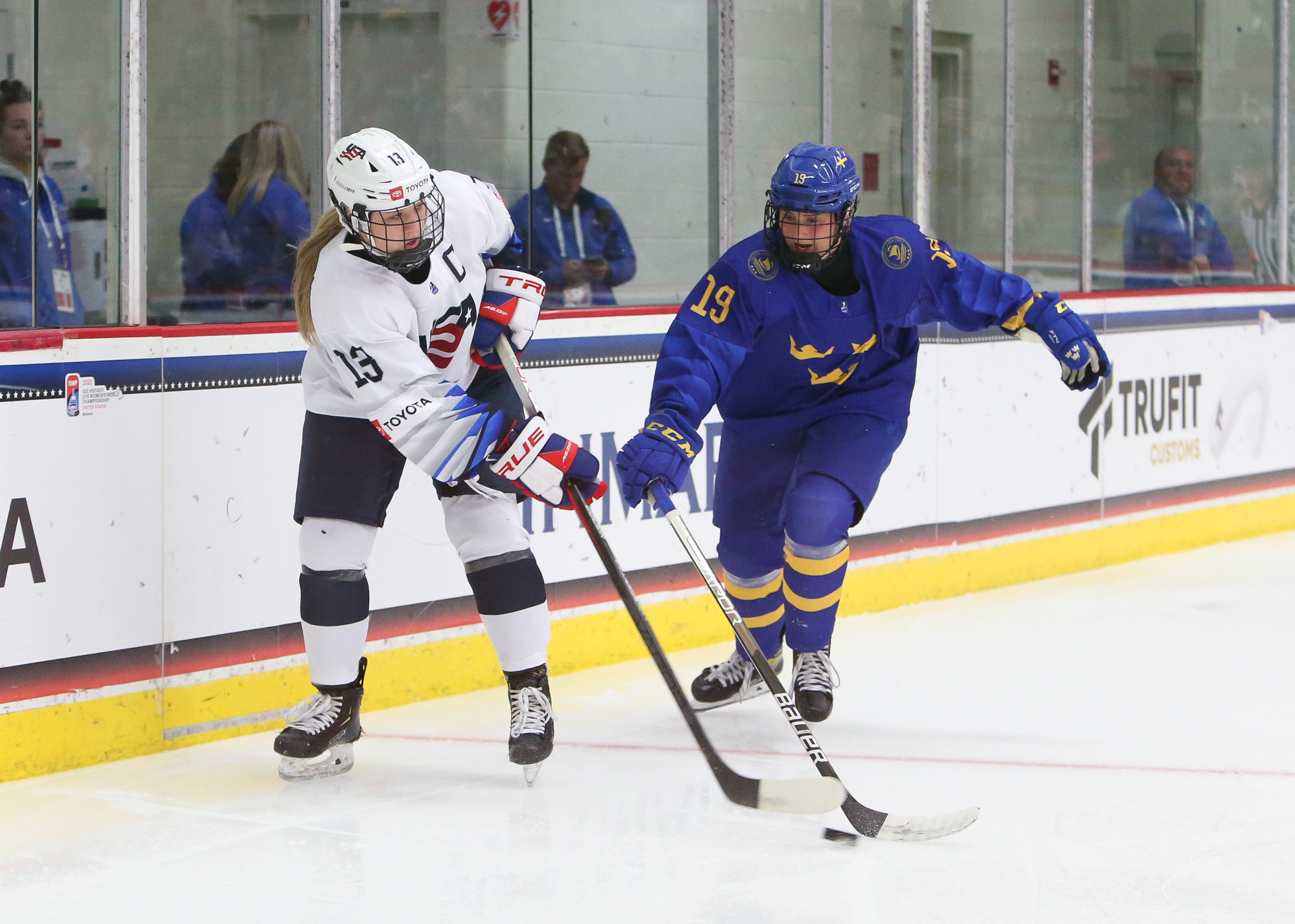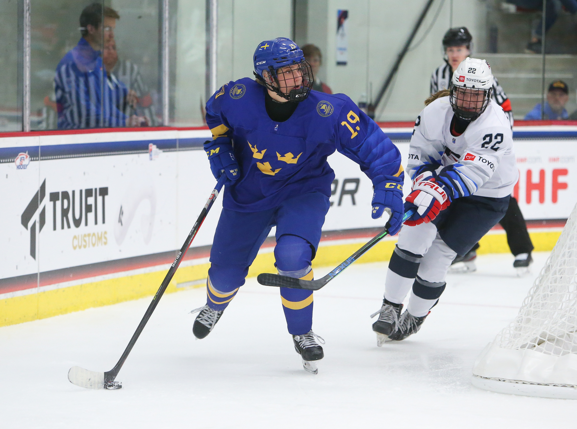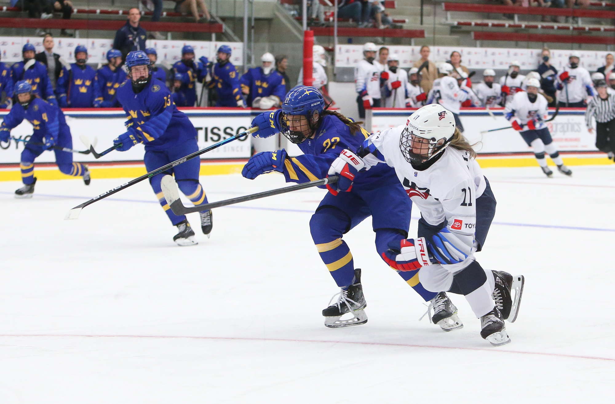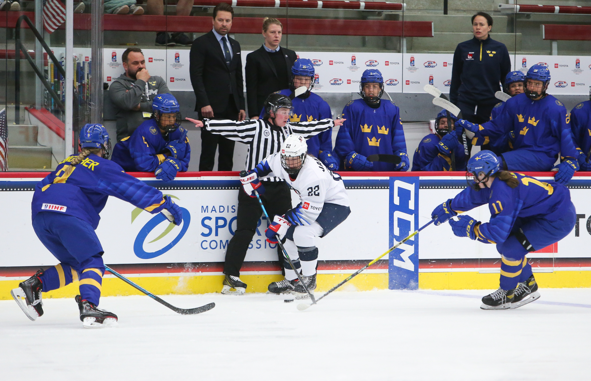 The host Americans are one win away from capturing consecutive U18 Women's Worlds titles. On Sunday, despite struggling to stay out of the penalty box, they rallied to defeat Sweden 3-2 to move on to the 2022 gold medal game versus archrival Canada.
